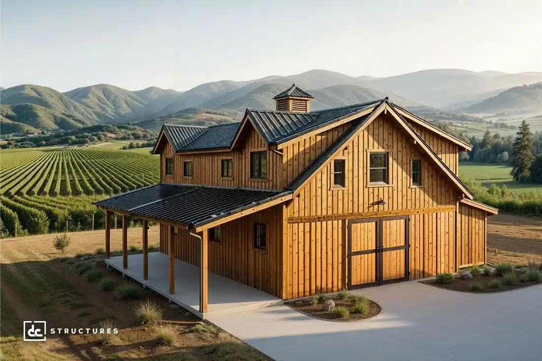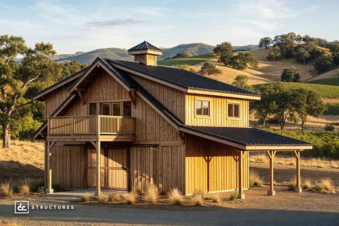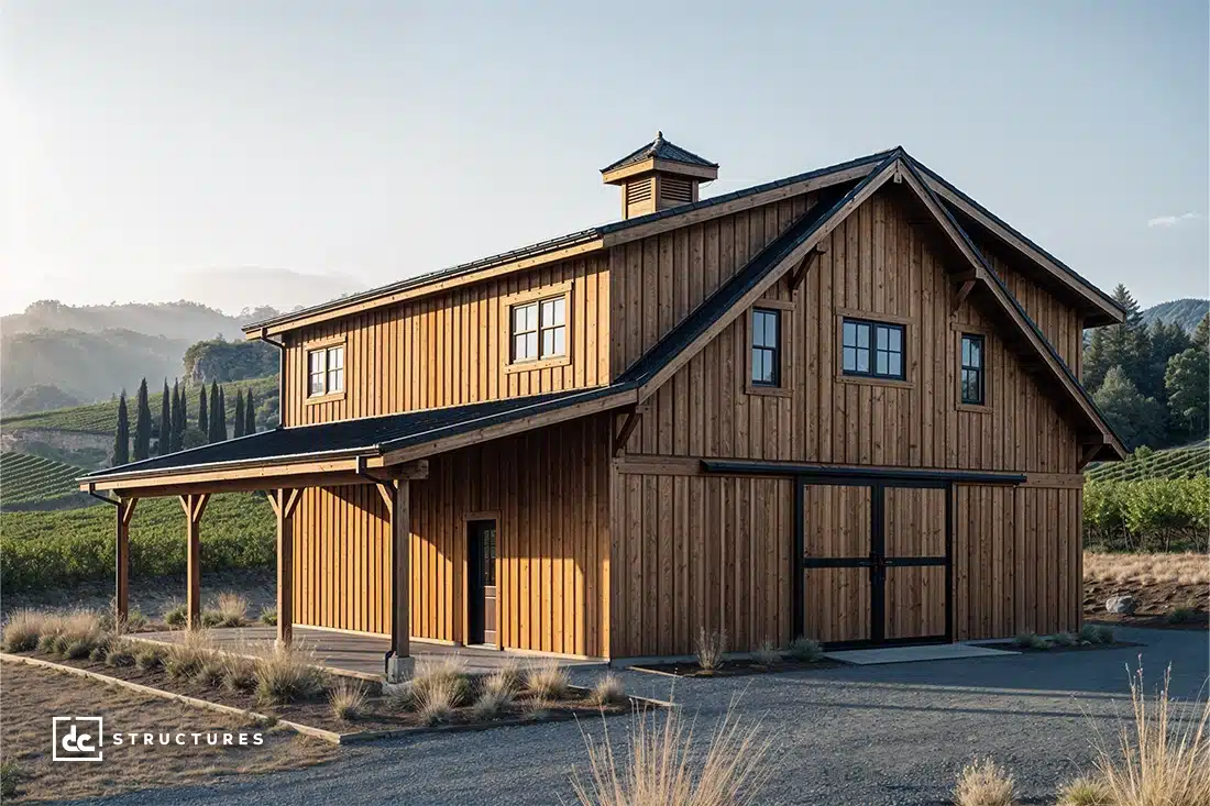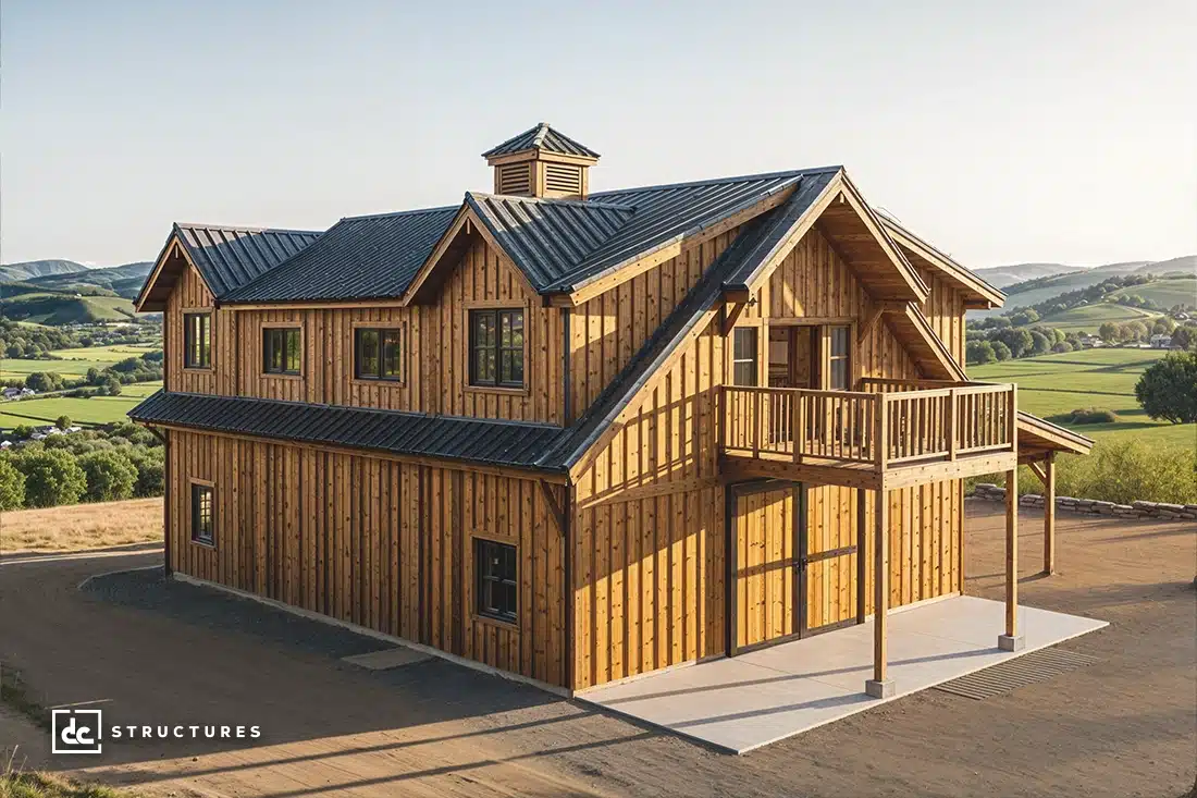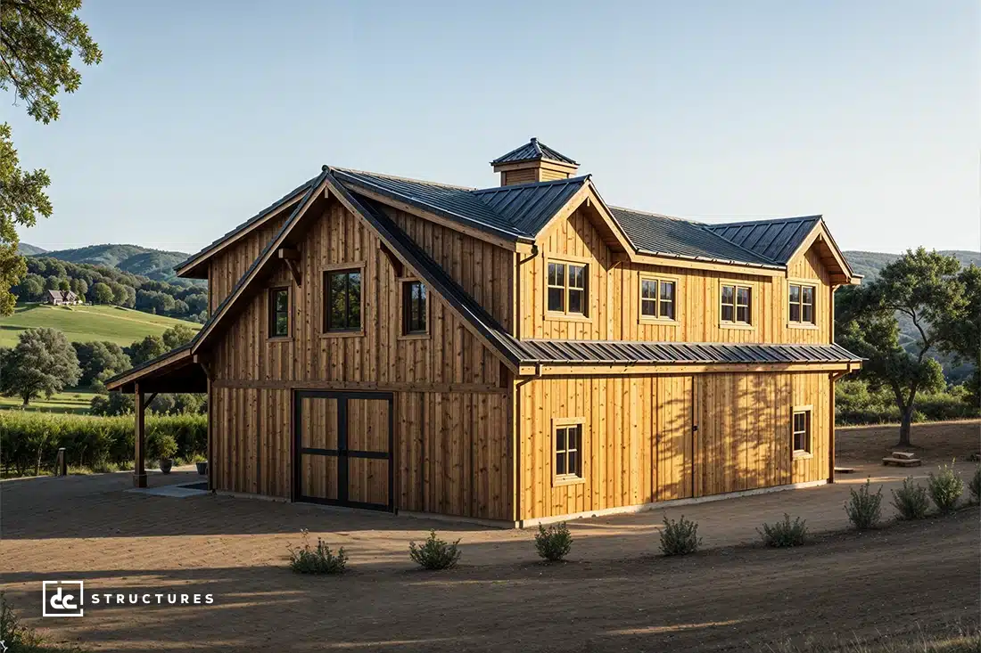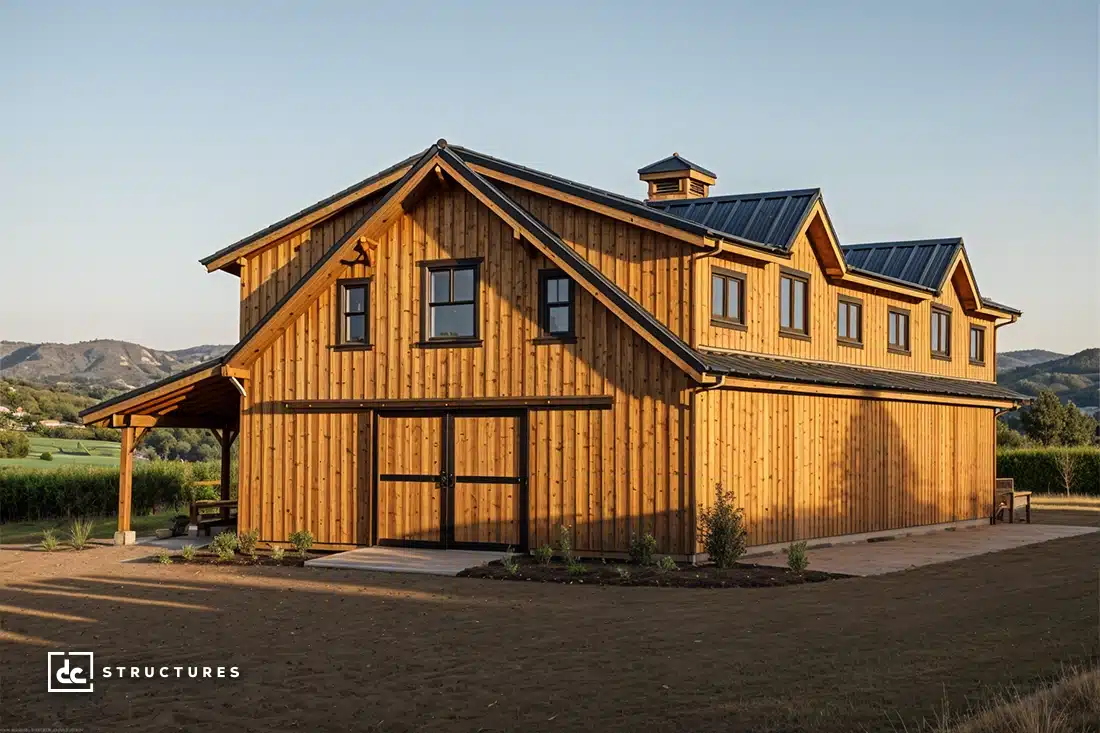Our most popular barn with living quarters, the Oakridge is a customizable model that blends classic charm with modern functionality. Framed with high-grade Douglas fir timbers and glulam beams, this versatile two-story design works beautifully as a horse barn, a garage or workshop, or a home with vaulted living space above.