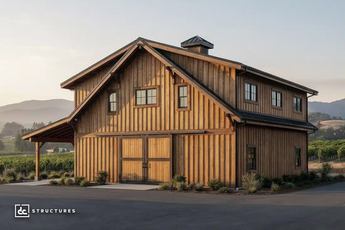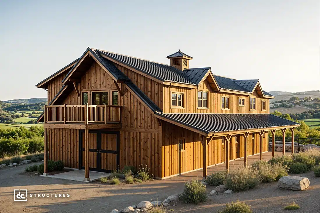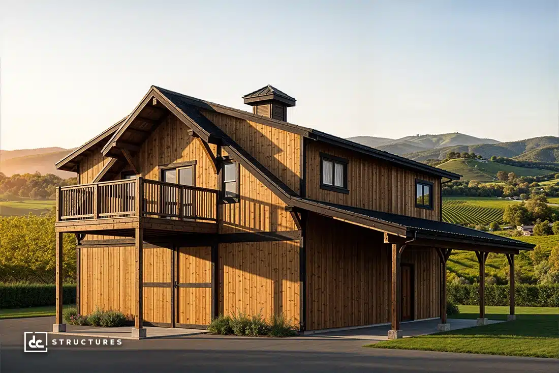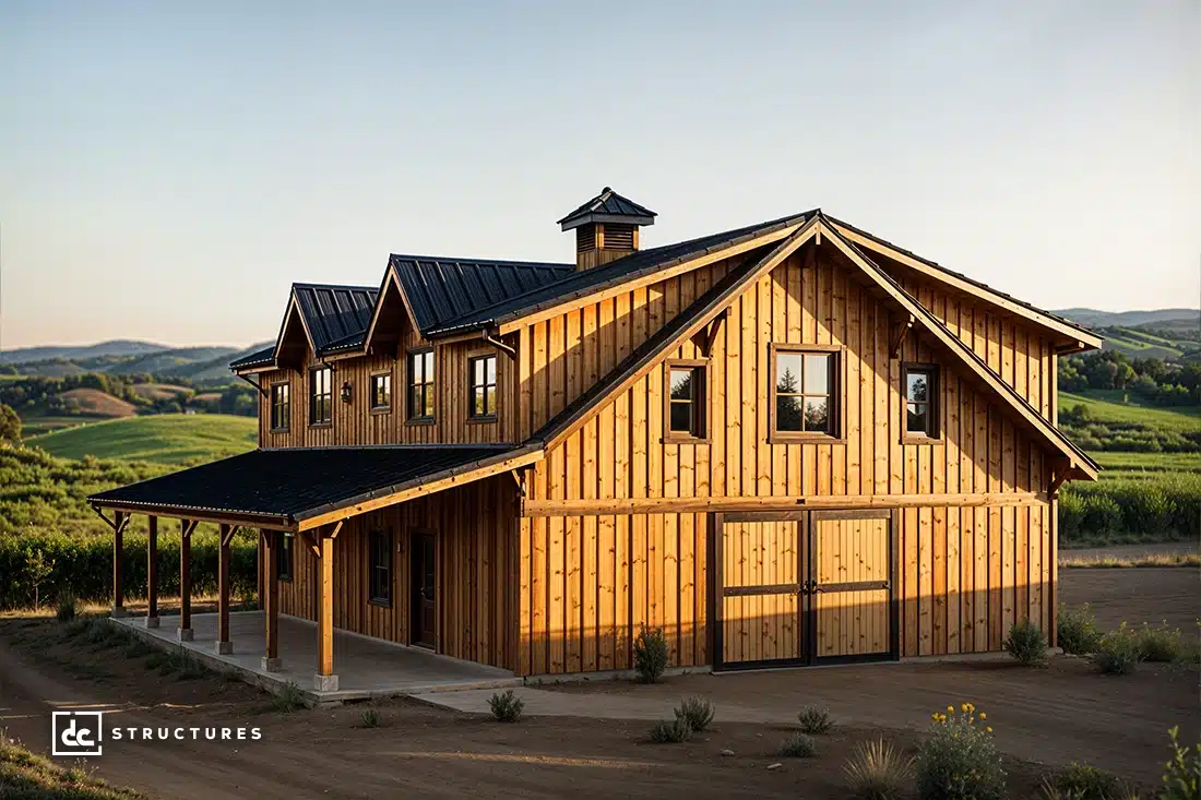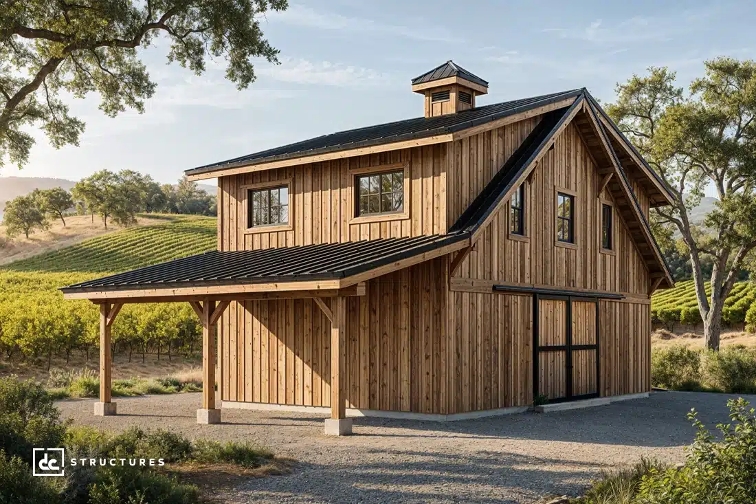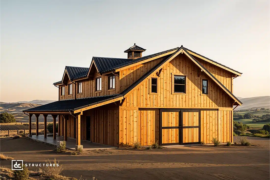 Our most popular barn with living quarters, the Oakridge is a customizable model that blends classic charm with modern functionality. Framed with high-grade Douglas fir timbers and glulam beams, this versatile two-story design works beautifully as a horse barn, a garage or workshop, or a home with vaulted living space above.