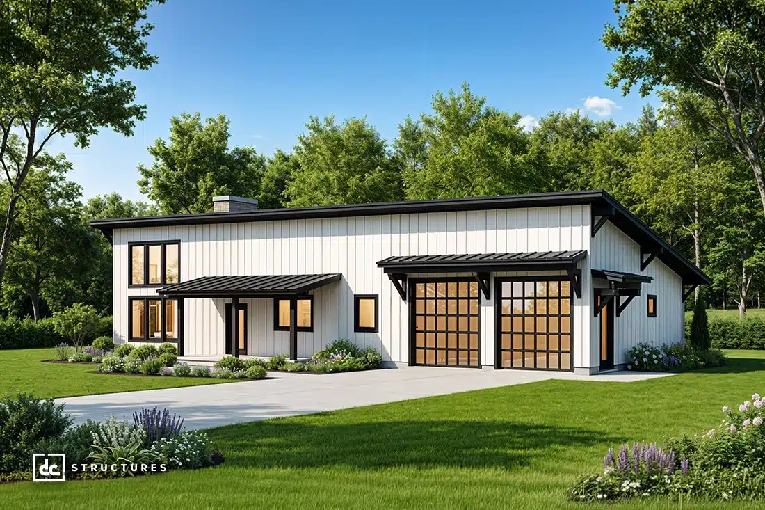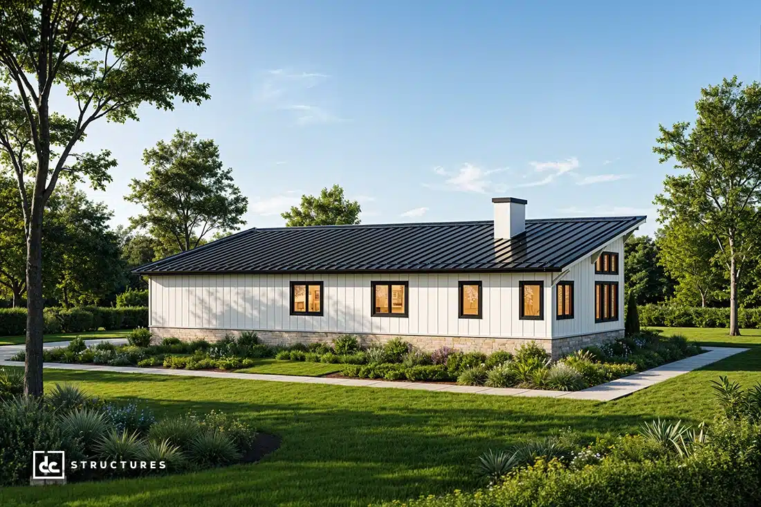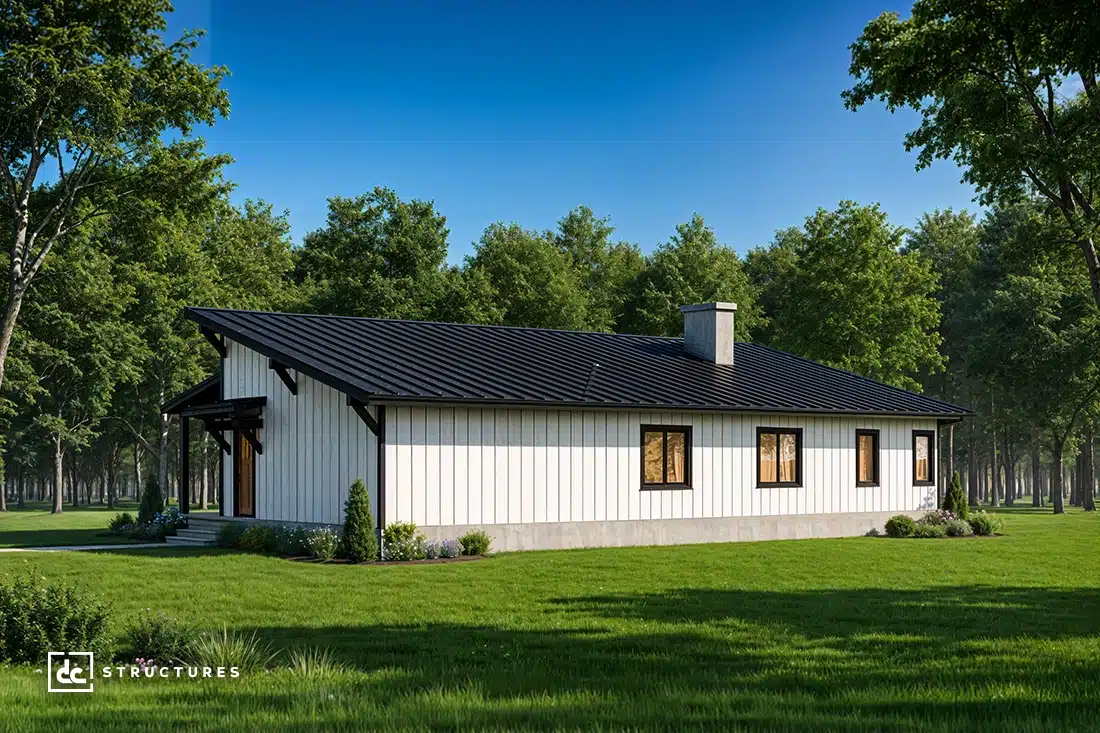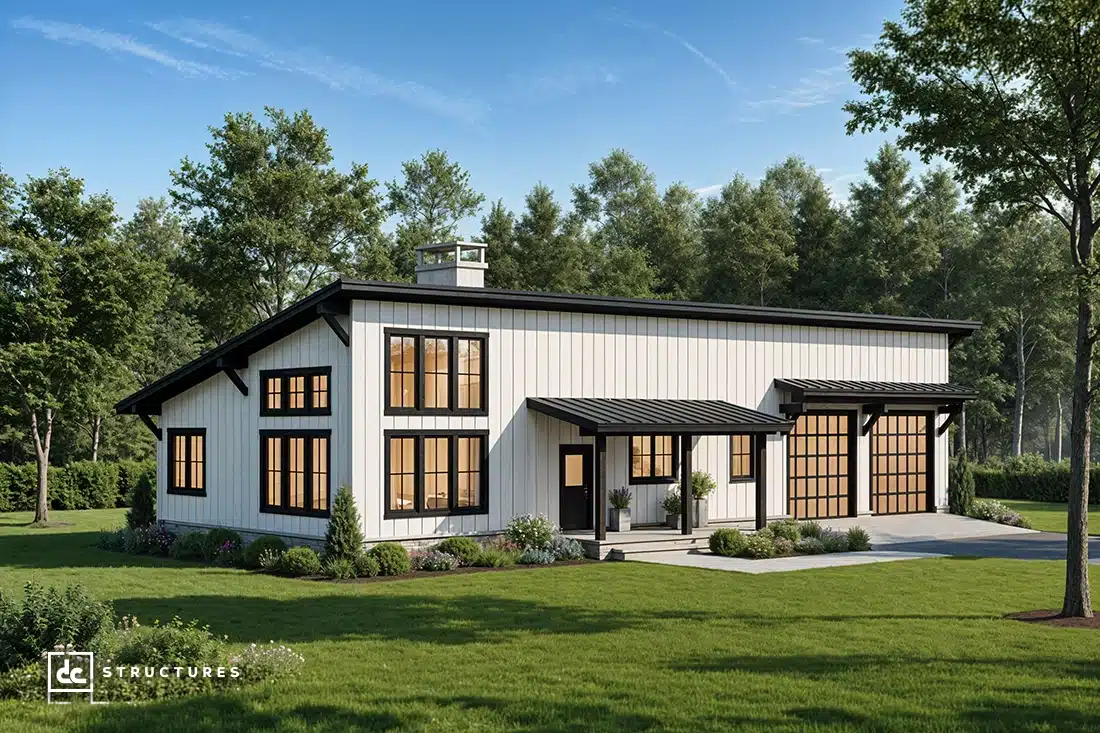Perfect for families, creatives, and business owners, our Caldwell Modern Barndominium Kit is a versatile design with endless applications. This pre-engineered building model features a three-bedroom, two-bathroom floor plan but can be customized to suit your specific vision for a barndominium investment.
