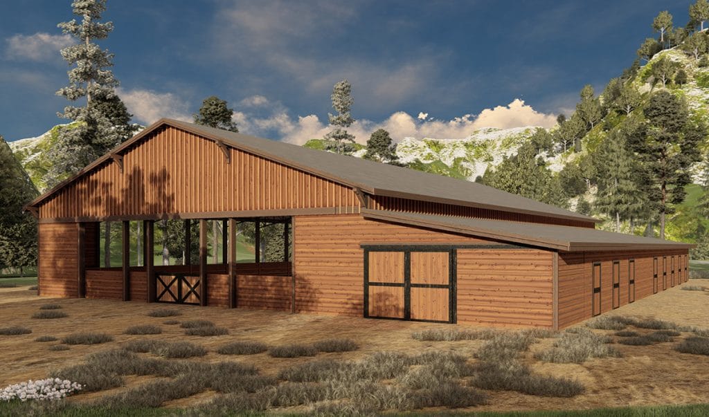 This covered riding arena kit includes a post and beam stable perfect for horse stalls or vehicle and equipment storage.