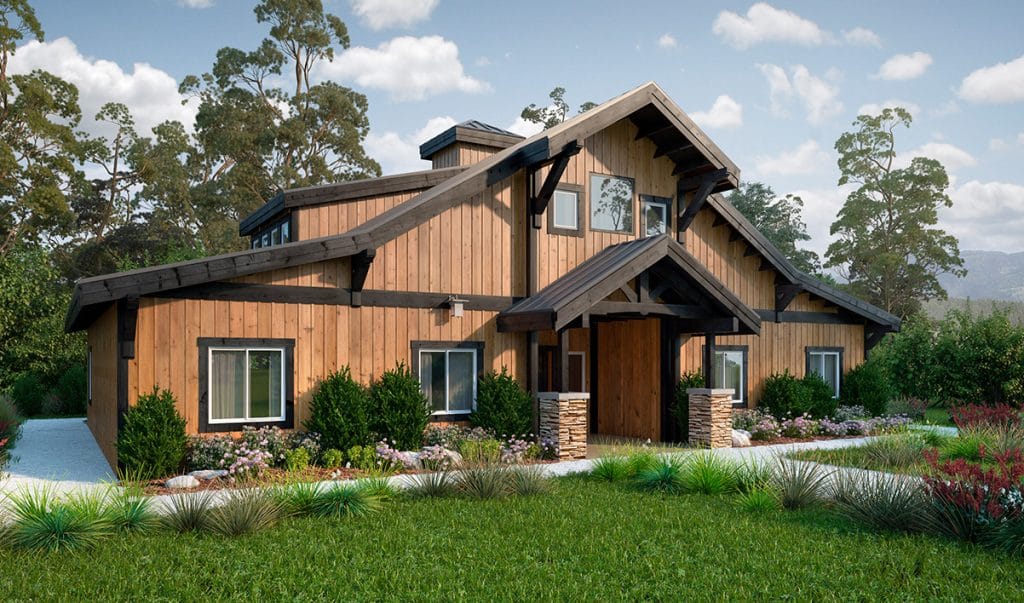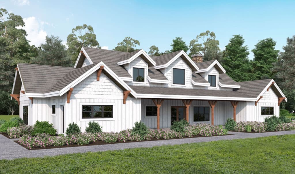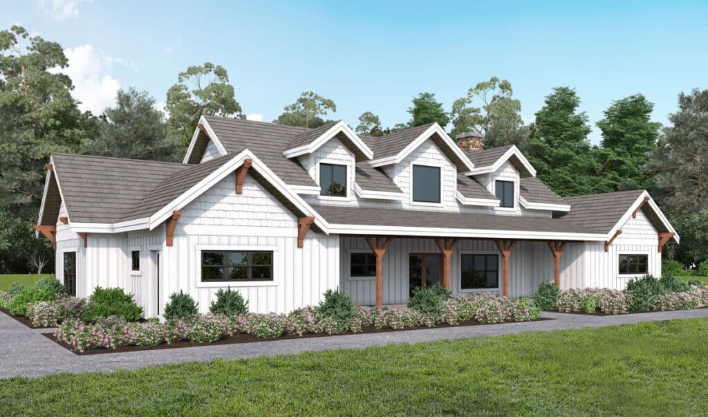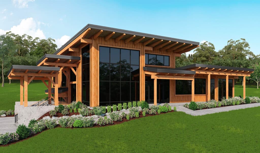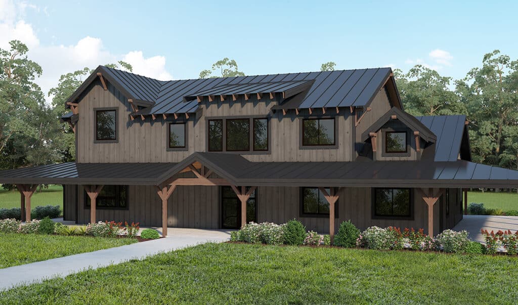 This single-story timber frame home package is a three-bedroom, two-and-a-half-bathroom design with tons of outdoor living space.