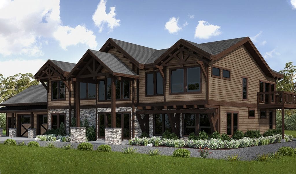 This four-bedroom, three-and-a-half-bathroom plan with a three-car attached garage is our largest timber frame home kit.