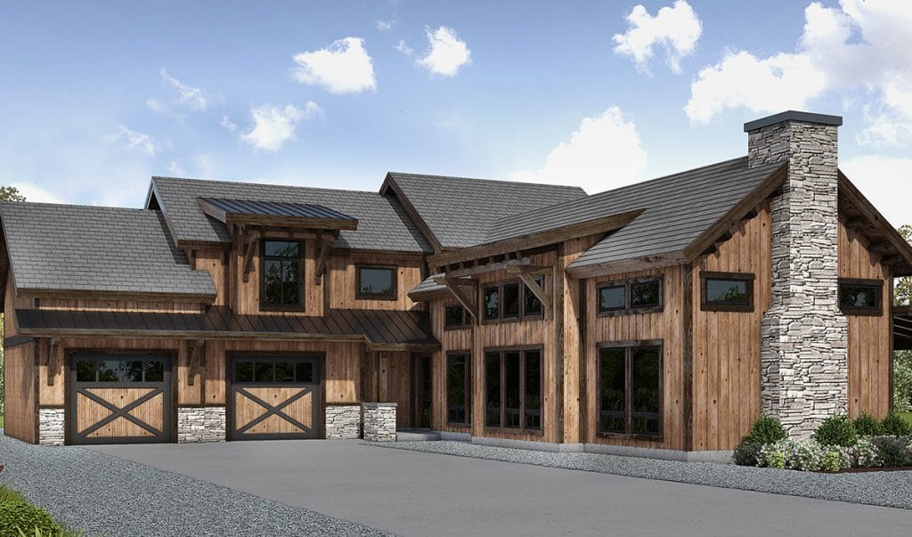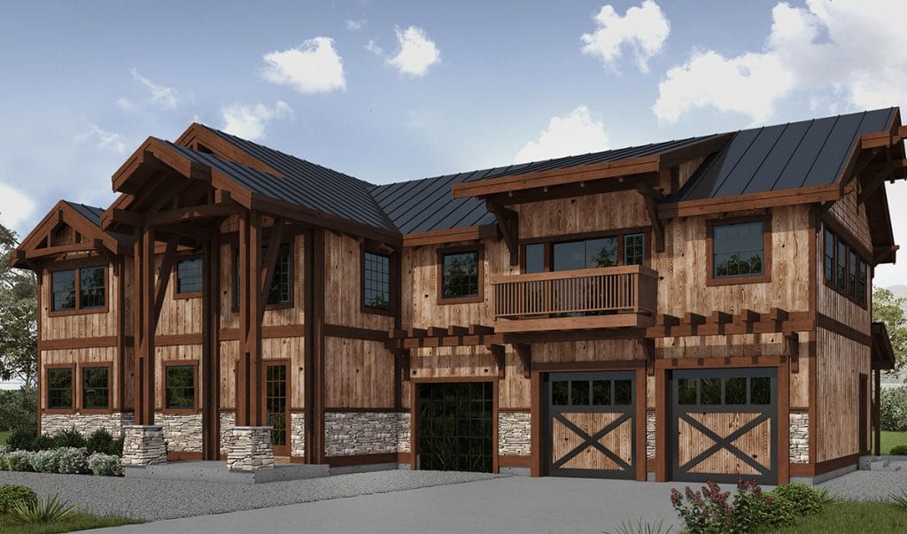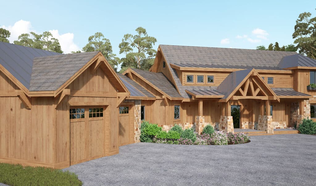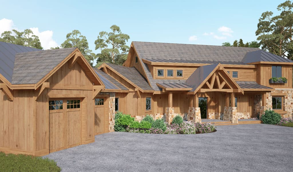 This captivating timber frame home design includes three bedrooms, two-and-a-half bathrooms, and a two-car garage.