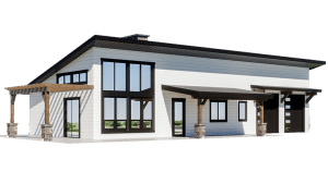 Designed with parallel chord roof trusses, this single-sloped cabin design offers a compact, eco-friendly floor plan defined by its tall ceilings and beautiful window walls.