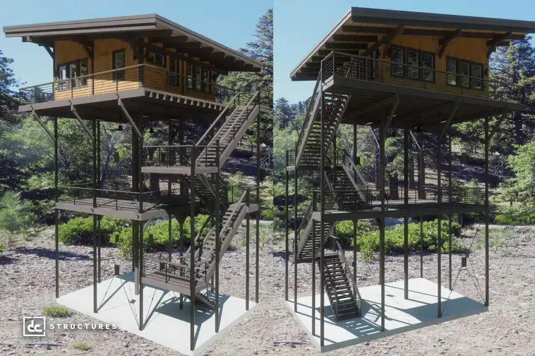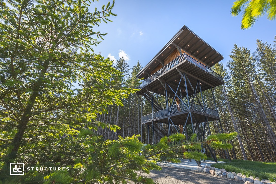 Standing at over 56 feet high, this custom lookout tower and treehouse in Sandy, Oregon, is one of four structures we designed for these clients. Its three-story design towers over the property, providing our clients with stunning, tree-lined views of nearby Mt. Hood National Forest.