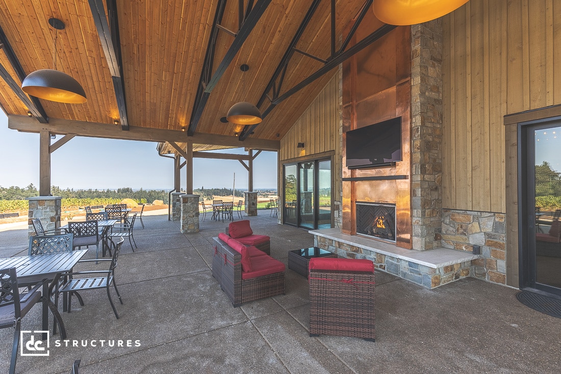 Located on a 600-acre farm in Silverton, Oregon, this tasting room features a warm and luxurious aesthetic complemented by exposed steel trusses, a copper-plated fireplace, and dome pendant lighting.