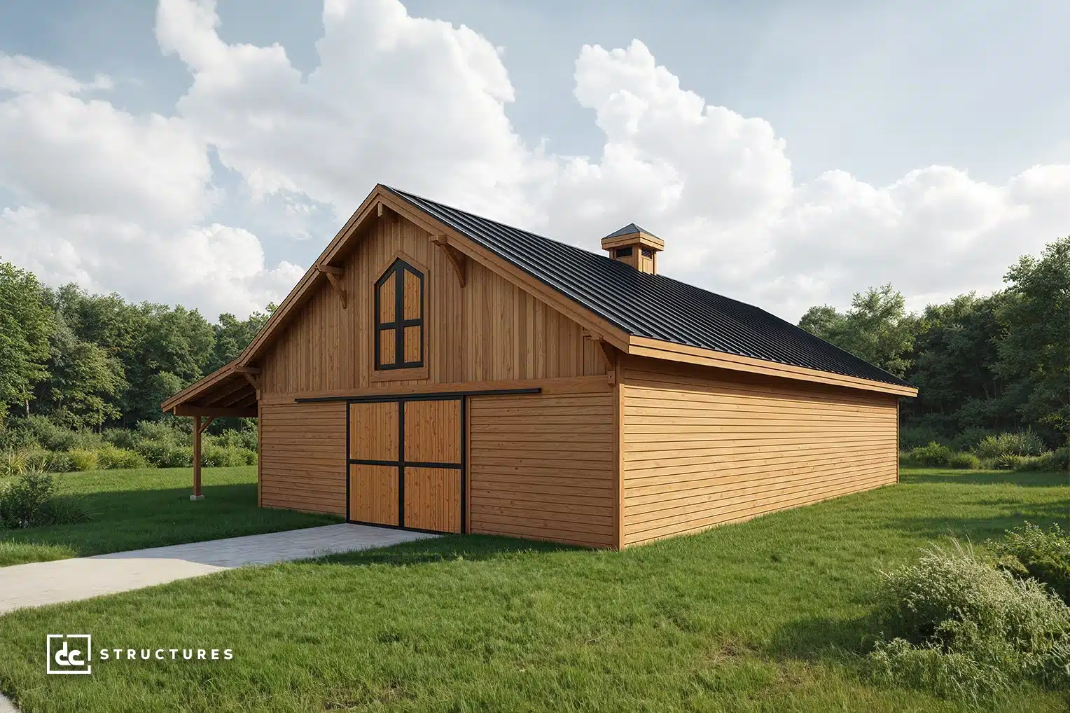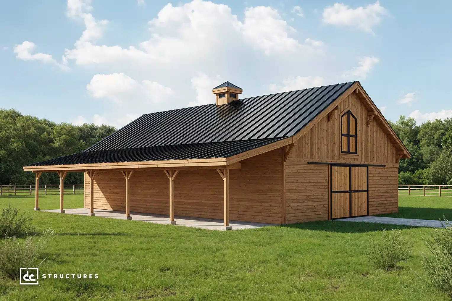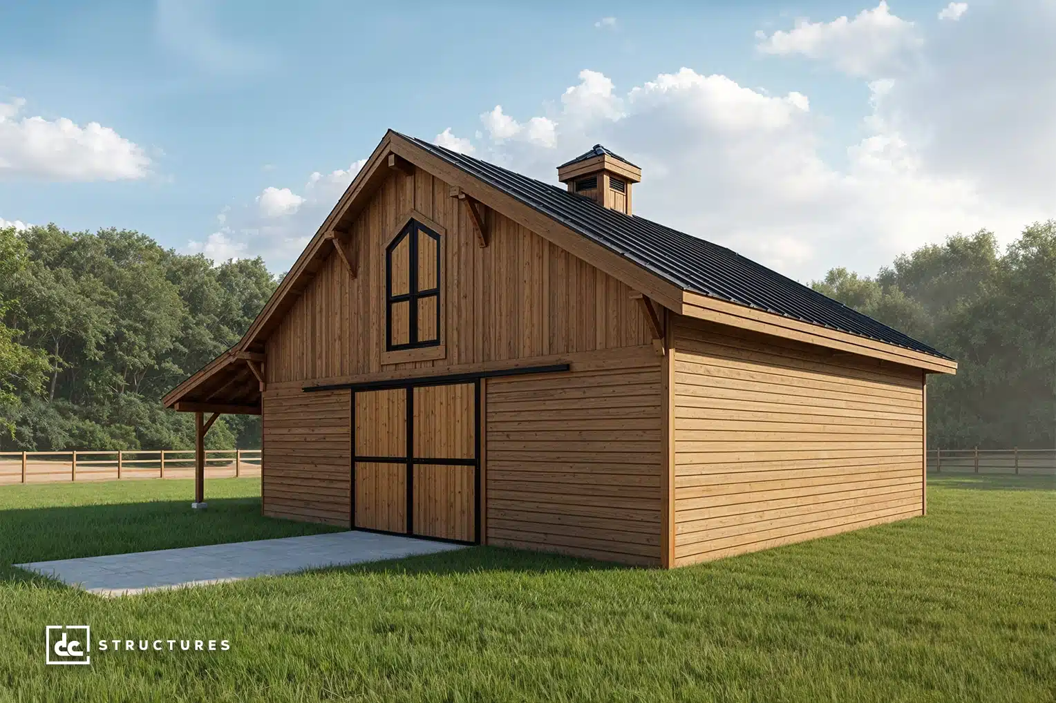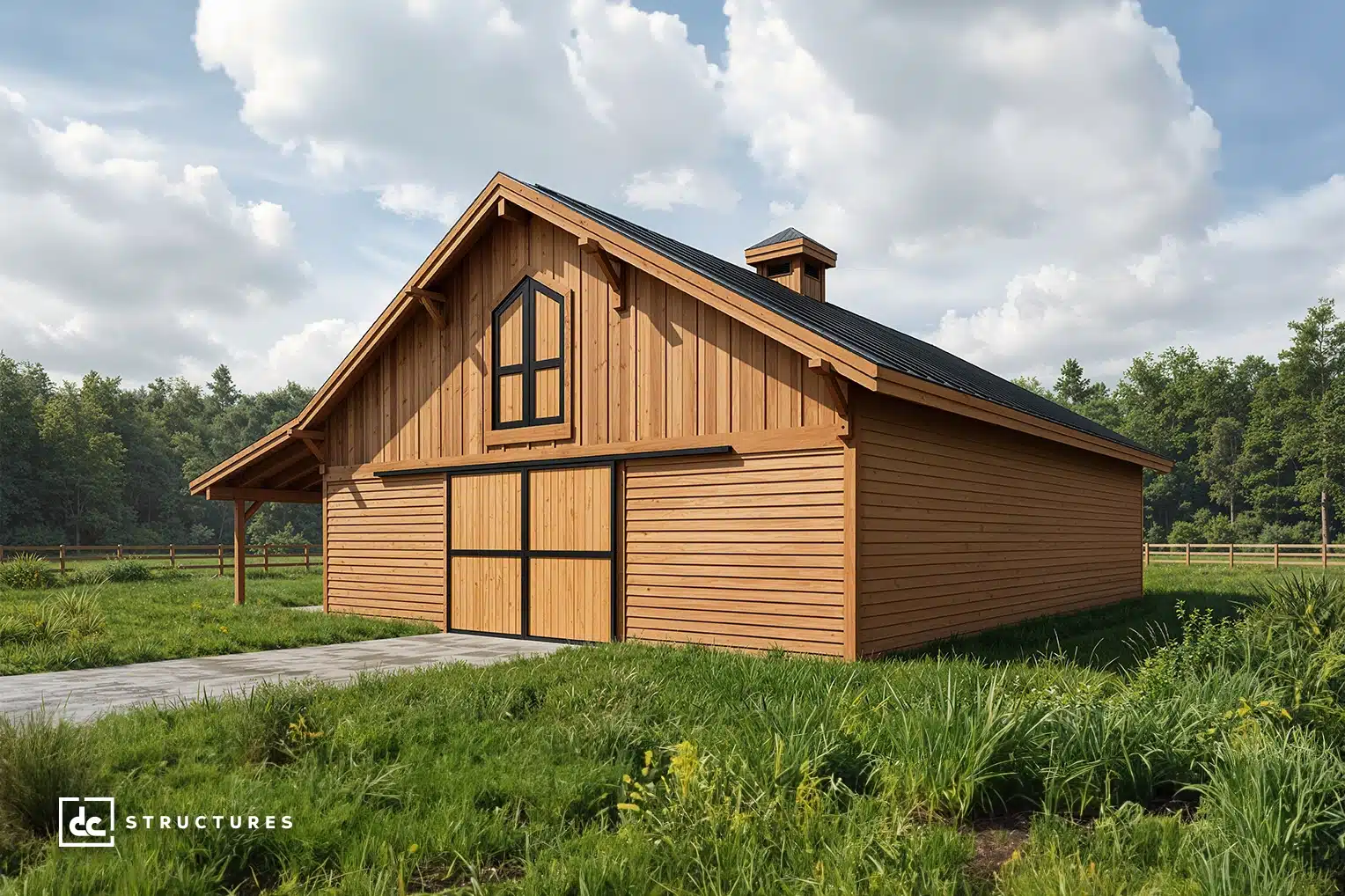 The Columbia 48′ offers a spacious main level with a 12′ breezeway and standard center-aisle loft, accommodating up to eight horse stalls. Its adaptable design works equally well as a workshop, studio, garage, or multi-use facility.