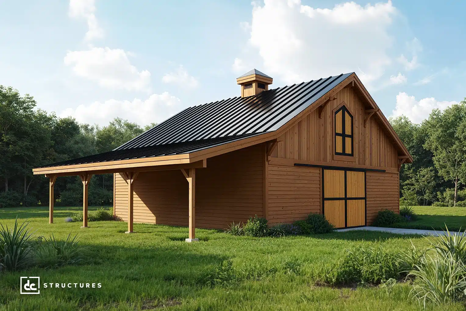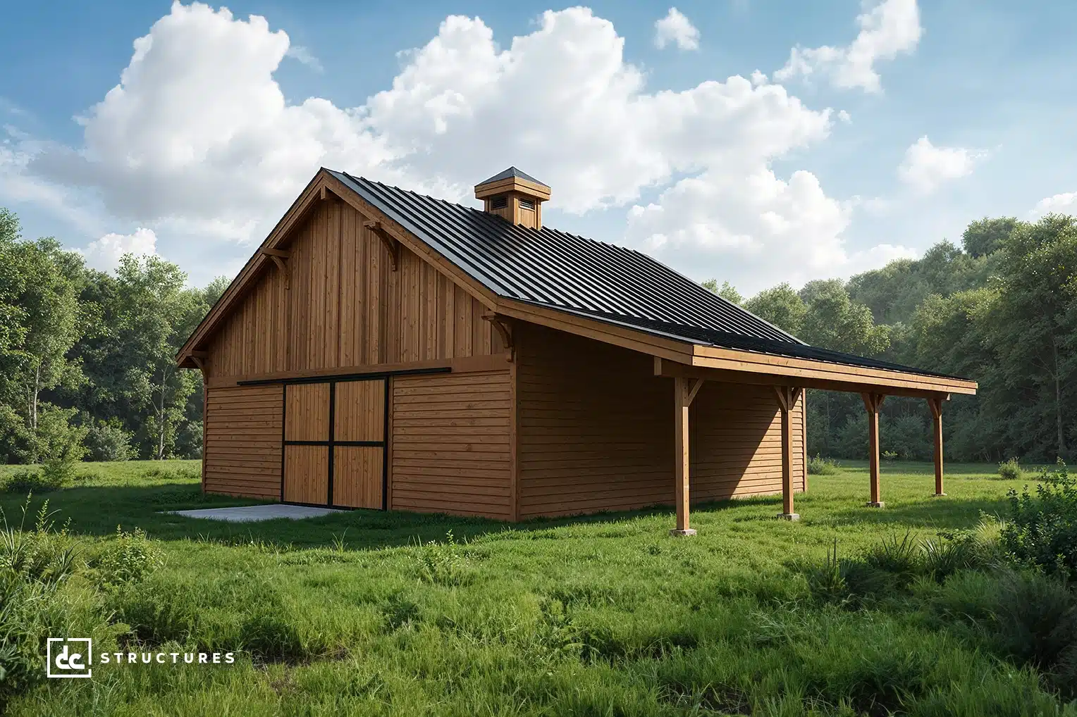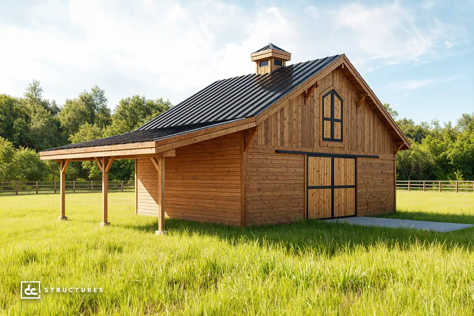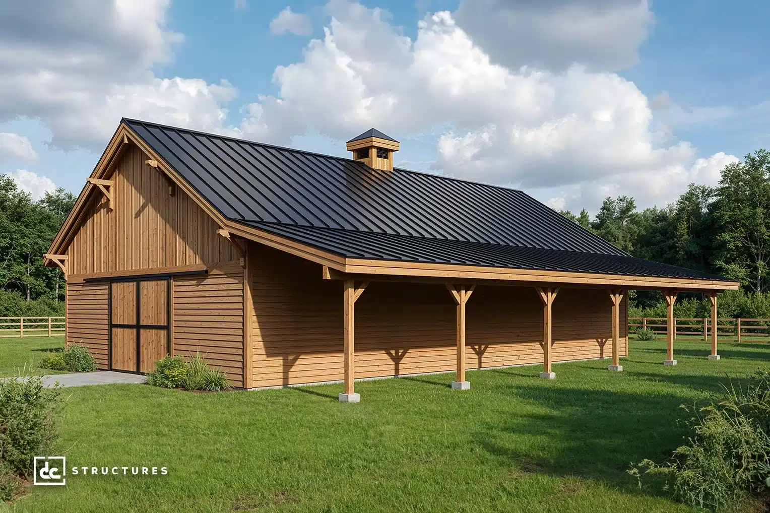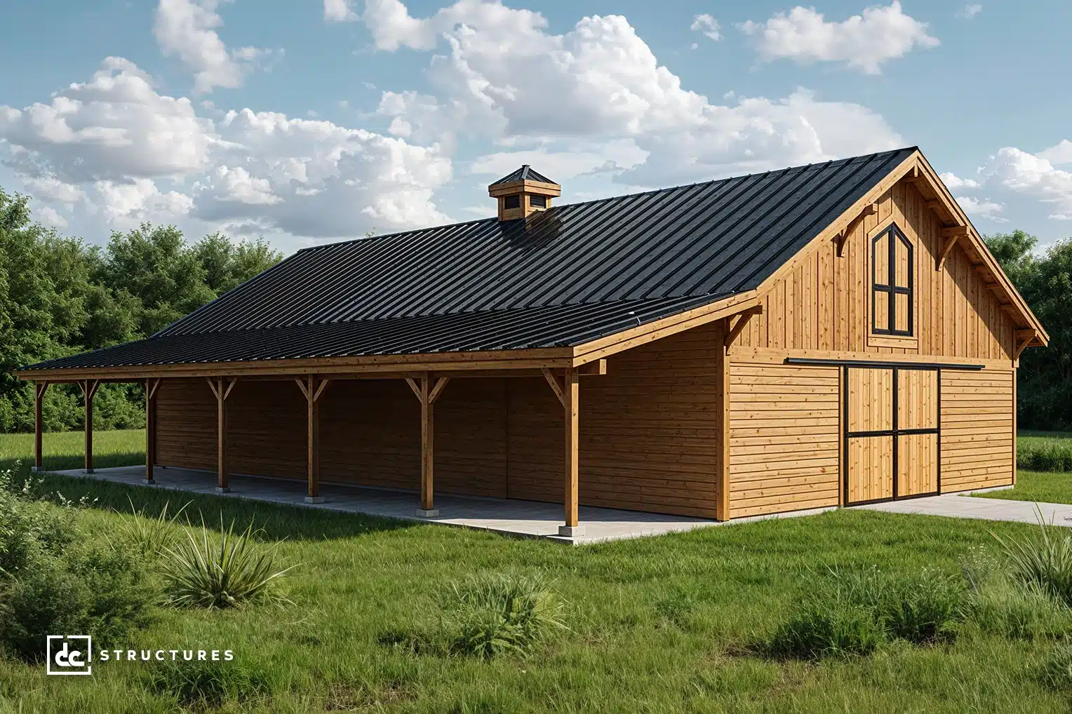 The Columbia 48′ offers a spacious main level with a 12′ breezeway and standard center-aisle loft, accommodating up to eight horse stalls. Its adaptable design works equally well as a workshop, studio, garage, or multi-use facility.