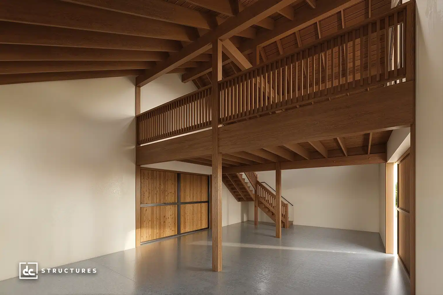 Loft with T&G sheathing, cedar railing, 4’ stair package