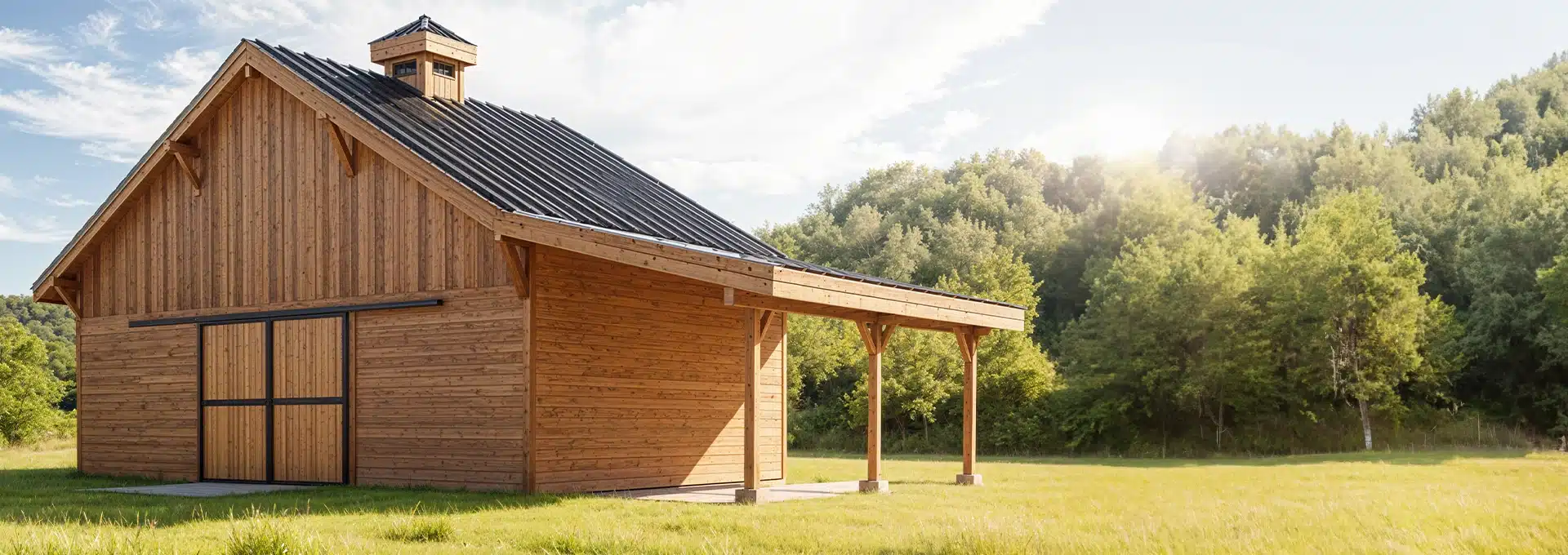 A wooden barn with a black metal roof stands in a grassy field, surrounded by green trees under a sunny, partly cloudy sky.