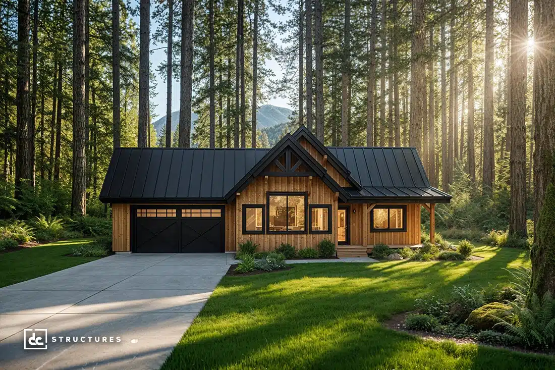 The Cottonwood is a compact three-bedroom, two-bathroom cabin that maximizes every square foot. Its open-concept living space flows to a covered porch, perfect for enjoying your morning coffee or hosting evening gatherings, while a 484 sq. ft. garage keeps vehicles and gear protected. Featuring sturdy timber rafters and a flexible interior, the Cottonwood is equally suited for a family home, guest retreat, or vacation rental.