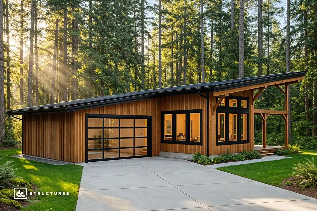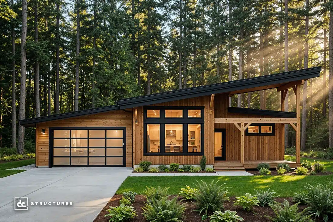 This modern take on our Cottonwood kit features a single sloped roofline that creates a dramatic covered entryway. Inside, an open living space surrounded by window walls makes a bright and enjoyable seating area, with timbers overhead adding warmth and elegance to the interior.