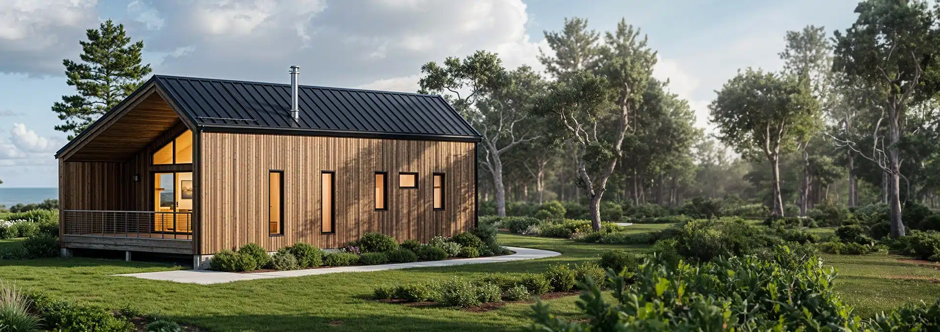 The Gearhart Cabin Kit offers a contemporary twist on our Bandon model, with a dramatic roof pitch, window walls, and sloped ceilings that fill the home with light. Two bedrooms, two bathrooms, and a generous covered patio and entry spaces pair with a post-free interior you can customize to match your vision.