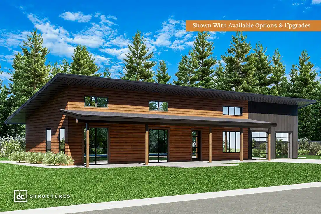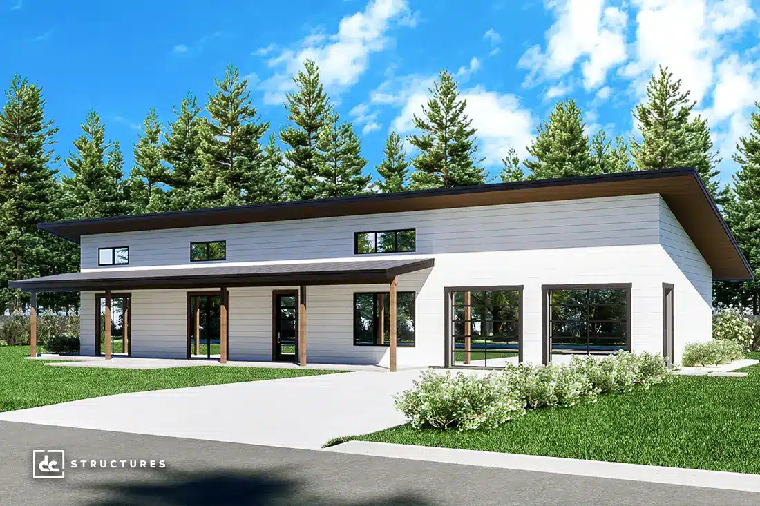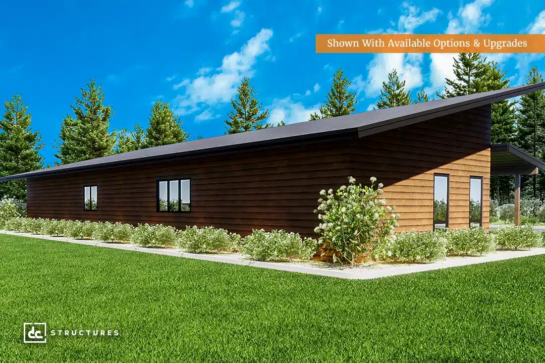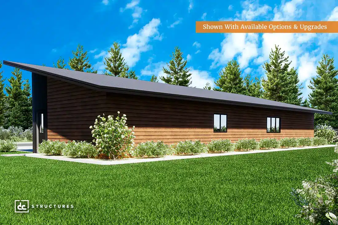 This modern barndominium design is characterized by its single-slope roof, large picture windows, and integrated outdoor living spaces. This building model features a 1,333 sq. ft. living space and a 587 sq. ft. garage, creating a cozy, contemporary home that brings the outdoors in.
