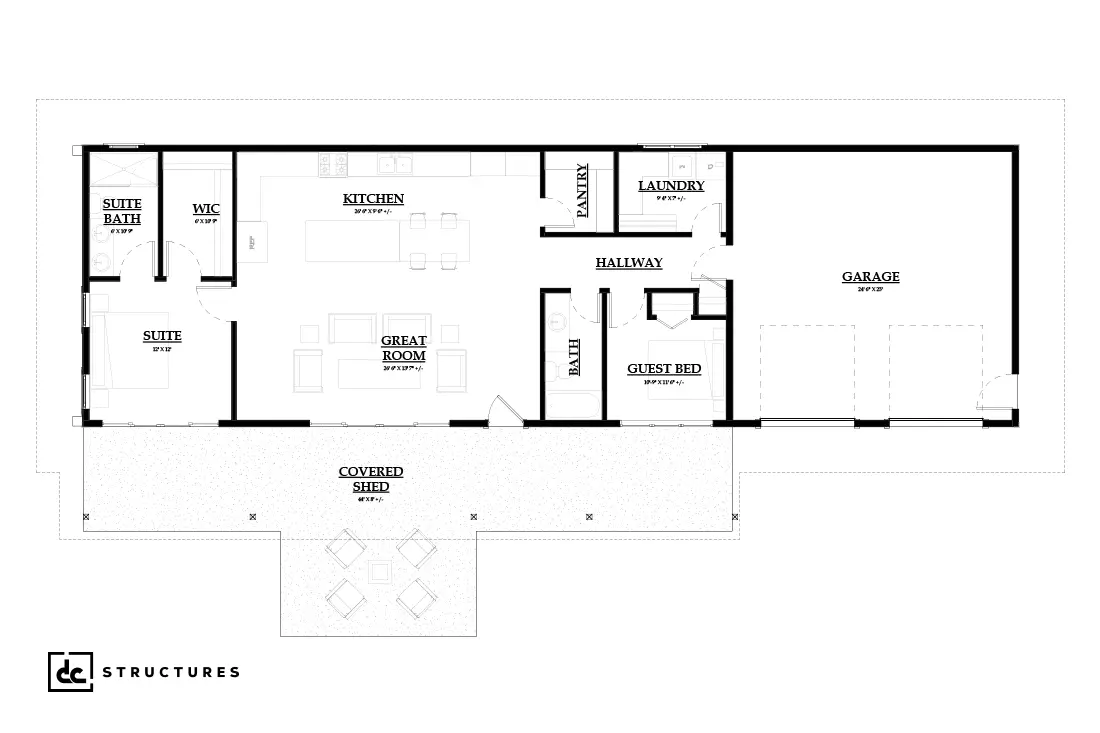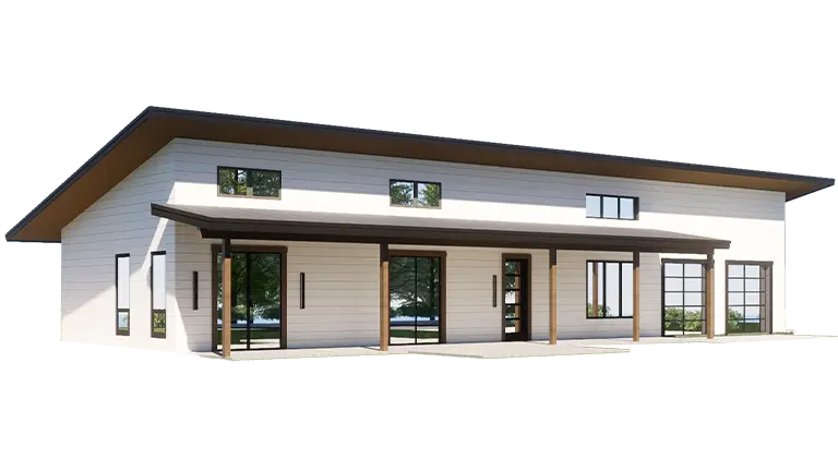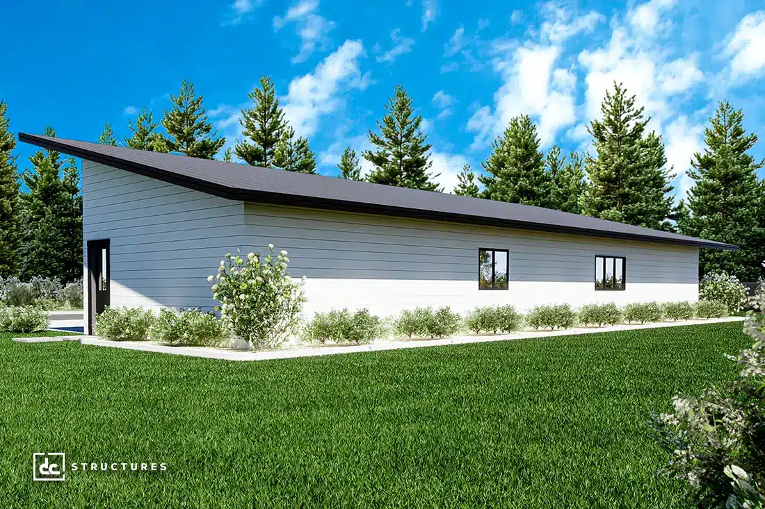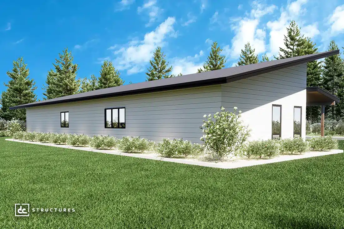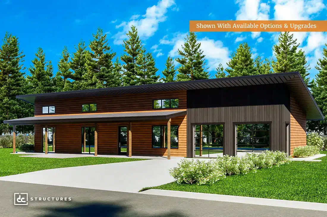 This modern barndominium design is characterized by its single-slope roof, large picture windows, and integrated outdoor living spaces. This building model features a 1,333 sq. ft. living space and a 587 sq. ft. garage, creating a cozy, contemporary home that brings the outdoors in.