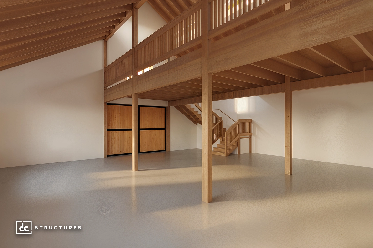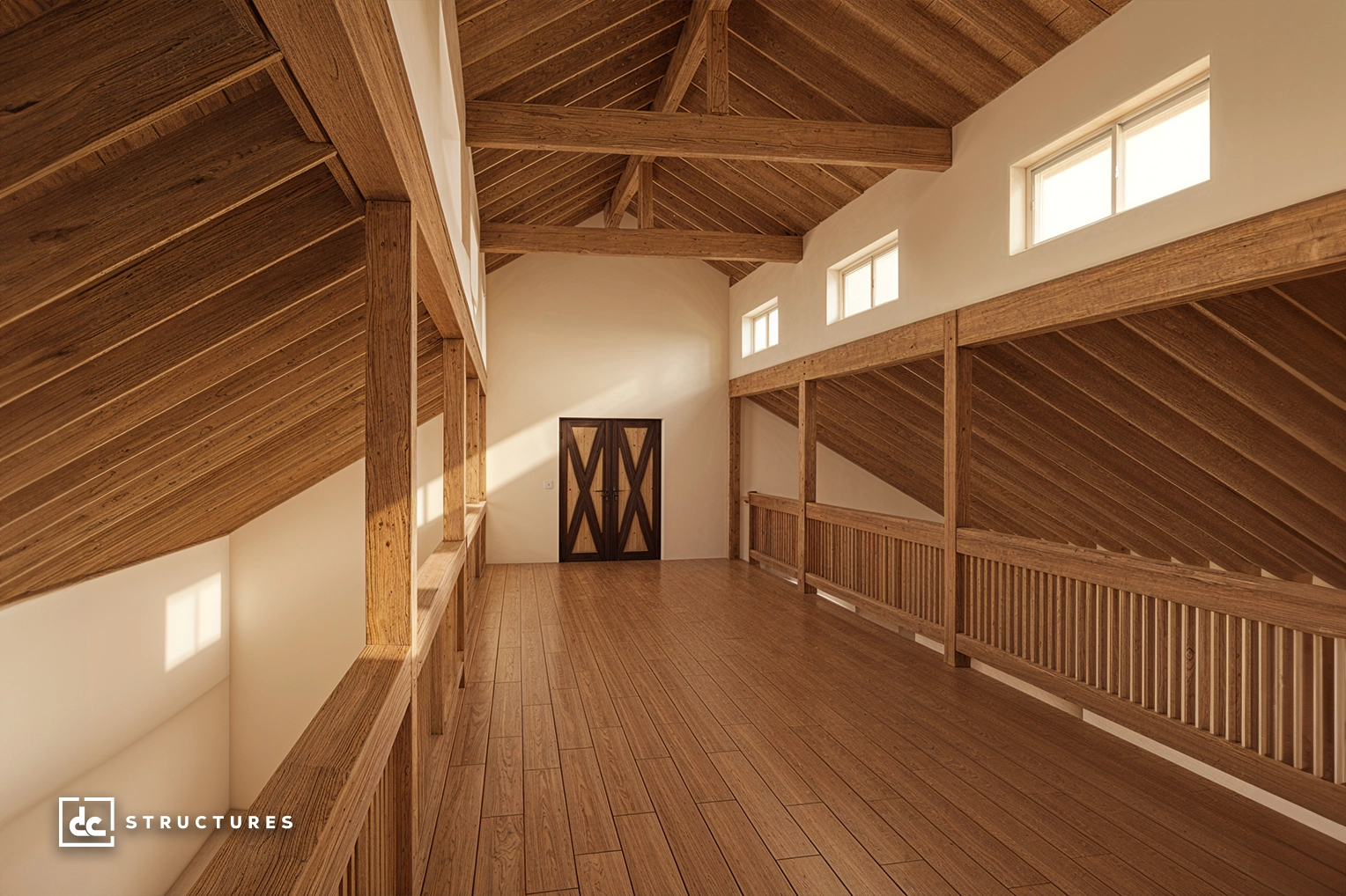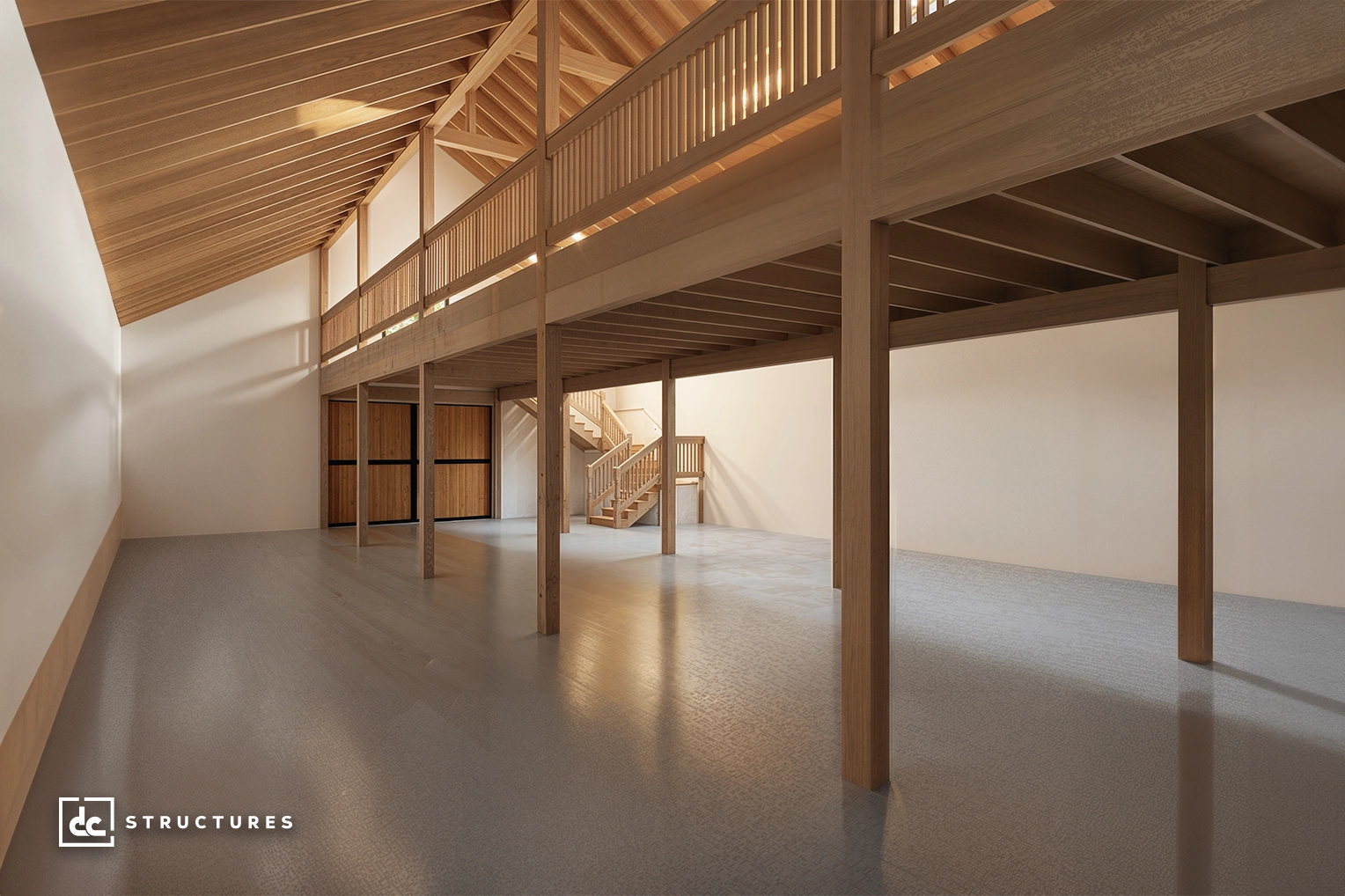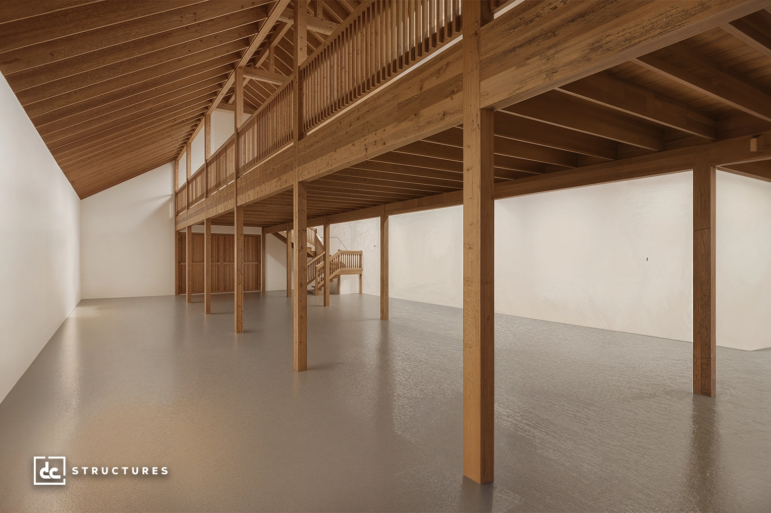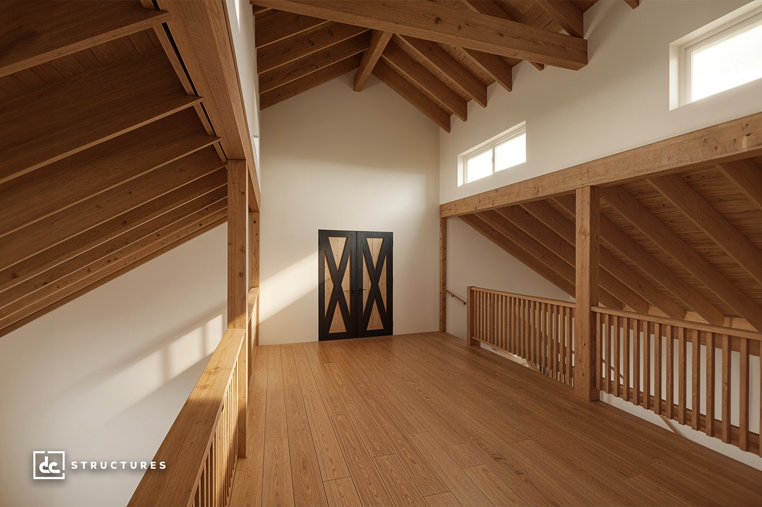 Center aisle loft, Douglas fir loft beams, 2” x 12” loft joists, T&G floor sheathing, cedar handrail, and stair package