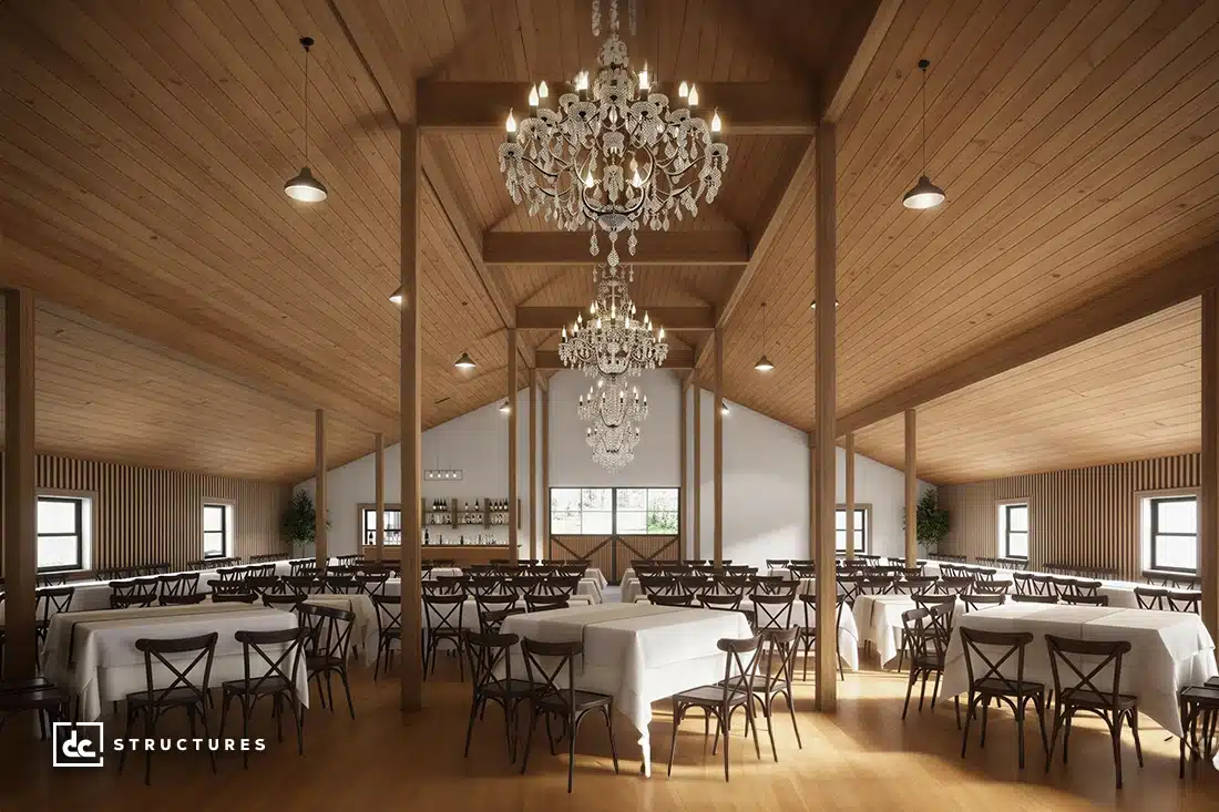 Framed with structural posts, this flexible floor plan allows easy customization for your space. From a prep kitchen and bar to bridal quarters, storage, and restrooms, you have the flexibility to add any amenities you need. With no load-bearing interior walls, this post and beam structure lets you adapt the interior to your exact specifications.