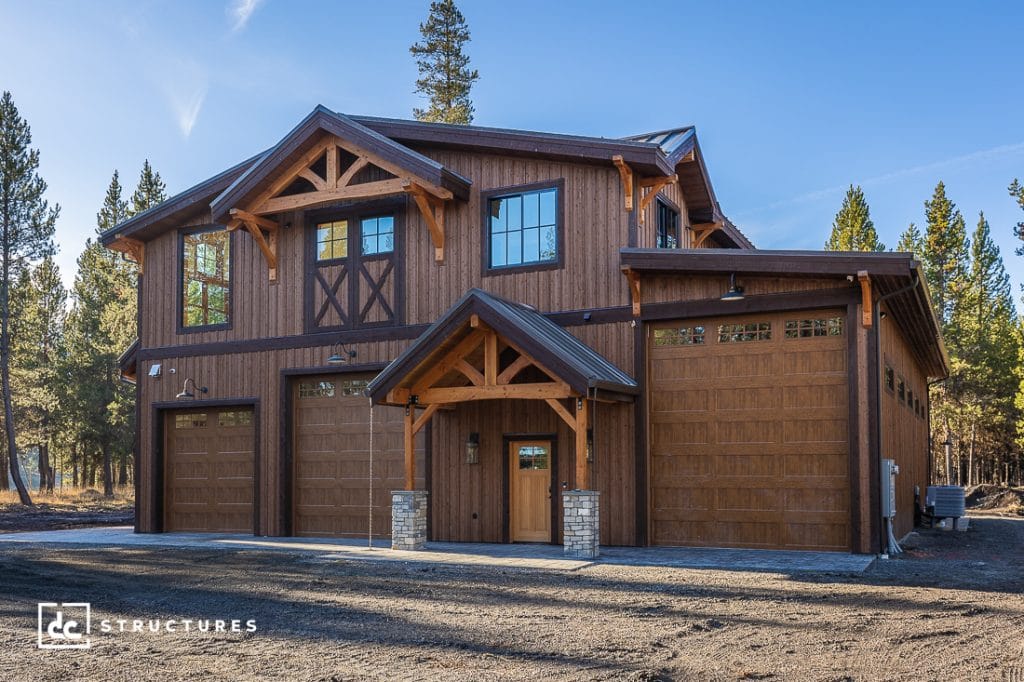 This post and beam structure was modified from our Shasta RV Barn Kit to serve as an RV garage and party barn in Bend, Oregon. To create extra storage space for their recreational vehicle, our clients added a 784 sq. ft. enclosed shed roof to the main level. They also added a 72 sq. ft. covered entry with a decorative heavy timber truss for visual appeal. The exterior is clad with cedar board and batten siding and features Andersen™ 100 Series windows with tempered glass and colonial window grids. On the second story, our clients opted for an Andersen™ A Series French door in place of our standard Andersen™ 100 Series sliding glass door.