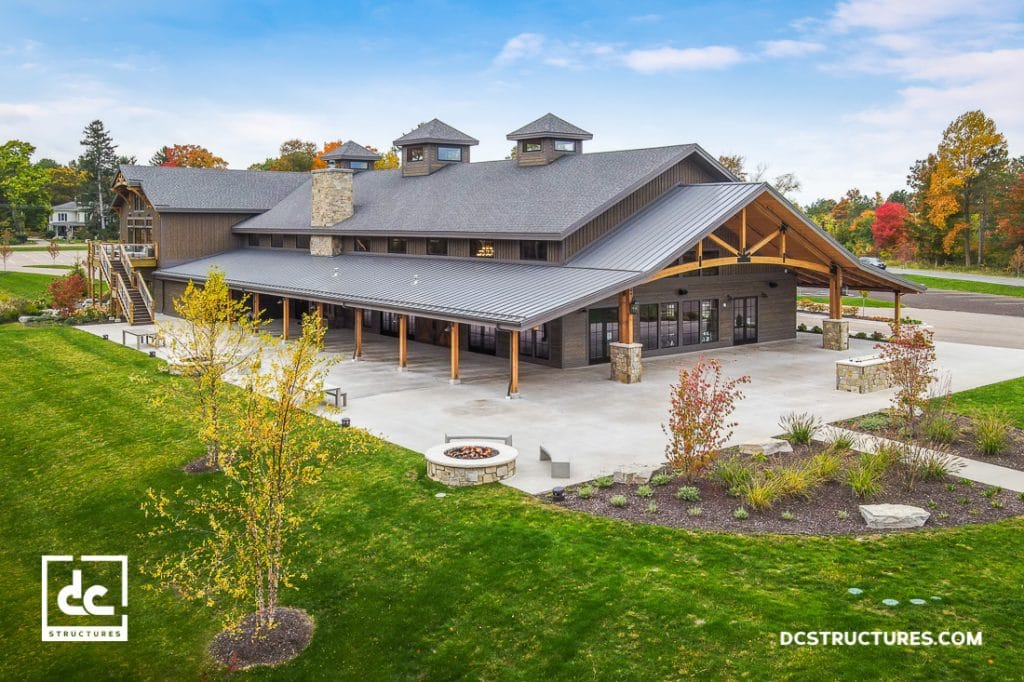 This timber frame wedding venue in Michigan is a fully custom commercial design from DC Structures. There are numerous unique features in and outside this venue, including custom arched timber trusses in the main hall, a large stone fireplace, and a two-story heavy timber covered entry. The interior is designed with tongue and groove ceiling material and windows with wood trim for a rustic effect while the exterior is clad with Woodtone Hardie™ Plank siding. Additionally, our clients choose to integrate custom chandeliers and dark wood stain in the main hall, giving the space an elegant yet intimate feel.