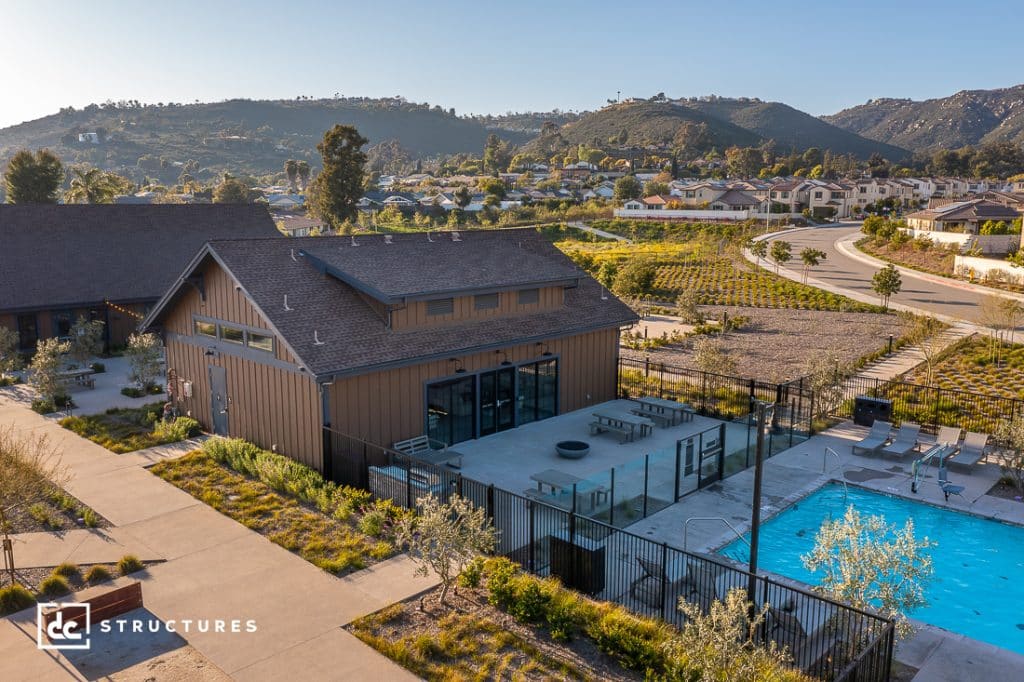 This custom pool house in Escondido, California, makes up one-third of a brand-new commercial development we completed for Wedgewood Weddings. Using the Columbia Gable Barn Kit as a starting point, our team adapted this one-of-a-kind pool house for their property, with this structure providing every necessity for visitors and staff.