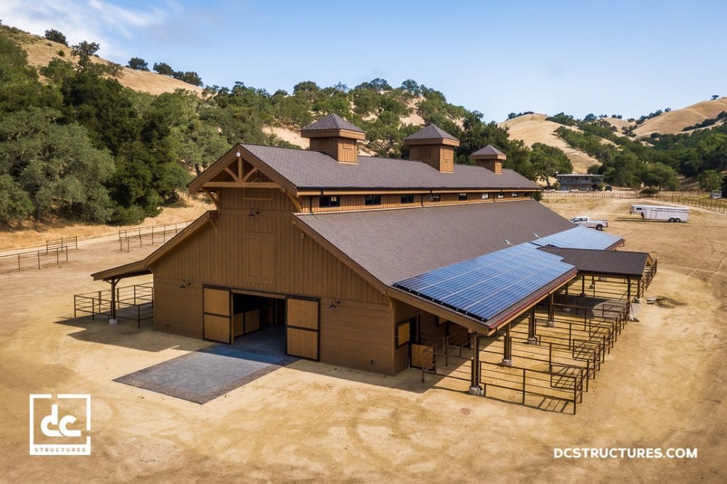 This enormous equestrian facility in Carmel Valley Village, California, boasts numerous custom details throughout, including Classic Equine hinged breezeway doors, Douglas fir tongue and groove siding, and exposure grade glulam beams. Each stall comes with Classic Equine Legend Series stall fronts with yoke openings and removable yoke fills, automatic waterers, and Dutch doors leading to covered turnouts. We widened the stalls by 2′ and added a tack room, feed room, office space, and bathroom and laundry room to the interior. We also designed this structure with two 72″ x 72″ and a 96″ x 96″ cupola with vents. Additionally, a 24′ X 12′ covered entryway with a heavy timber truss adds a unique touch to the exterior while 16′ timber trusses adorn the gable ends.