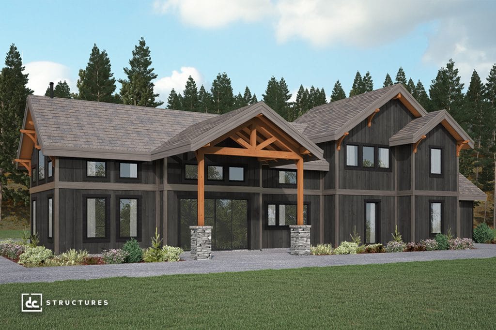 This impressive timber frame home offers numerous custom details throughout, including the addition of two massive gable deck covers outside the guest home and main house and faux timbers in the guest living space. Our designers extended the garage to include a third garage bay and the bonus room to include a gun safe and a separate storage area on the opposite wall. We also modified the attached Rogue to match the exterior of our Thielsen and added a lay-on roof that connects the structures. Design elements like our signature heavy timber corbels, large picture windows, and single-slope accents add to the uniqueness of this home, making it a modern rustic abode for our clients and their guests.