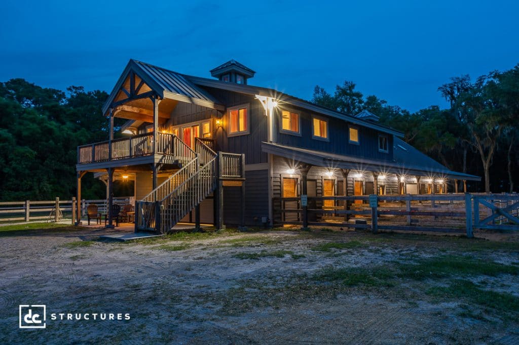 This magnificent post and beam structure located on St. Simons, a historic island off the Georgia coast, combines our Columbia Gable Barn Kit and Oakridge Apartment Barn Kit to create a top-of-the-line equestrian facility and a modern three-bedroom home. The first floor features twelve standard horse stalls equipped with Classic Equine Legend Series sliding stall fronts, steel-framed Dutch doors leading to covered turnouts, removable stall partitions, and automatic waterers. There’s also a grooming stall, feed storage room, tack room, powder room, and office – everything our client needs to manage a self-sufficient equestrian facility!
