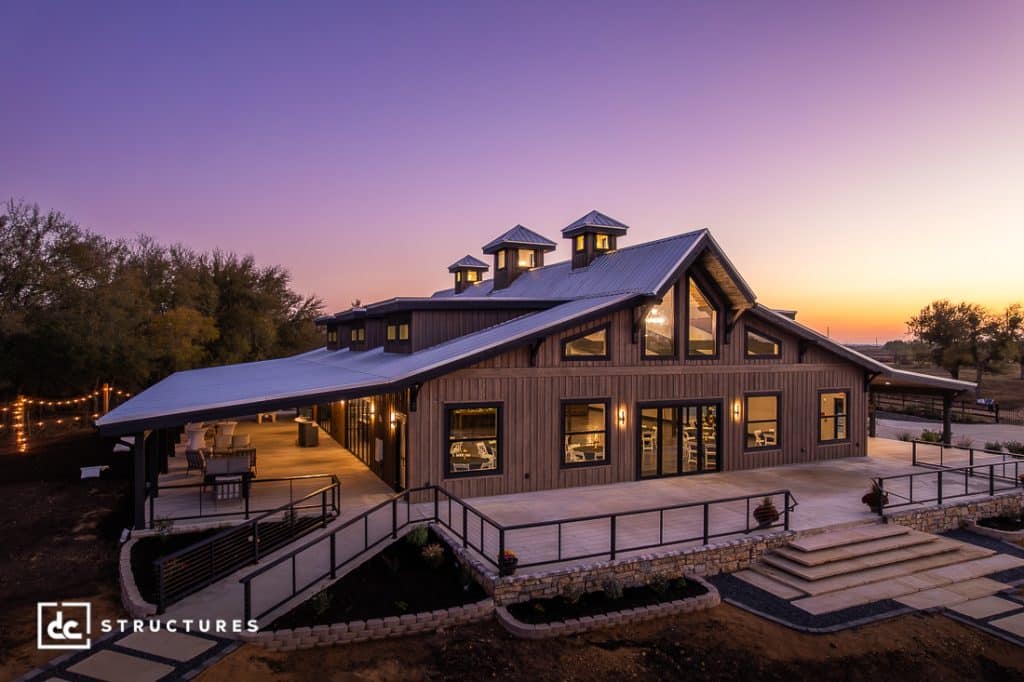 Crafted from our Sunnyside Event Barn Kit, this stunning wedding barn features a bright and adaptable ceremony space overlooking a tree-lined vista in Thorndale, Texas. Coming in at 7,599 square feet, this extravagant venue boasts all the classic amenities of a DC wedding barn, including a large ceremony hall, prep kitchen, and bridal suite, plus a few extras that make it wholly unique.