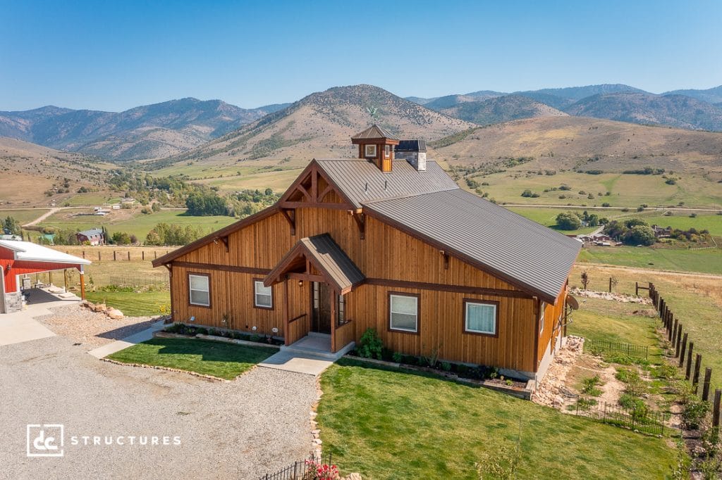 Situated on a scenic hillside in Preston, Idaho, this rustic barn home is designed to maximize property views from every level. Based on our Sunnyside Event Barn Kit, this post and beam home offers 2,160 sq. ft. of conditioned living space plus a 2,041 sq. ft. daylight basement and a 720 sq. ft. deck. The main level includes an open-concept living, dining, and kitchen area with a massive double-sided fireplace, in addition to three bedrooms and two bathrooms. Our clients can step out onto a two-story covered deck that overlooks the surrounding region from a pair of sliding patio doors in the living room.