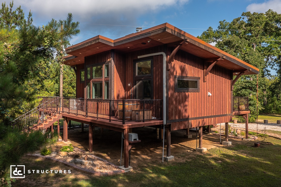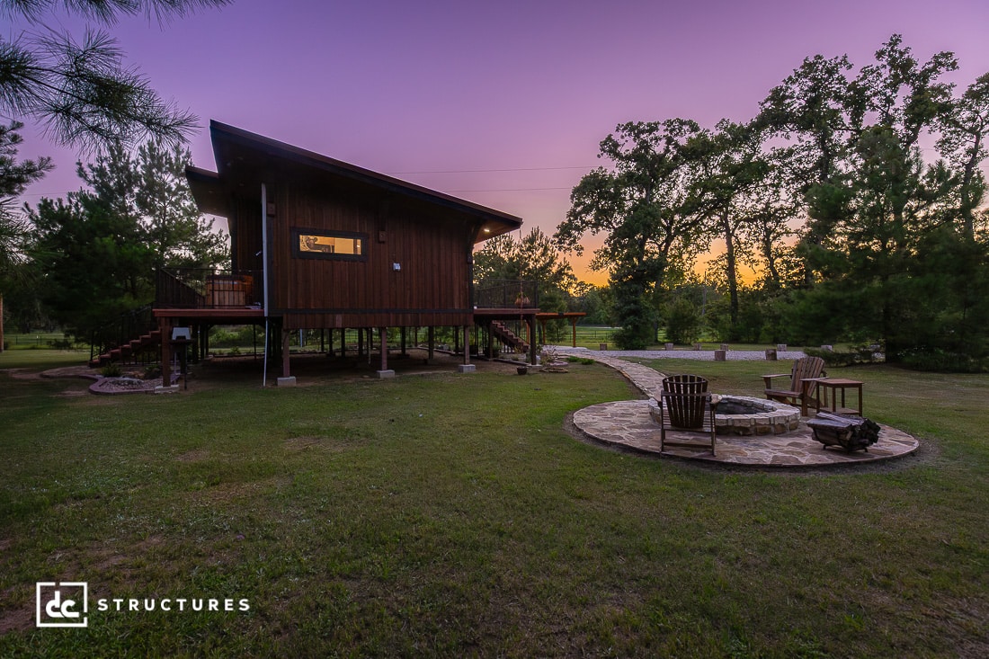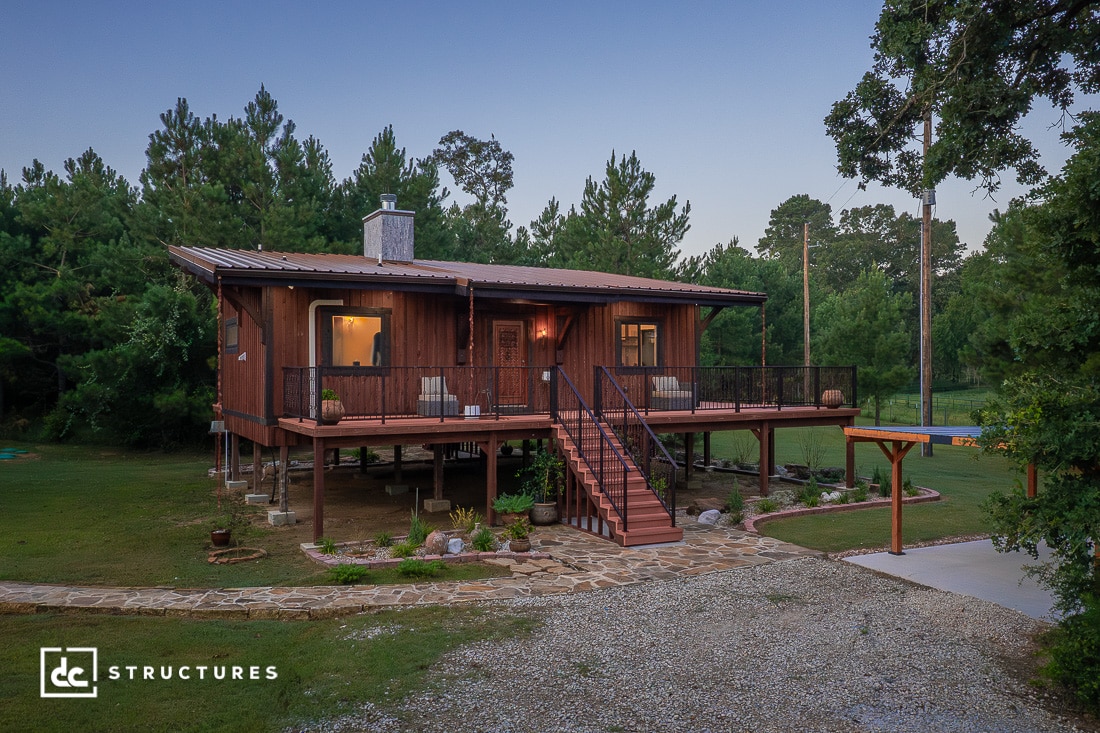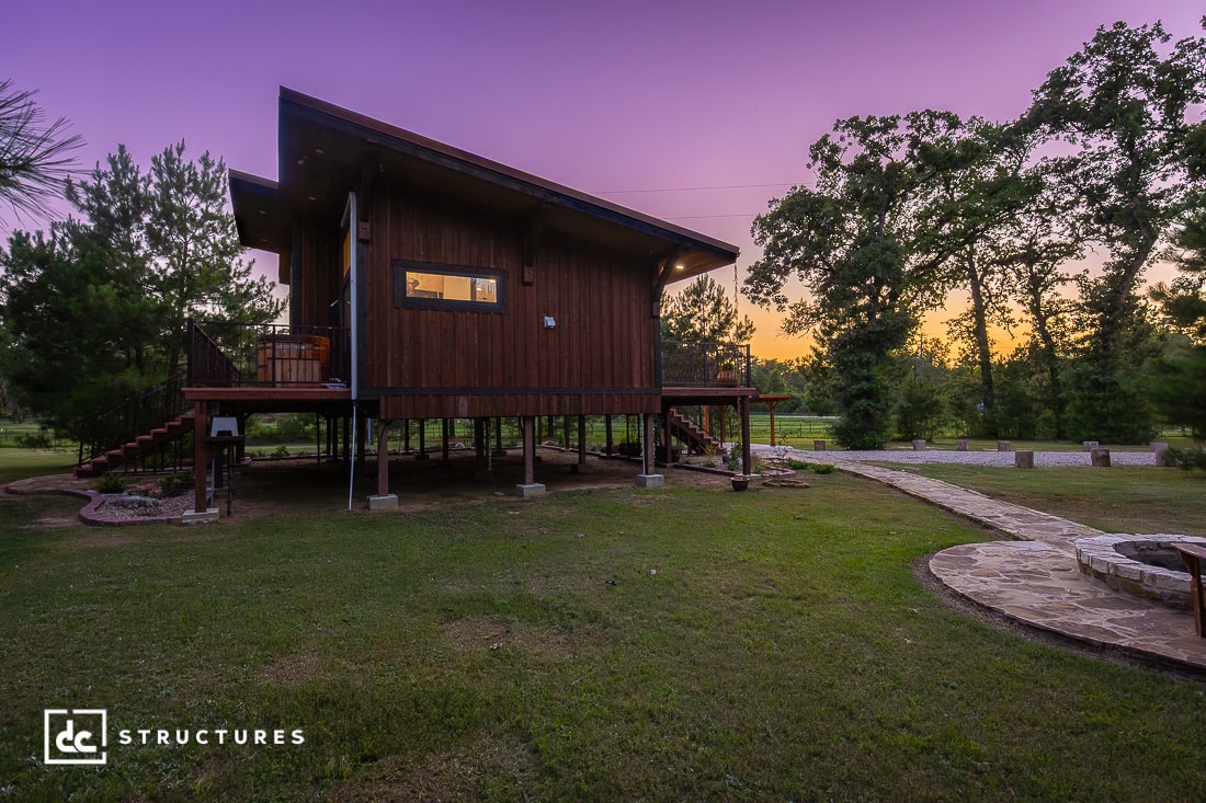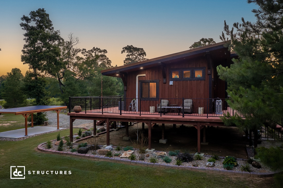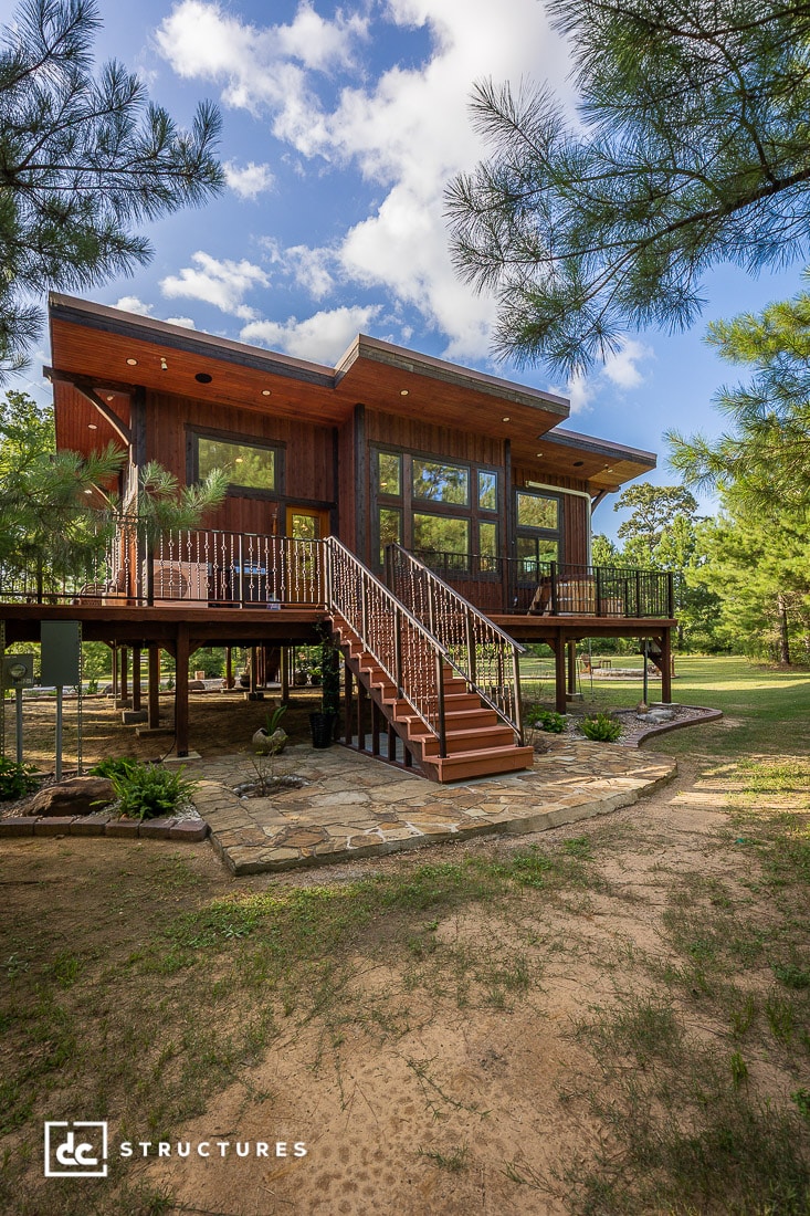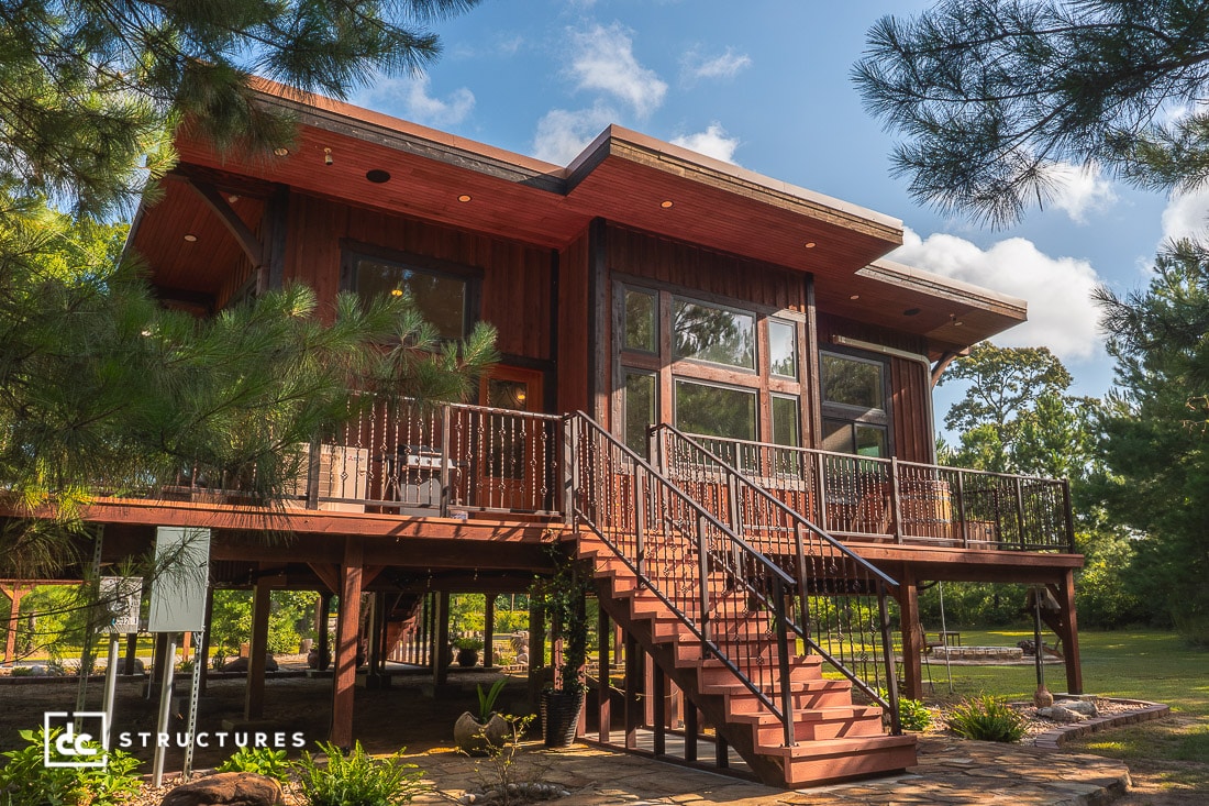 Adapted from our Modern Deschutes Cabin Kit, this stilted retreat in Magnolia, Texas, showcases the incredible design flexibility of our pre-engineered building models. One of four structures we designed for these clients, this guest suite is anything but ordinary, with marble flooring, ornate lighting, and striking interior finishes throughout.