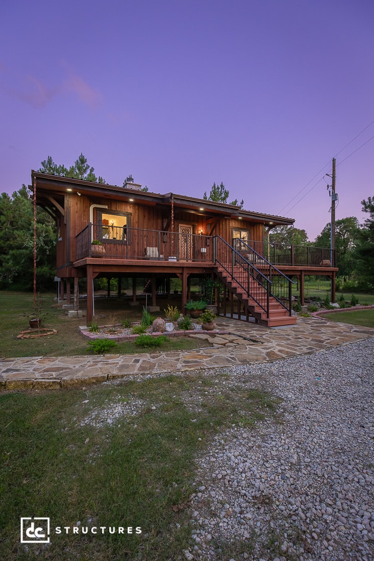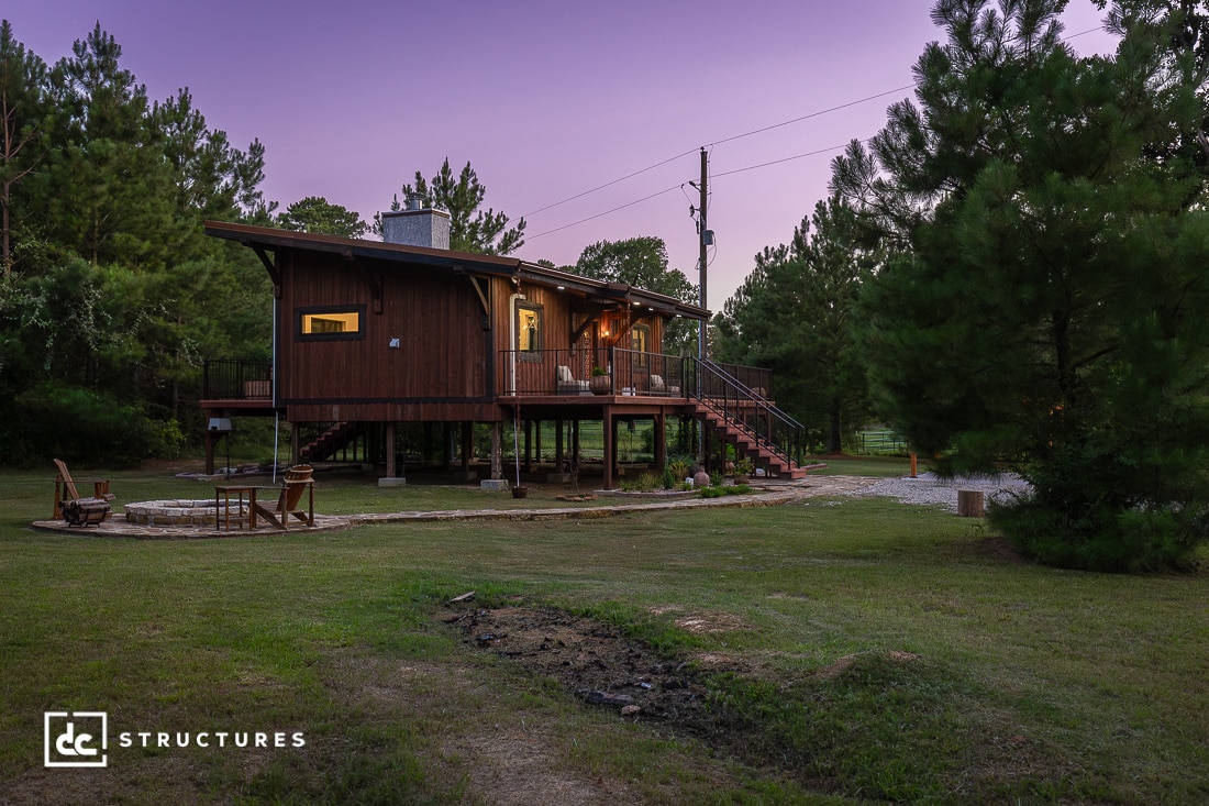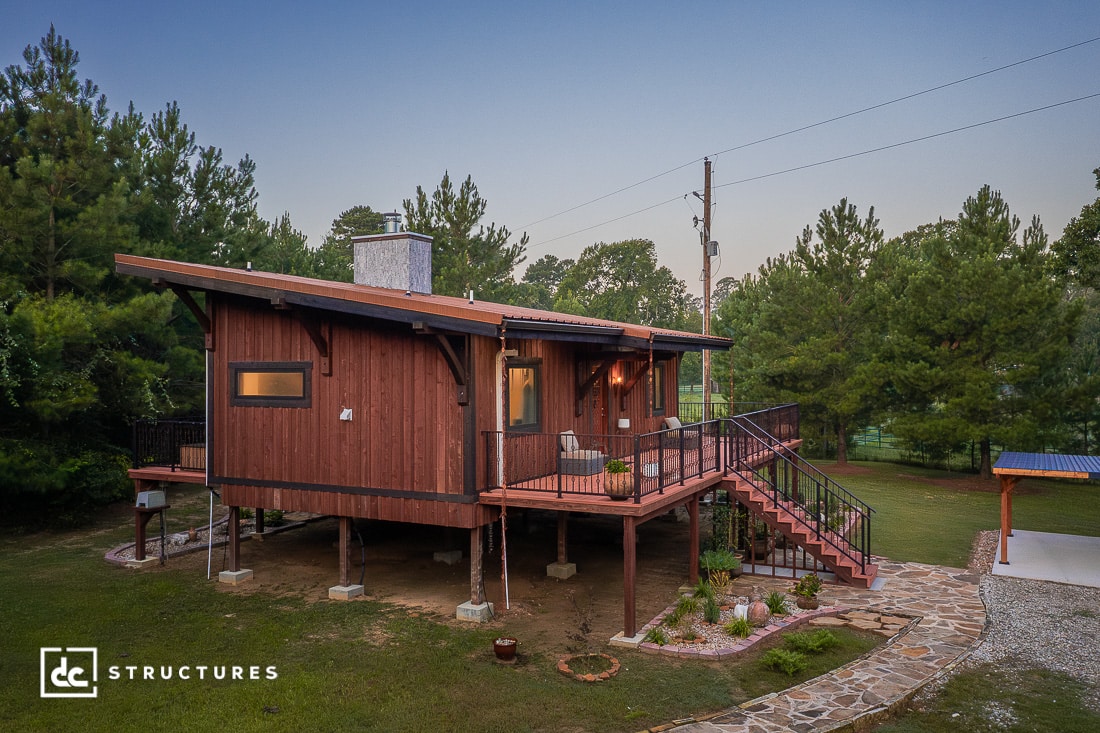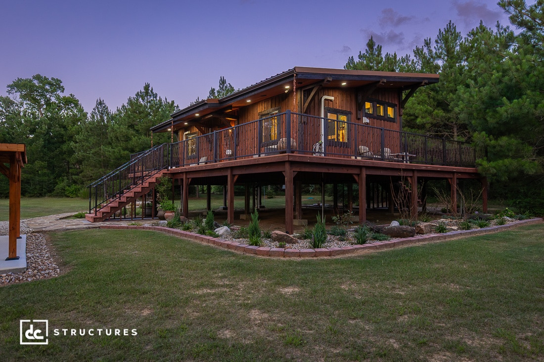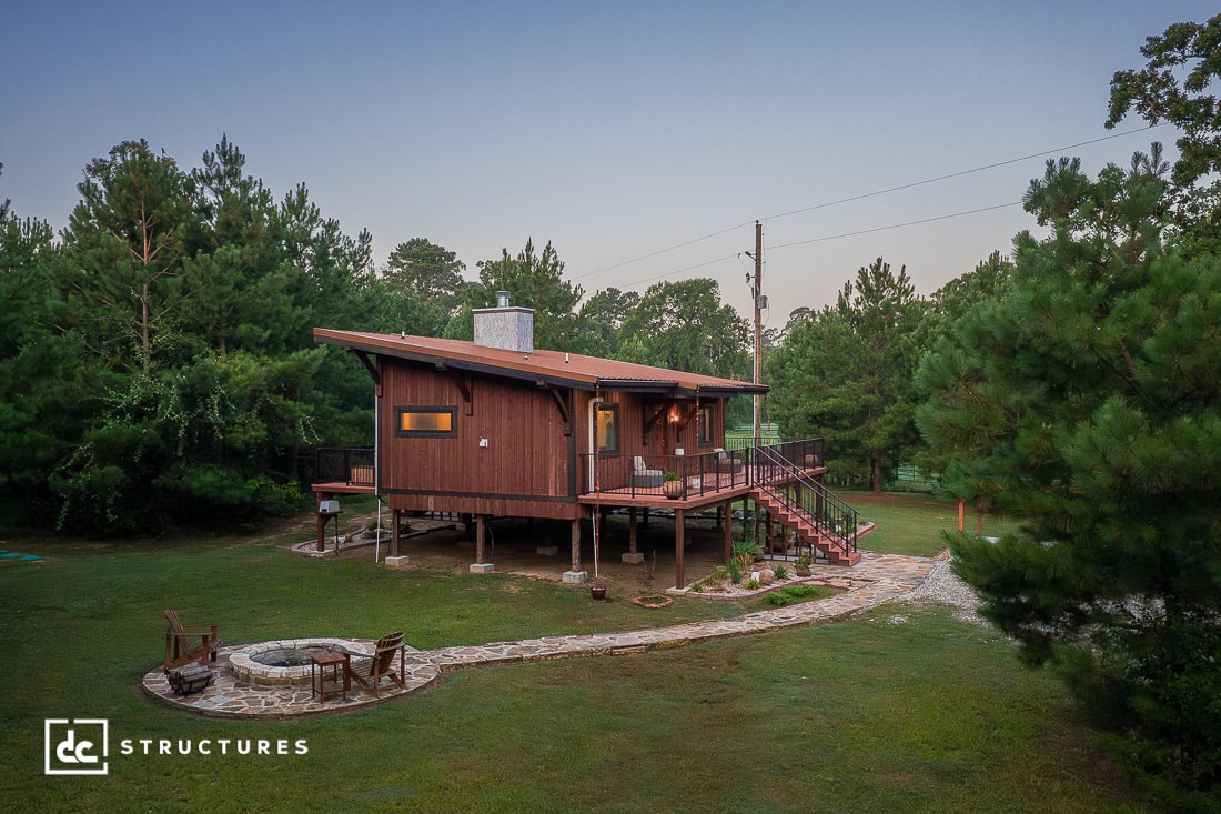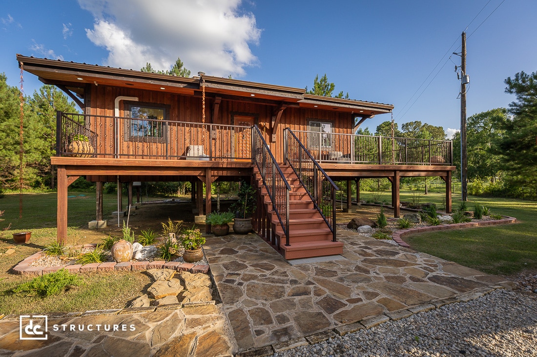 Adapted from our Modern Deschutes Cabin Kit, this stilted retreat in Magnolia, Texas, showcases the incredible design flexibility of our pre-engineered building models. One of four structures we designed for these clients, this guest suite is anything but ordinary, with marble flooring, ornate lighting, and striking interior finishes throughout.