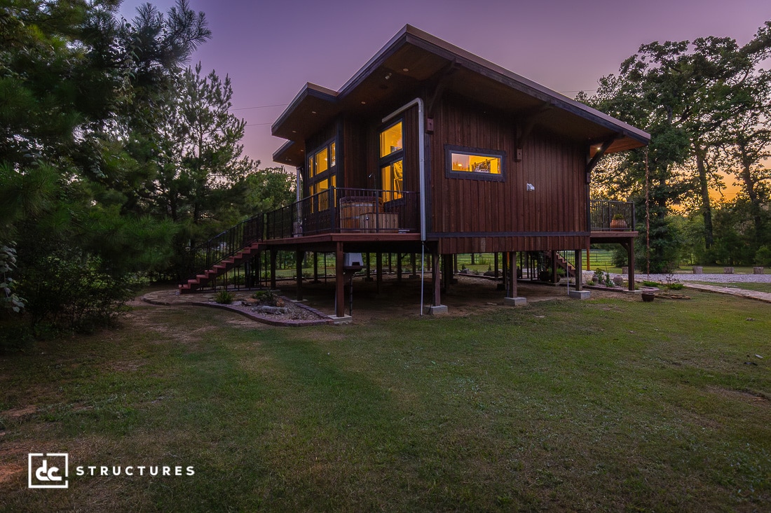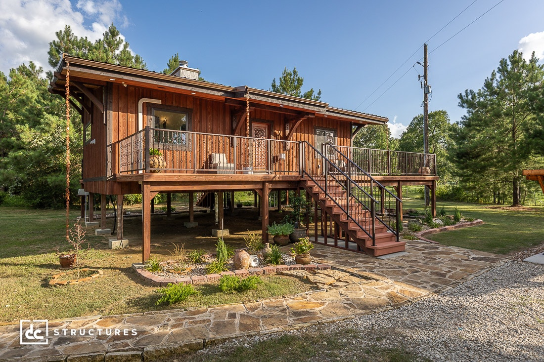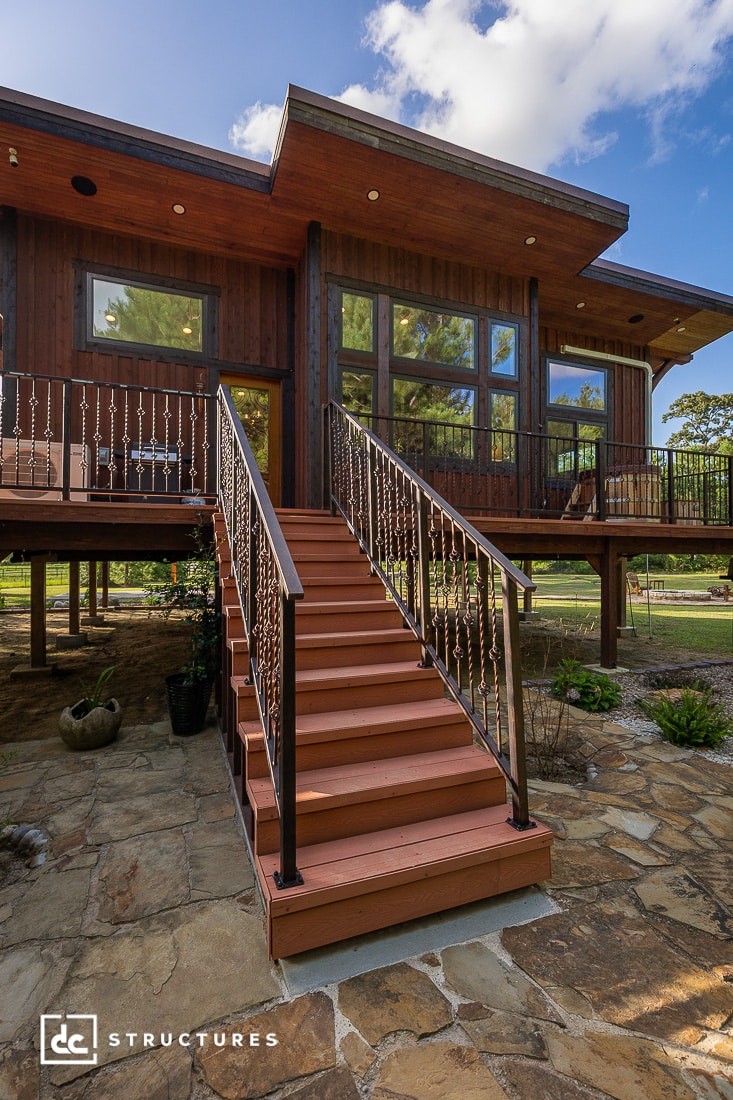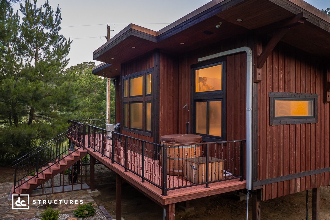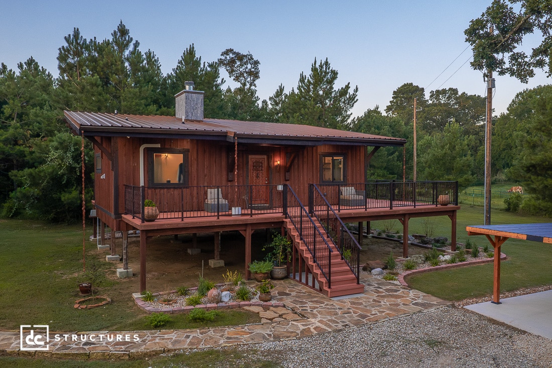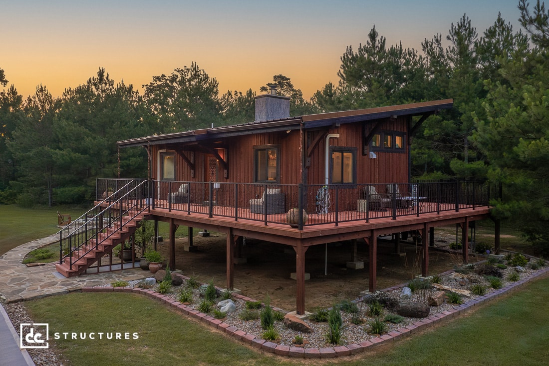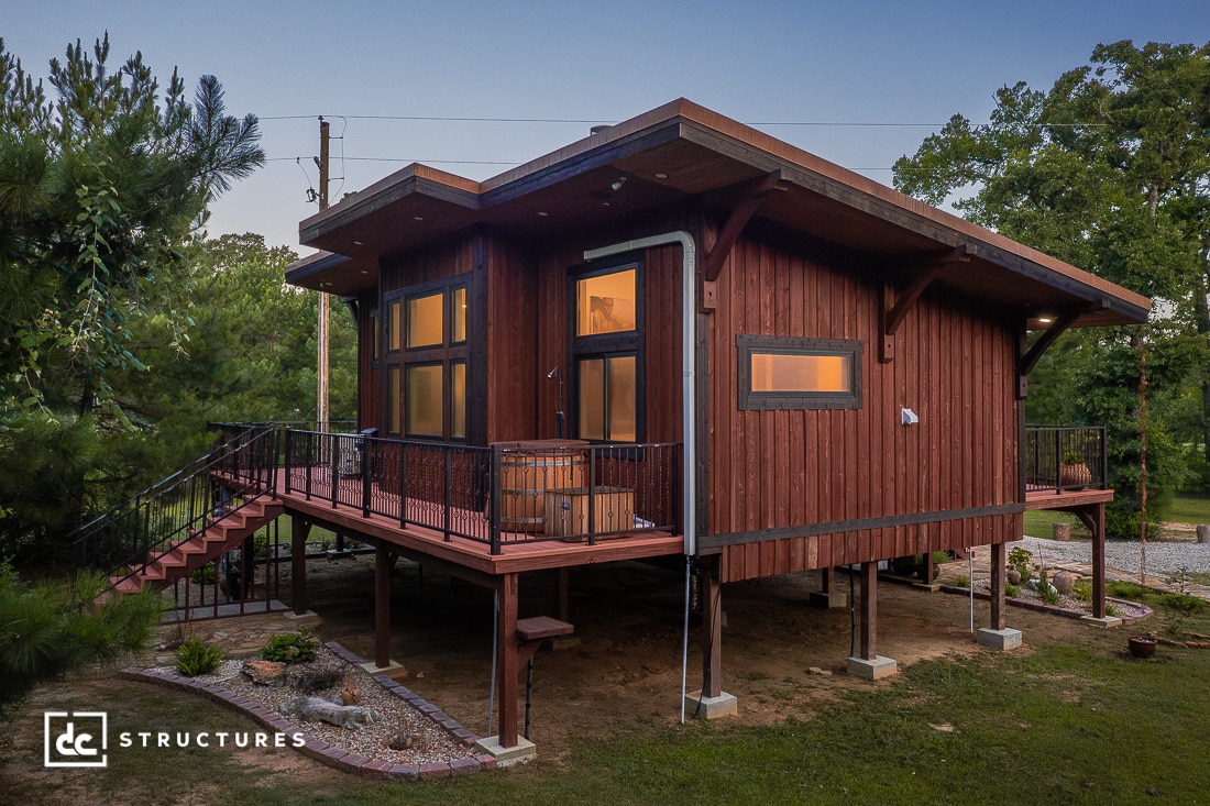 Adapted from our Modern Deschutes Cabin Kit, this stilted retreat in Magnolia, Texas, showcases the incredible design flexibility of our pre-engineered building models. One of four structures we designed for these clients, this guest suite is anything but ordinary, with marble flooring, ornate lighting, and striking interior finishes throughout.