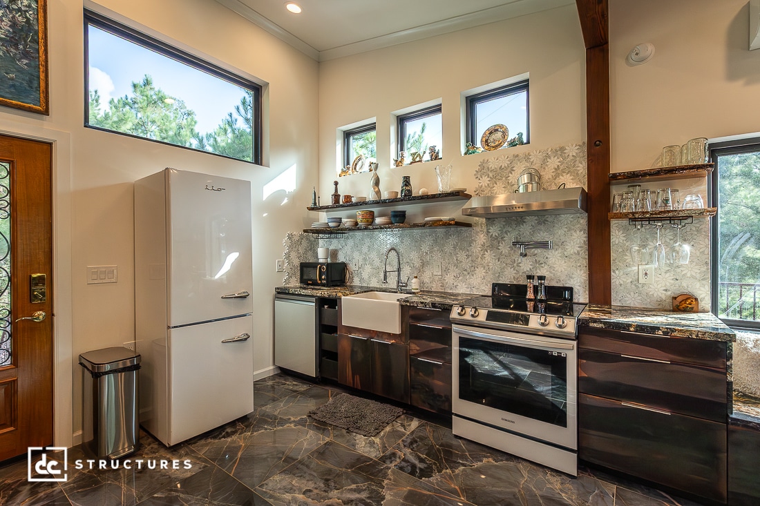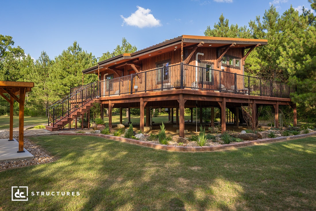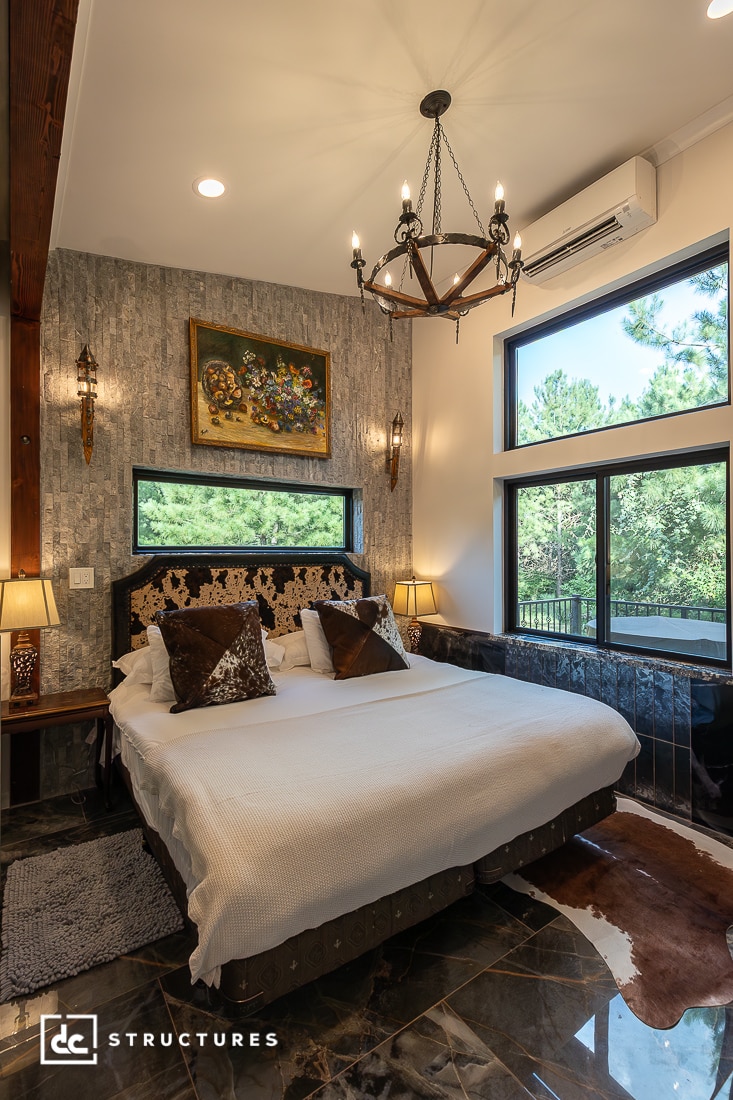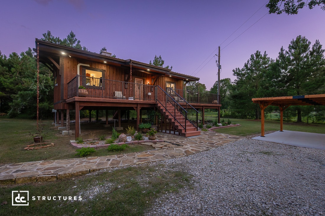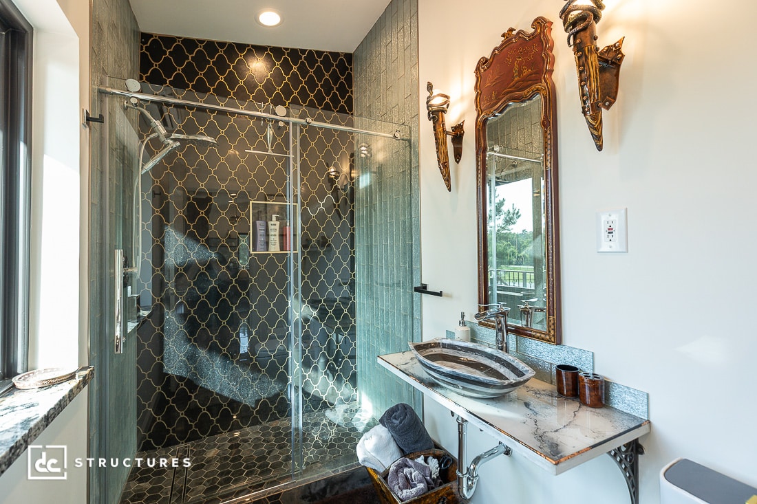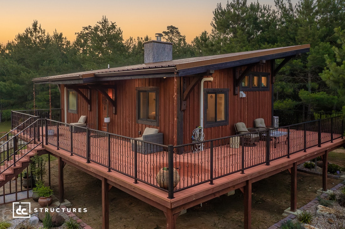 Adapted from our Modern Deschutes Cabin Kit, this stilted retreat in Magnolia, Texas, showcases the incredible design flexibility of our pre-engineered building models. One of four structures we designed for these clients, this guest suite is anything but ordinary, with marble flooring, ornate lighting, and striking interior finishes throughout.