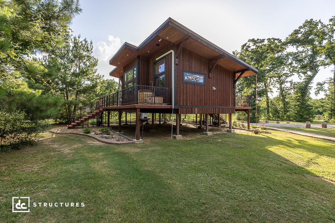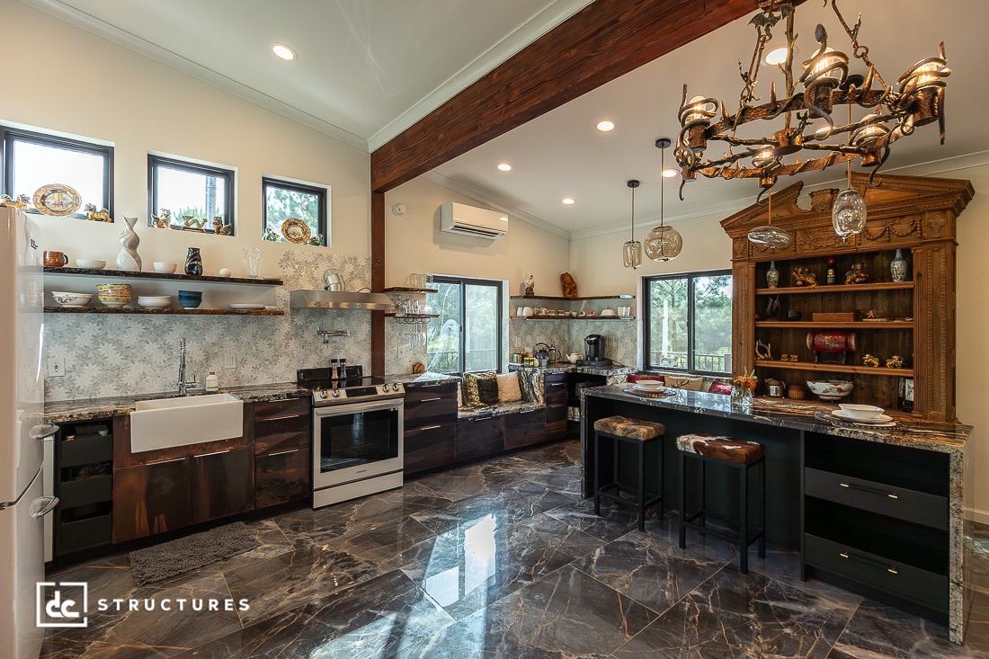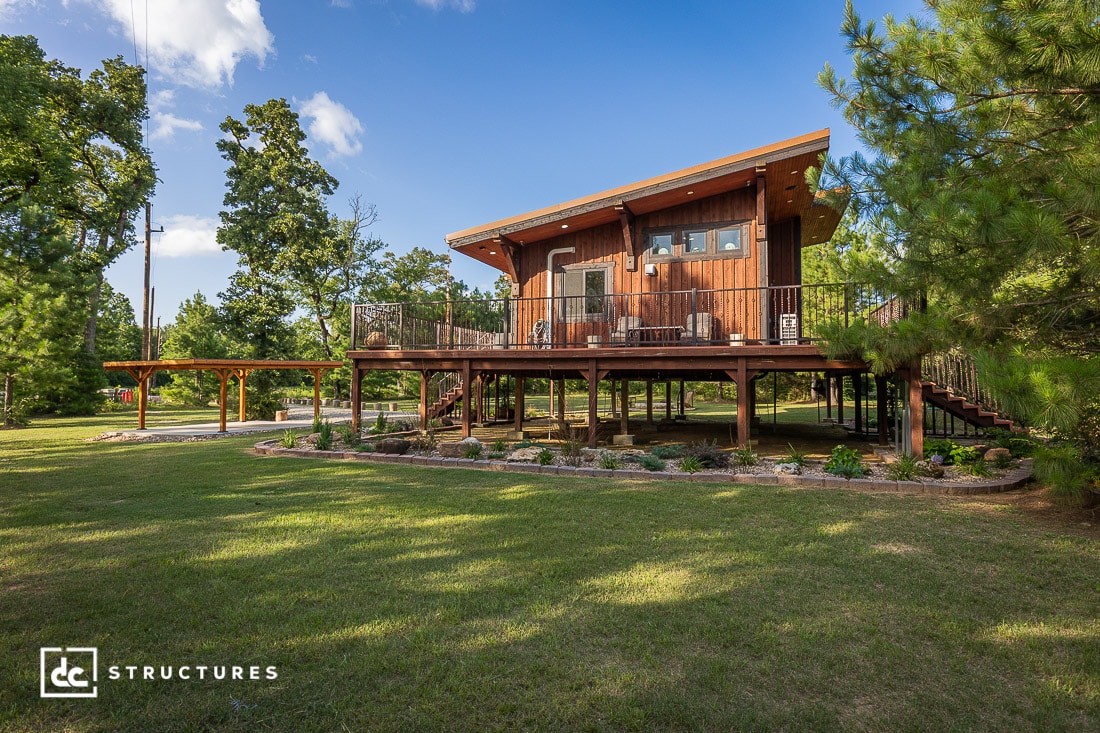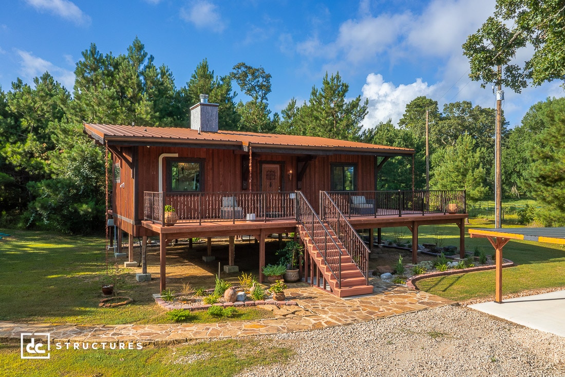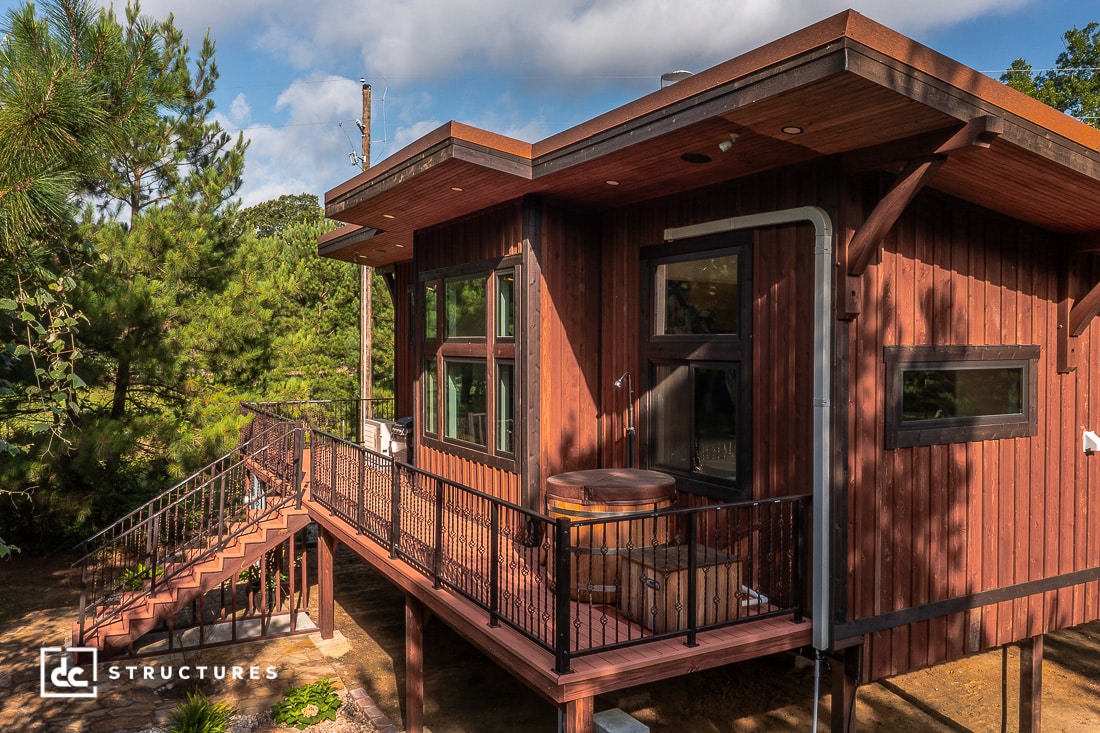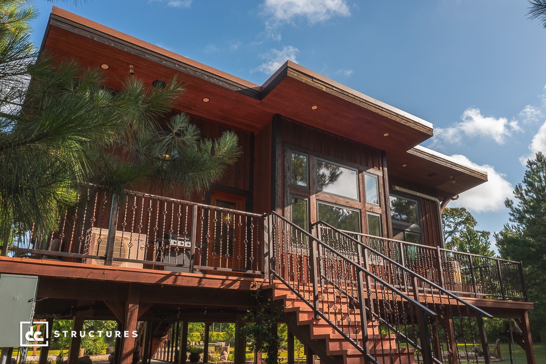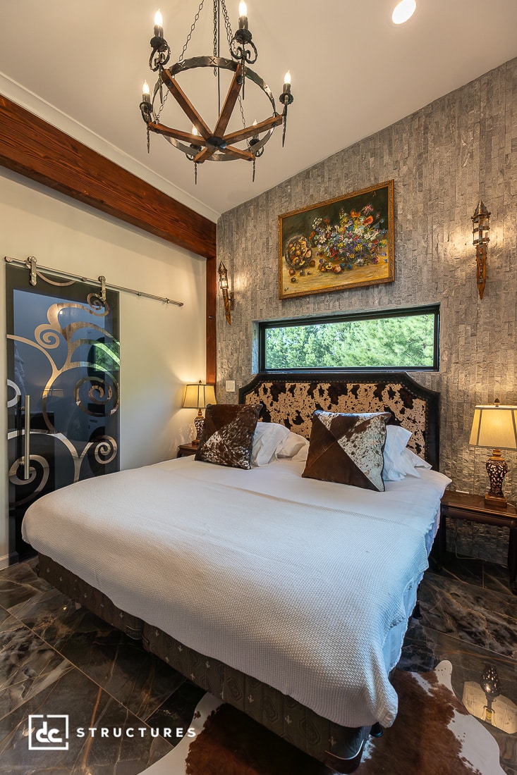 Adapted from our Modern Deschutes Cabin Kit, this stilted retreat in Magnolia, Texas, showcases the incredible design flexibility of our pre-engineered building models. One of four structures we designed for these clients, this guest suite is anything but ordinary, with marble flooring, ornate lighting, and striking interior finishes throughout.