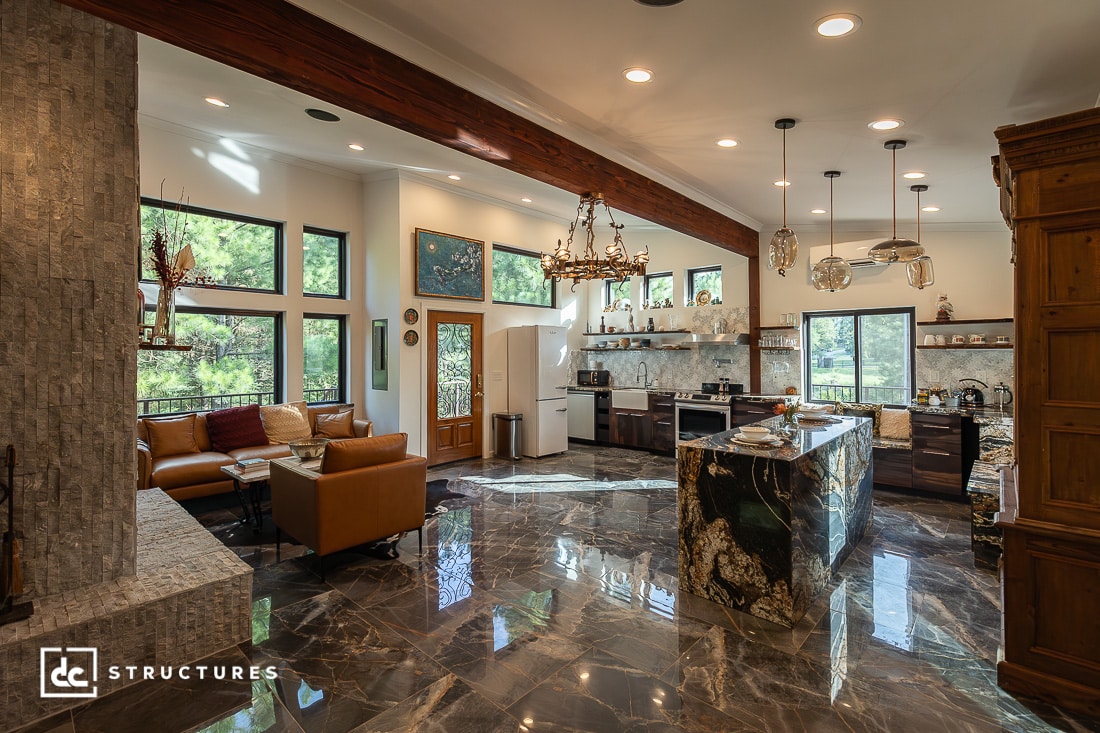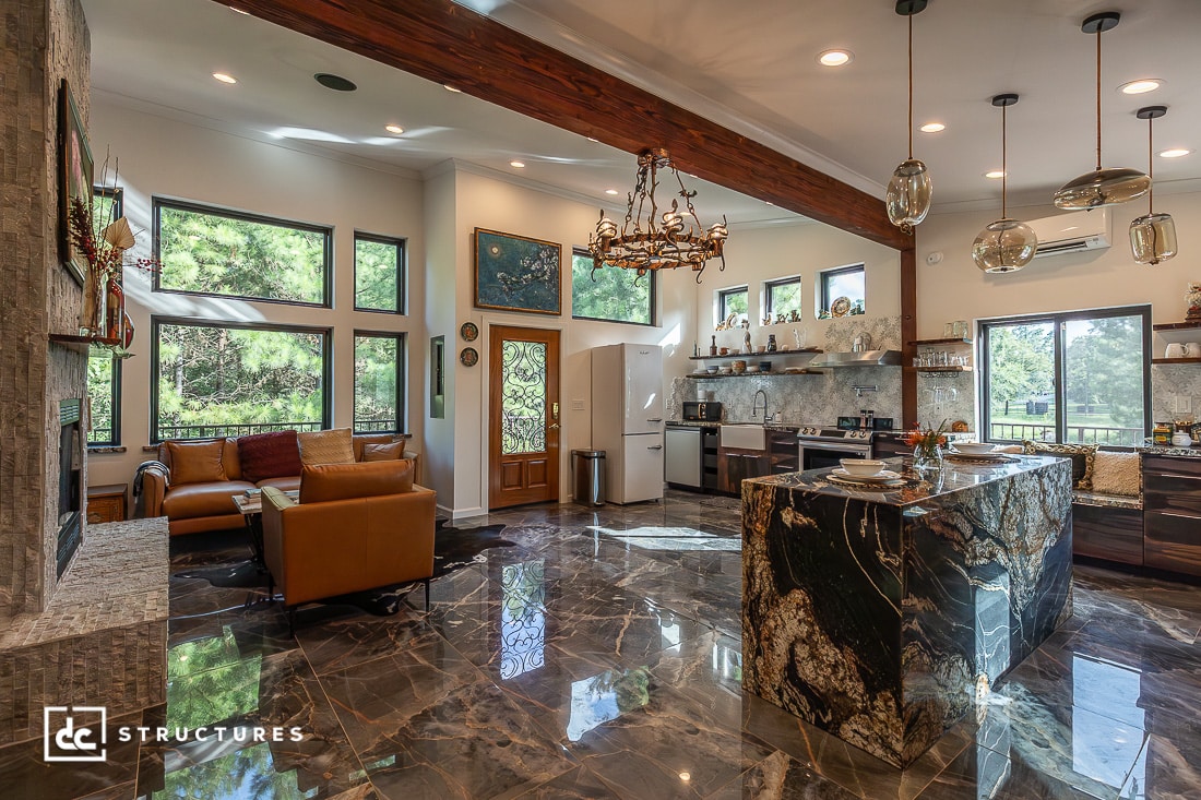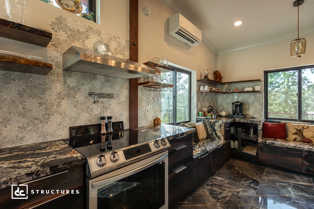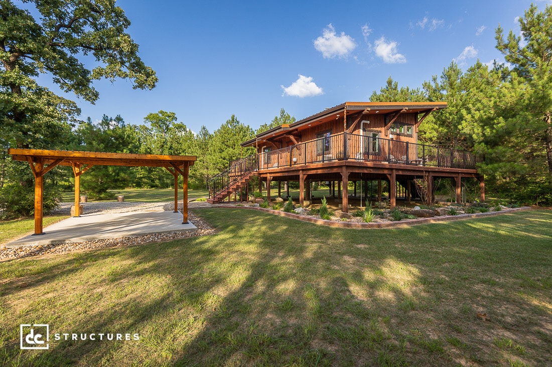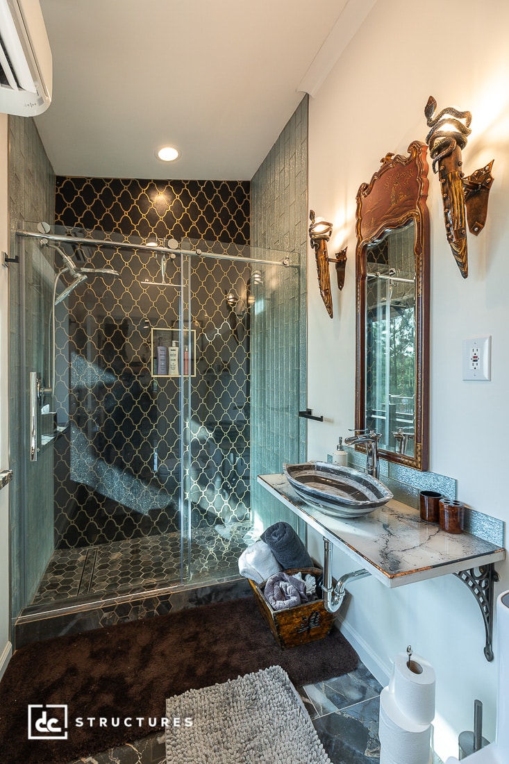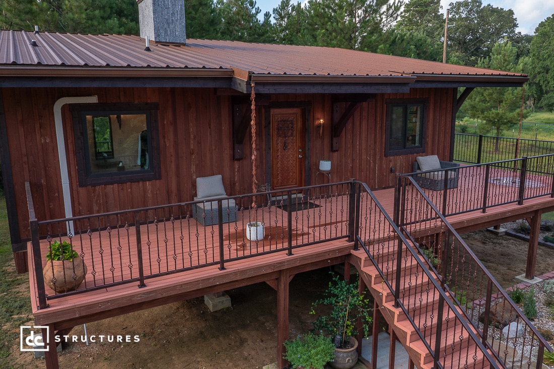 Adapted from our Modern Deschutes Cabin Kit, this stilted retreat in Magnolia, Texas, showcases the incredible design flexibility of our pre-engineered building models. One of four structures we designed for these clients, this guest suite is anything but ordinary, with marble flooring, ornate lighting, and striking interior finishes throughout.