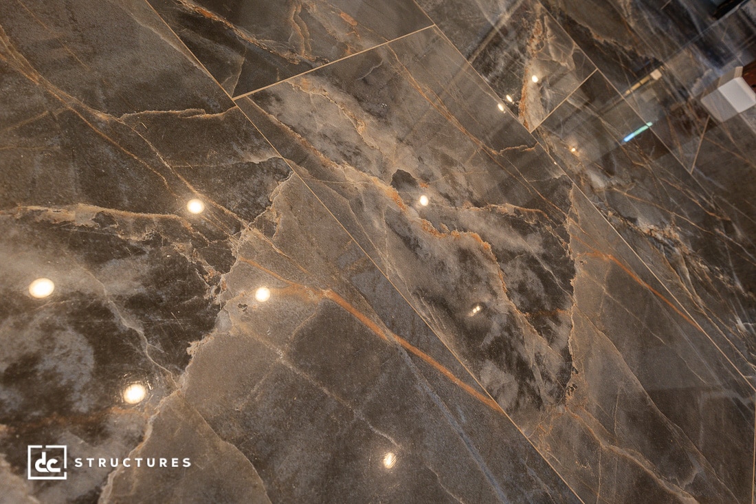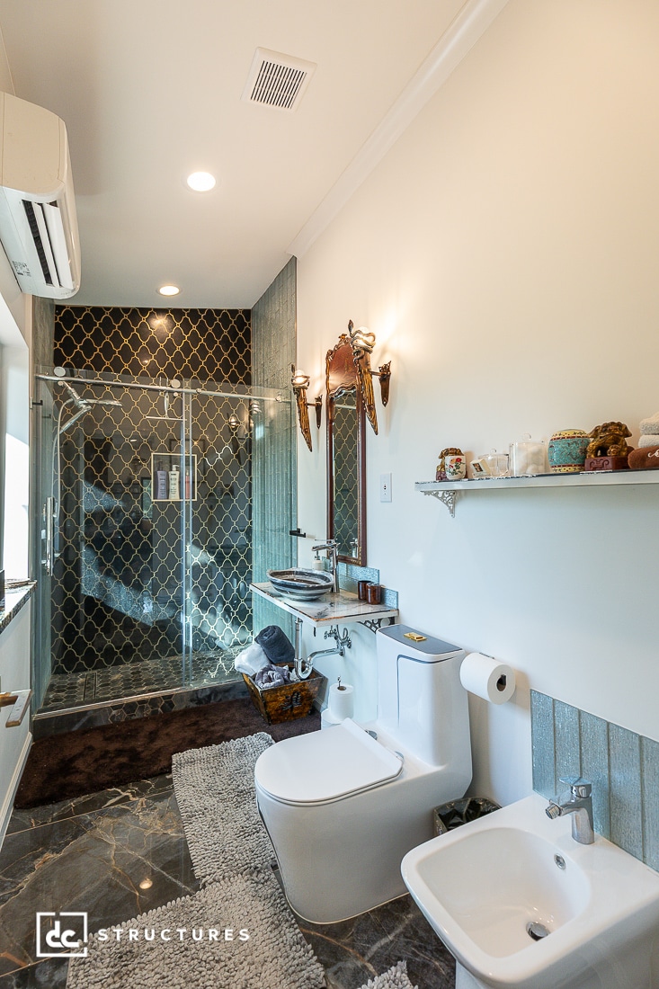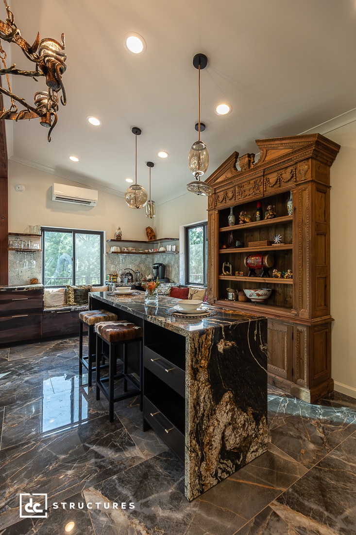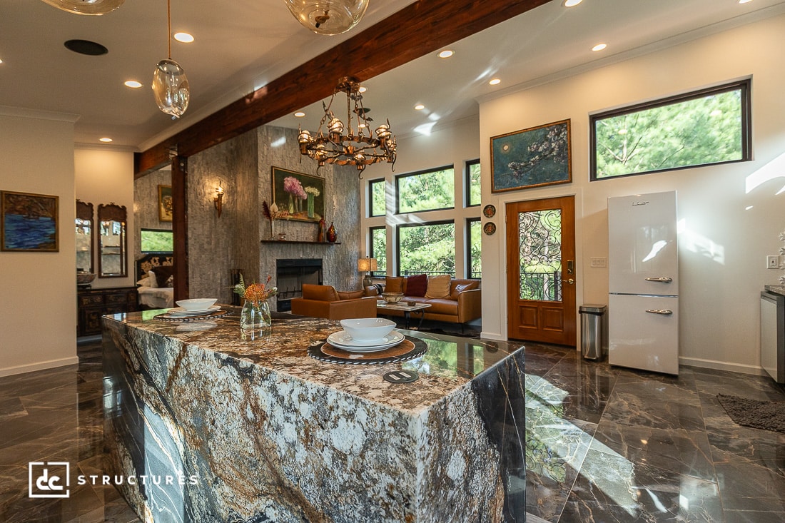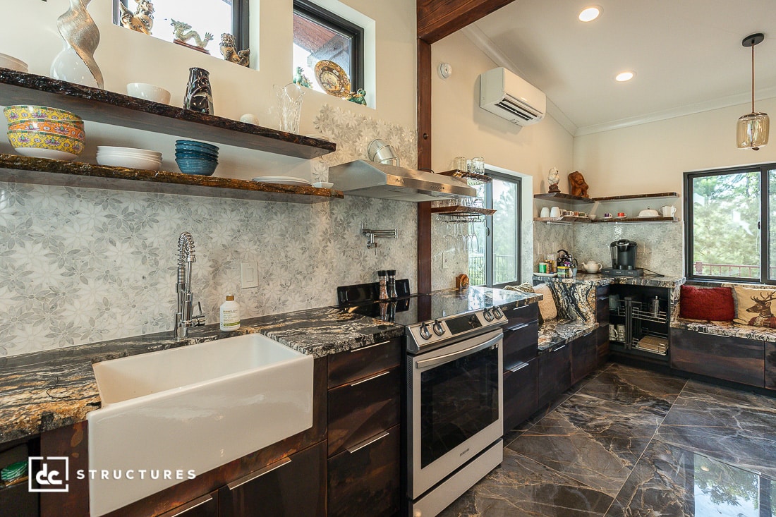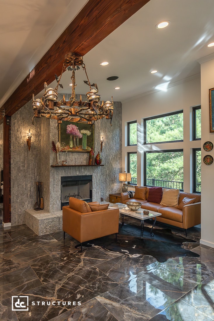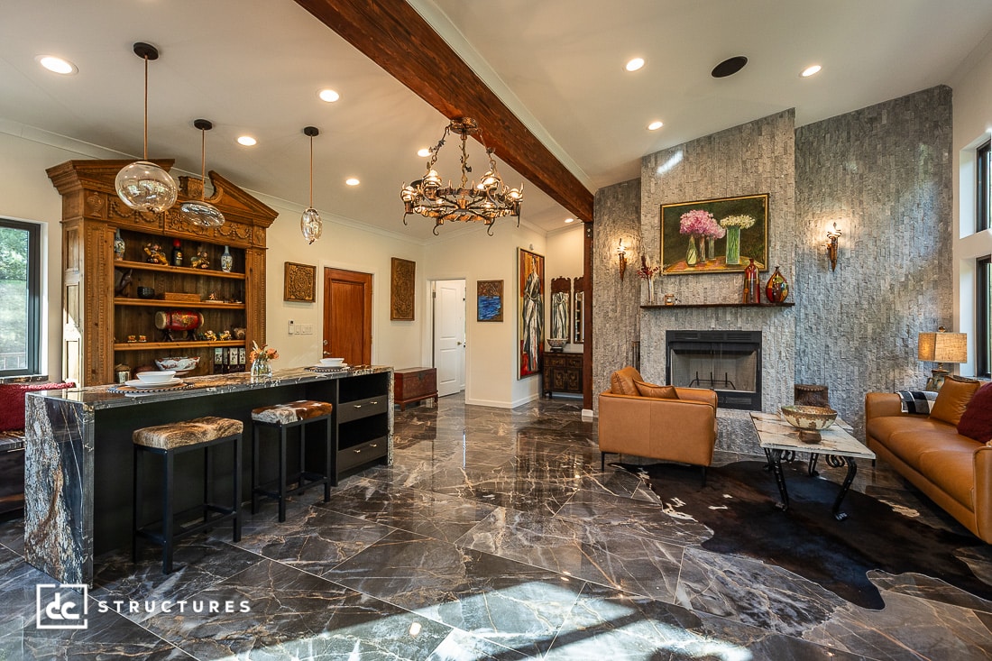 Adapted from our Modern Deschutes Cabin Kit, this stilted retreat in Magnolia, Texas, showcases the incredible design flexibility of our pre-engineered building models. One of four structures we designed for these clients, this guest suite is anything but ordinary, with marble flooring, ornate lighting, and striking interior finishes throughout.