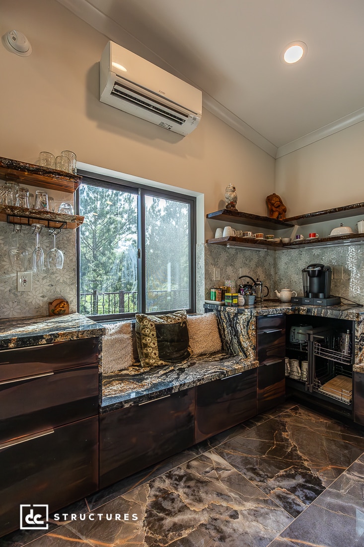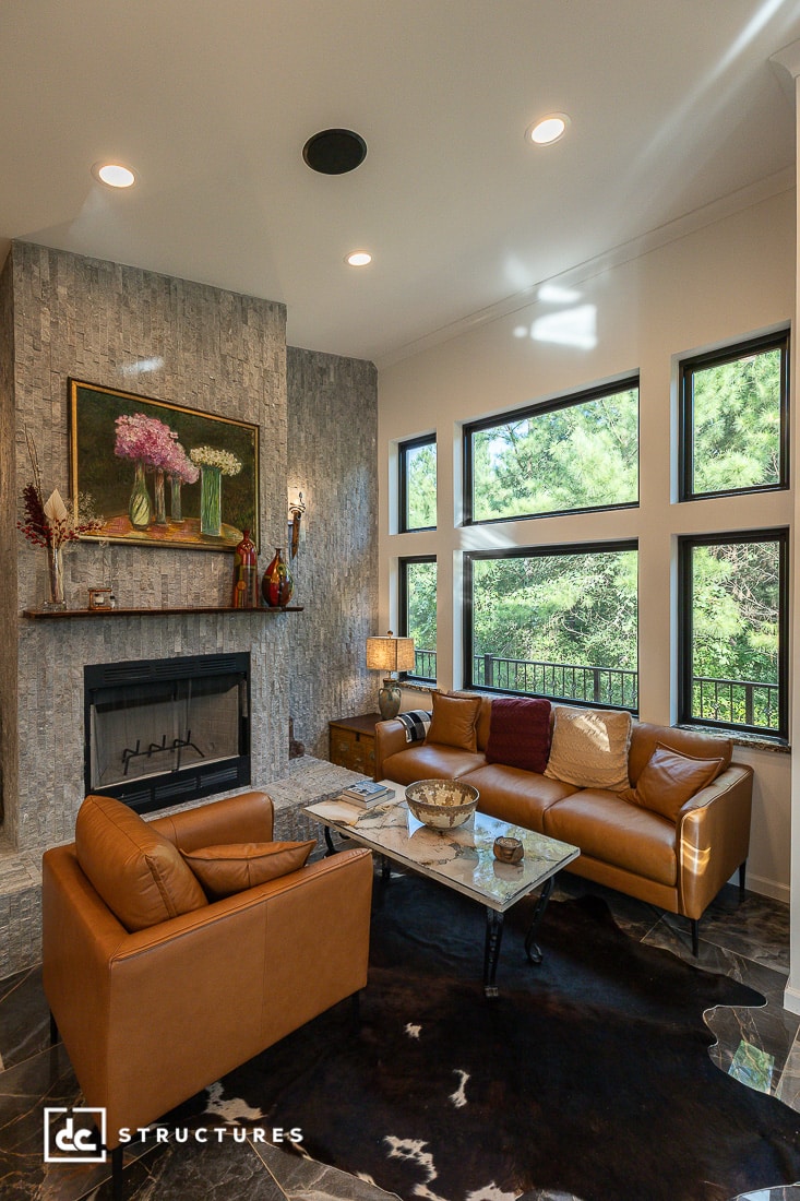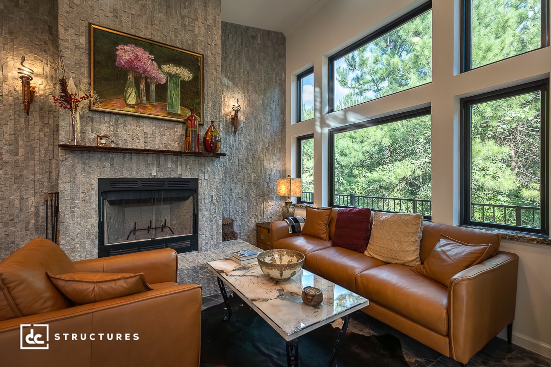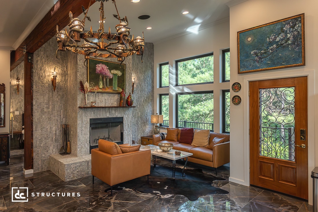 Like its sister structure, we designed this cabin with several upgrades to meet our client’s vision for a guest suite and ADU. We pre-stained the siding in a rich dark walnut finish and framed the exterior windows with dark bronze trim and hardware. Together with its richly appointed interior, these design upgrades help this cabin stand out as a one-of-a-kind retreat for family and friends alike.