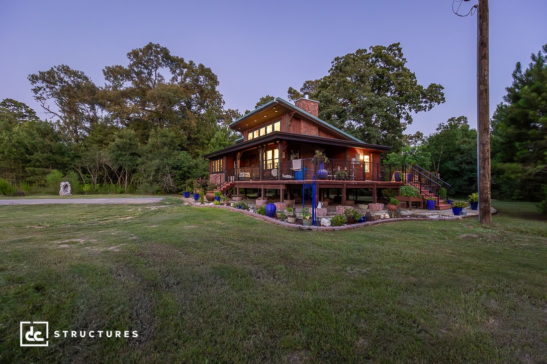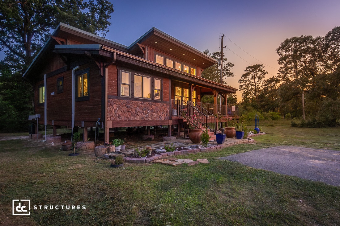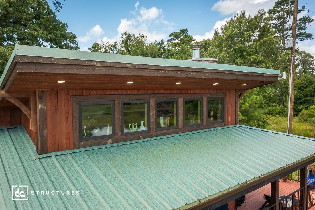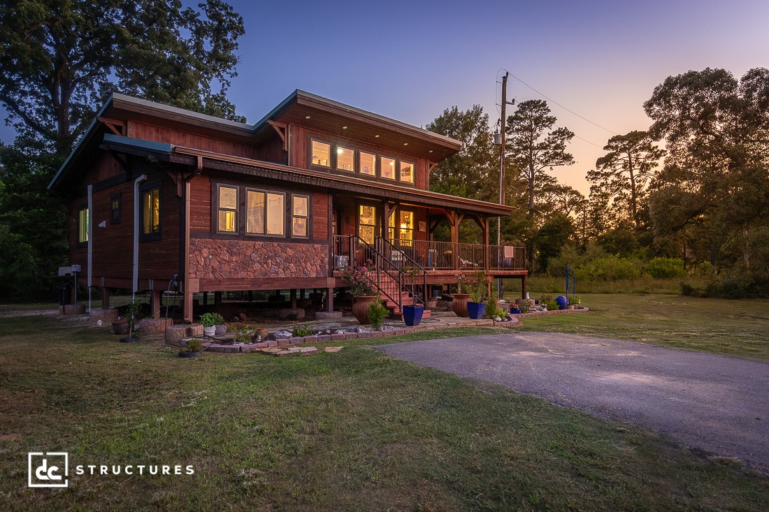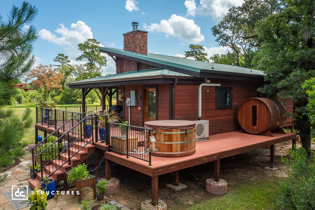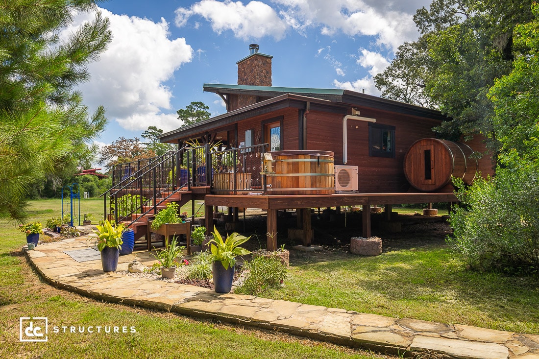 Modeled after our Modern Rogue Cabin Kit, this custom ADU in Magnolia, Texas, offers an interior unlike any other. One of three eclectic cabins on the property, this post and beam structure embraces the timeless appeal of a classic cabin on the outside—while delivering a bold, unexpected twist within.