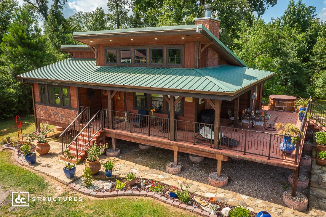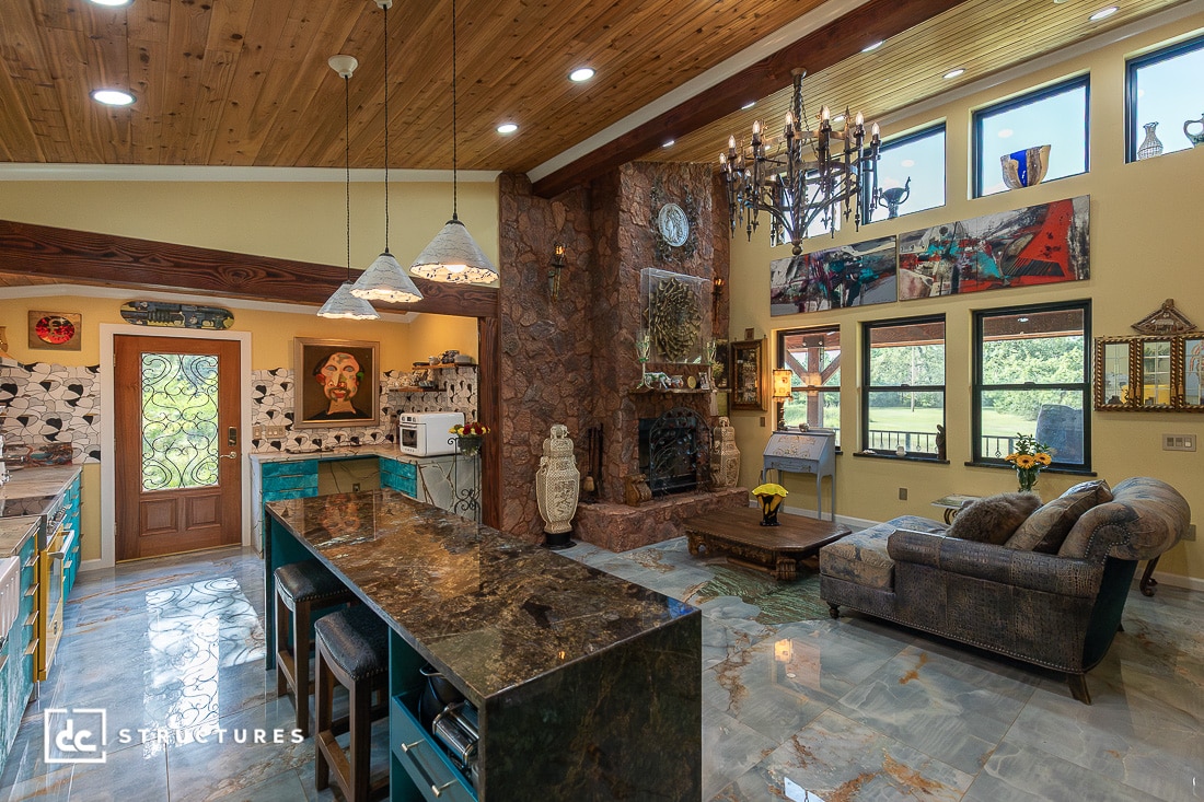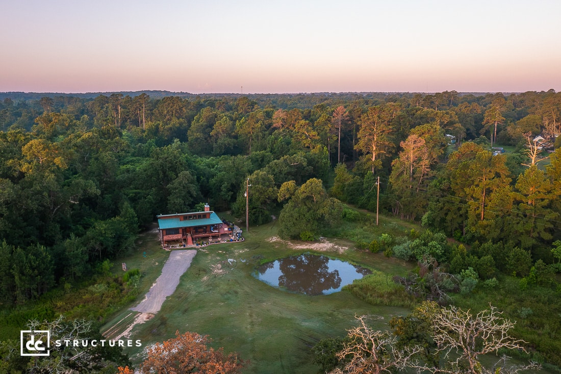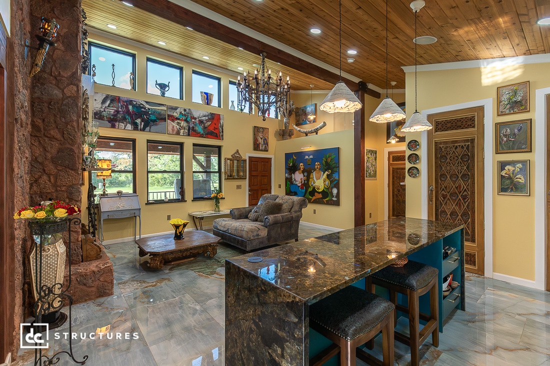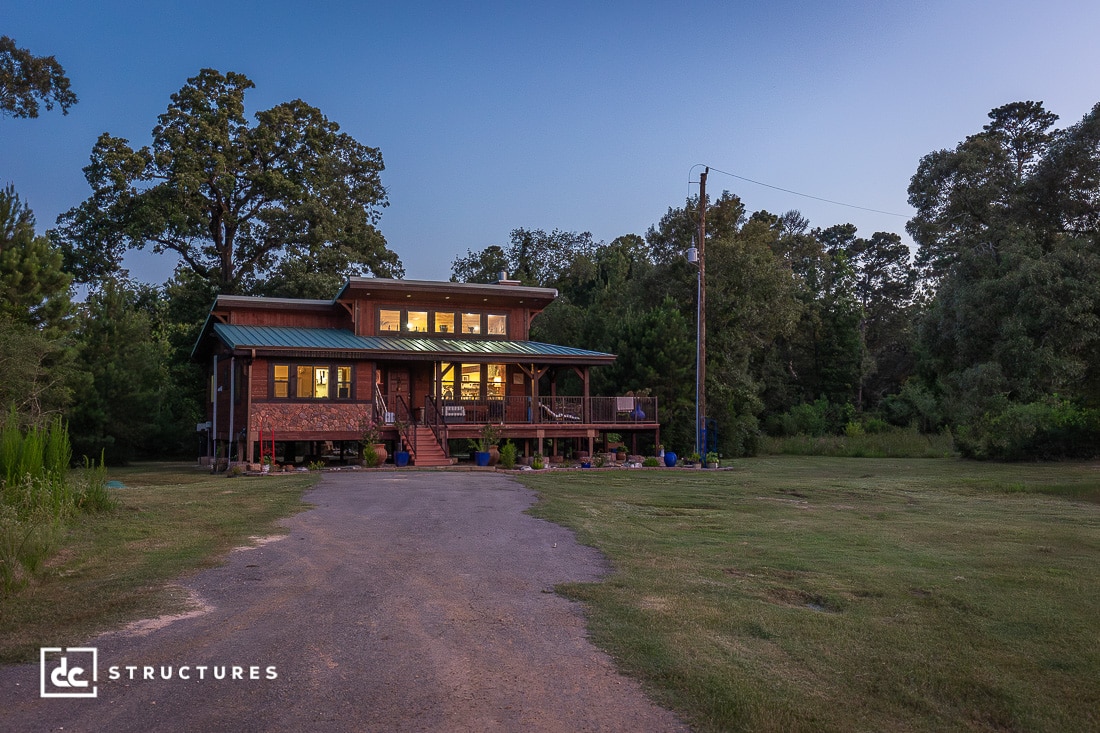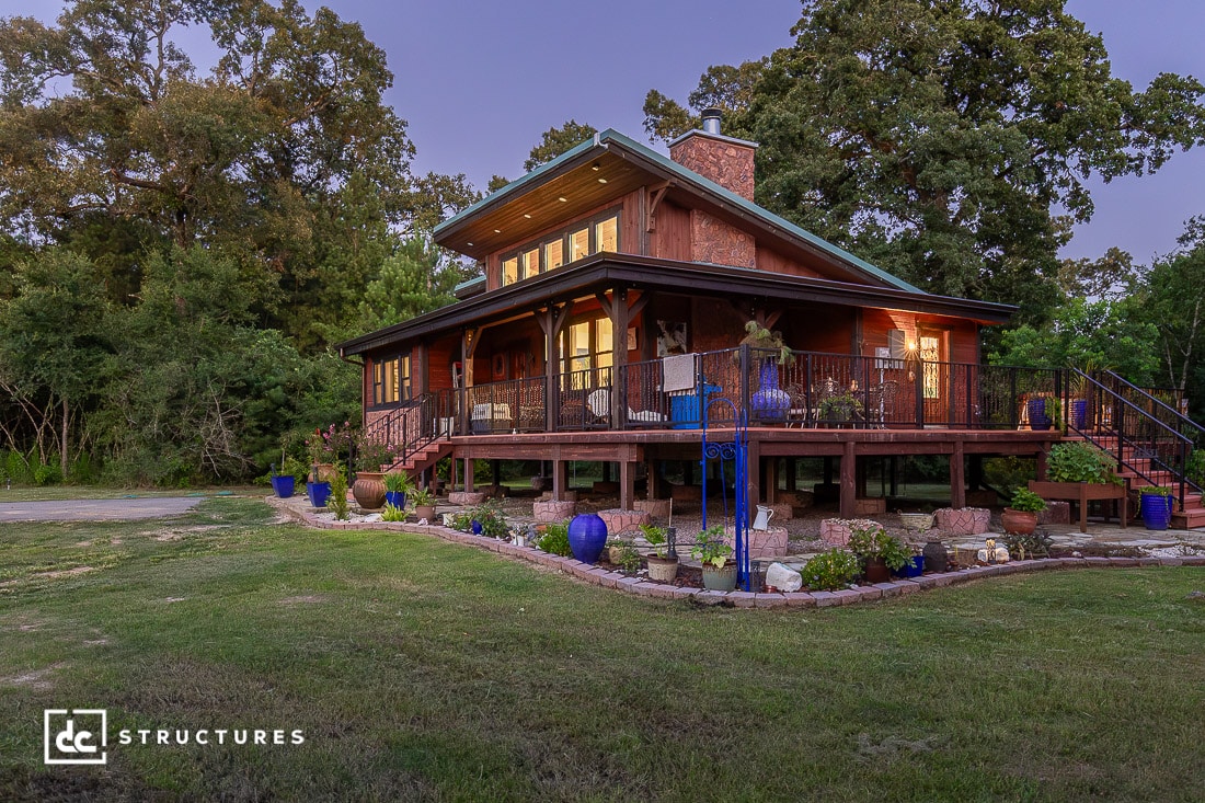 Modeled after our Modern Rogue Cabin Kit, this custom ADU in Magnolia, Texas, offers an interior unlike any other. One of three eclectic cabins on the property, this post and beam structure embraces the timeless appeal of a classic cabin on the outside—while delivering a bold, unexpected twist within.