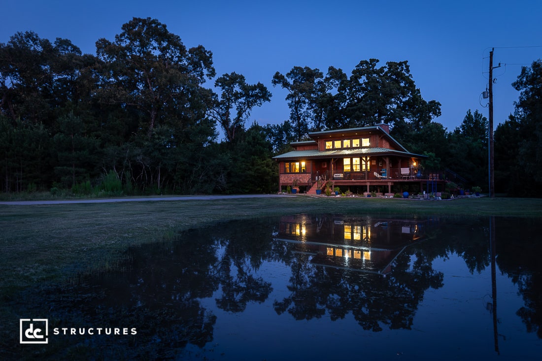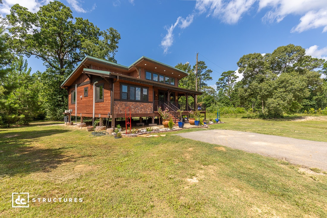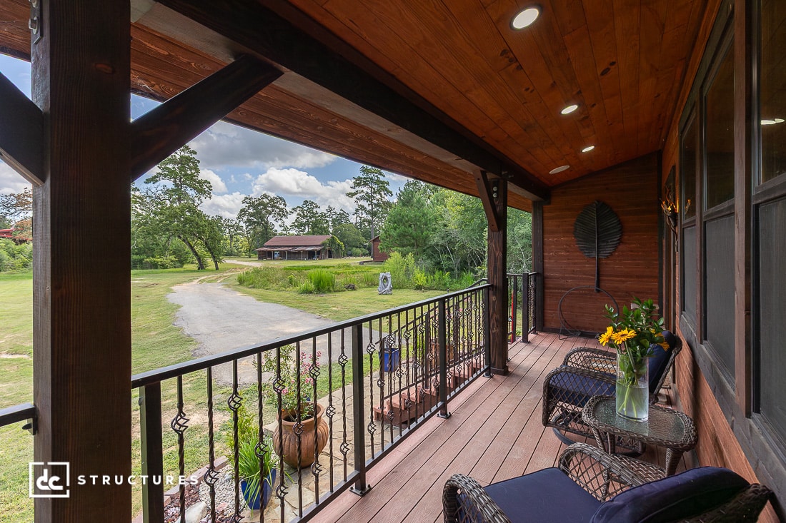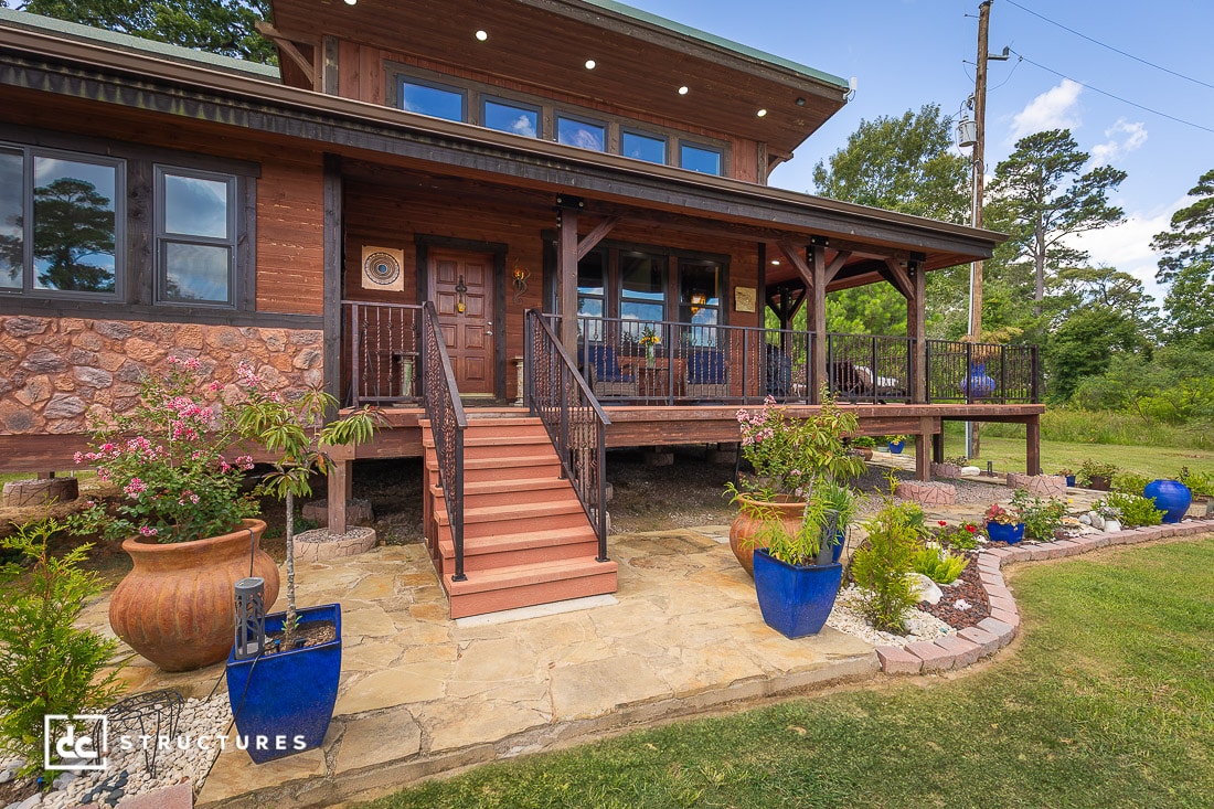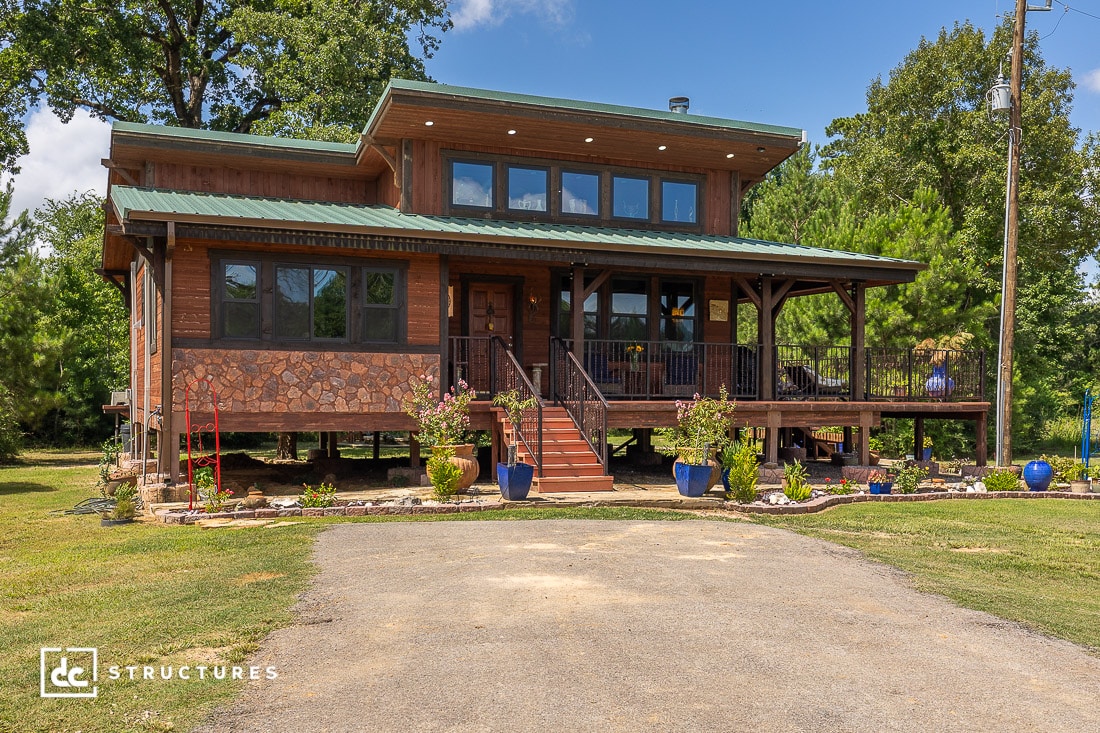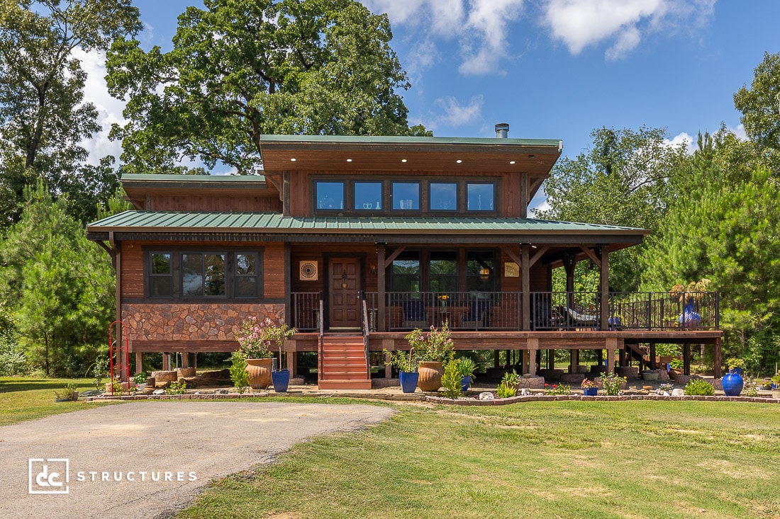 Modeled after our Modern Rogue Cabin Kit, this custom ADU in Magnolia, Texas, offers an interior unlike any other. One of three eclectic cabins on the property, this post and beam structure embraces the timeless appeal of a classic cabin on the outside—while delivering a bold, unexpected twist within.