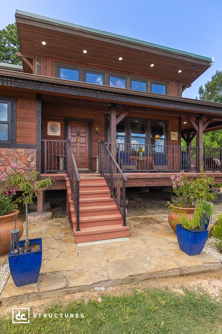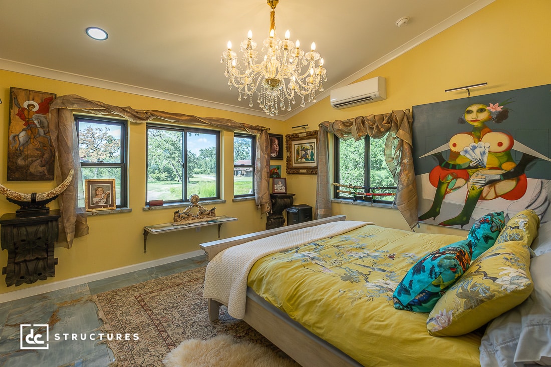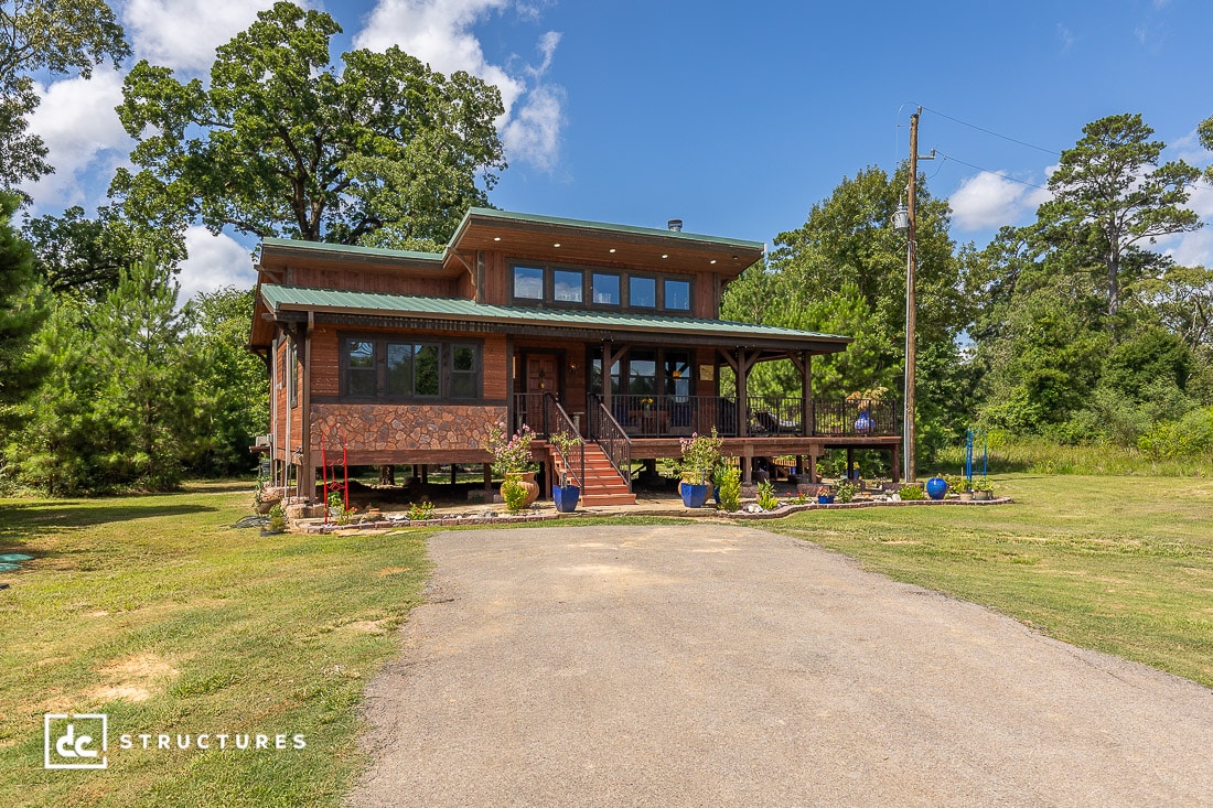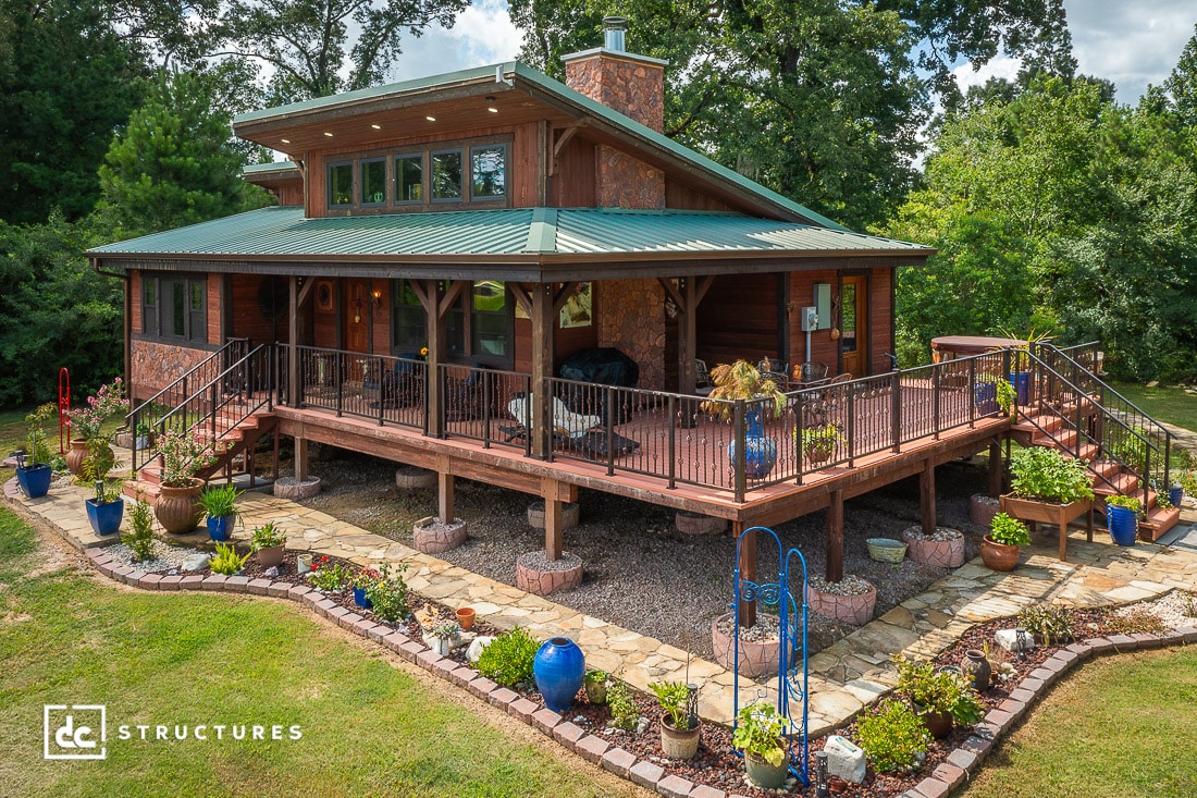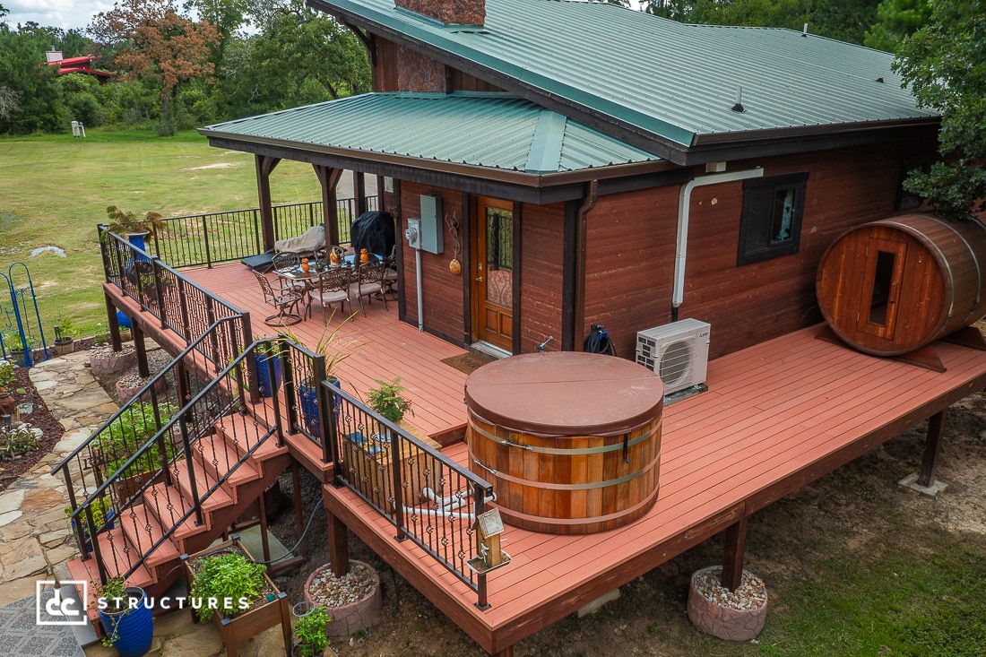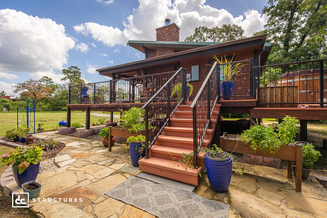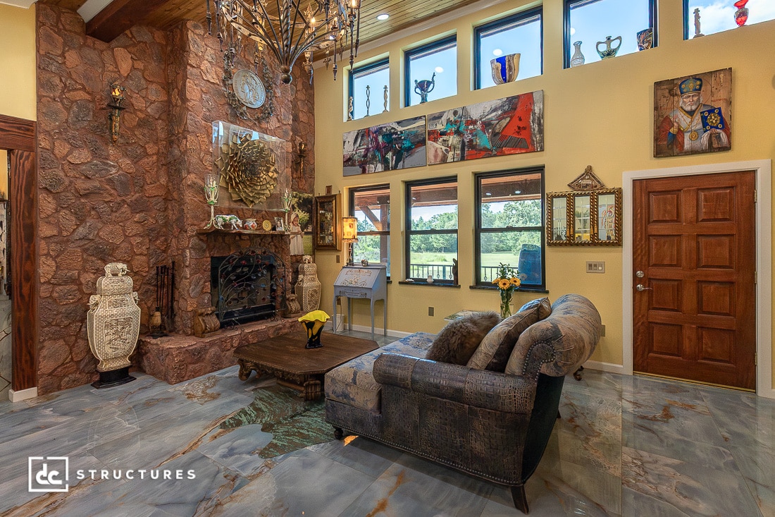 Modeled after our Modern Rogue Cabin Kit, this custom ADU in Magnolia, Texas, offers an interior unlike any other. One of three eclectic cabins on the property, this post and beam structure embraces the timeless appeal of a classic cabin on the outside—while delivering a bold, unexpected twist within.