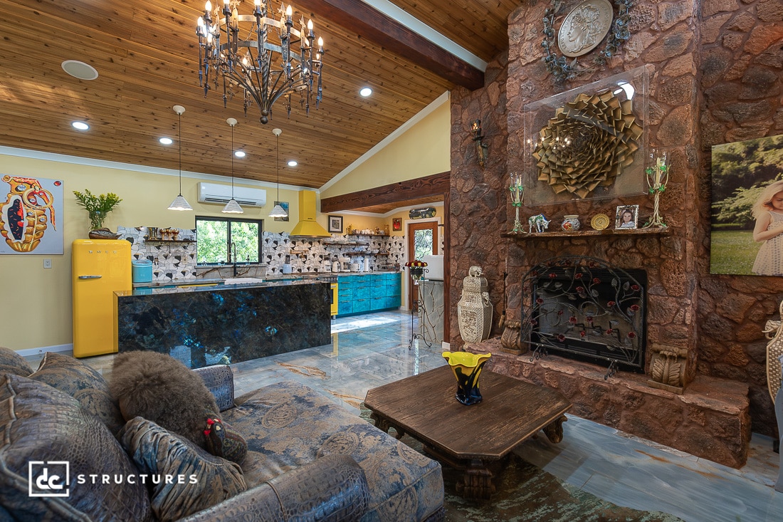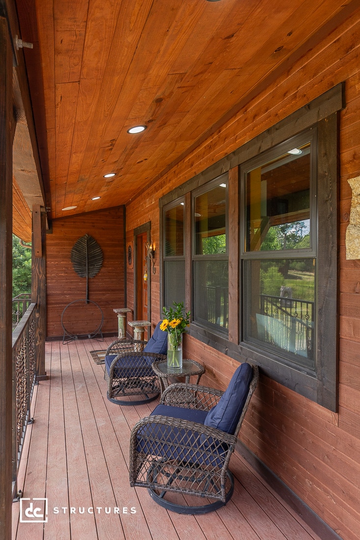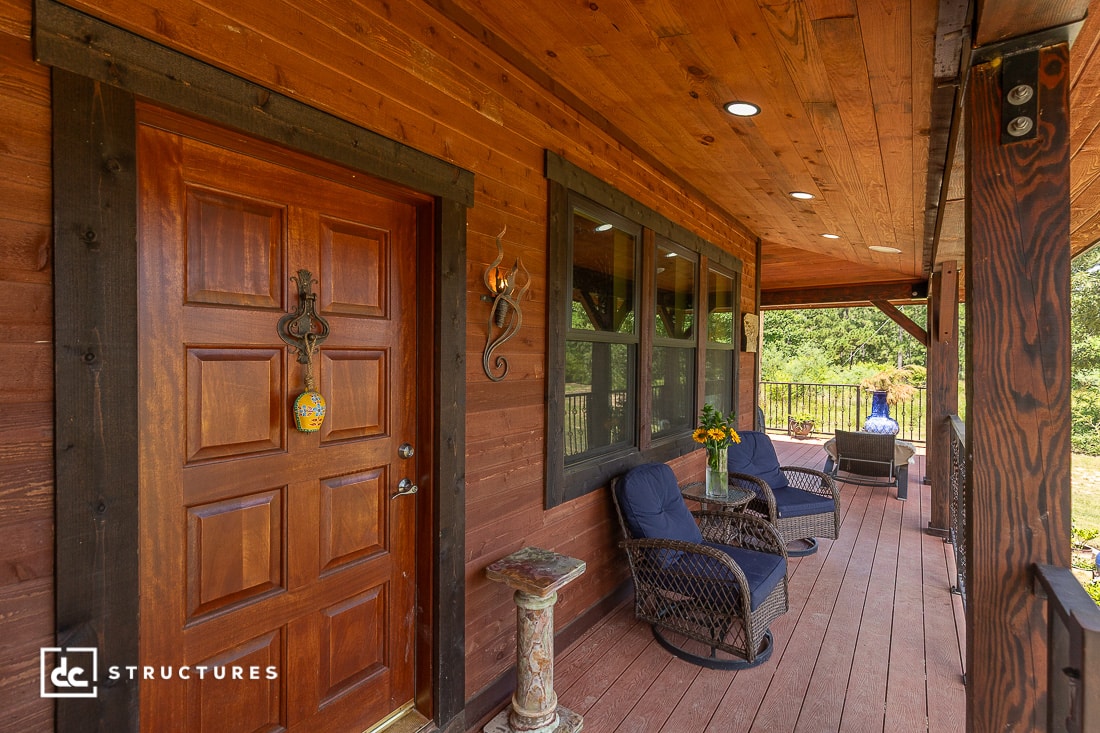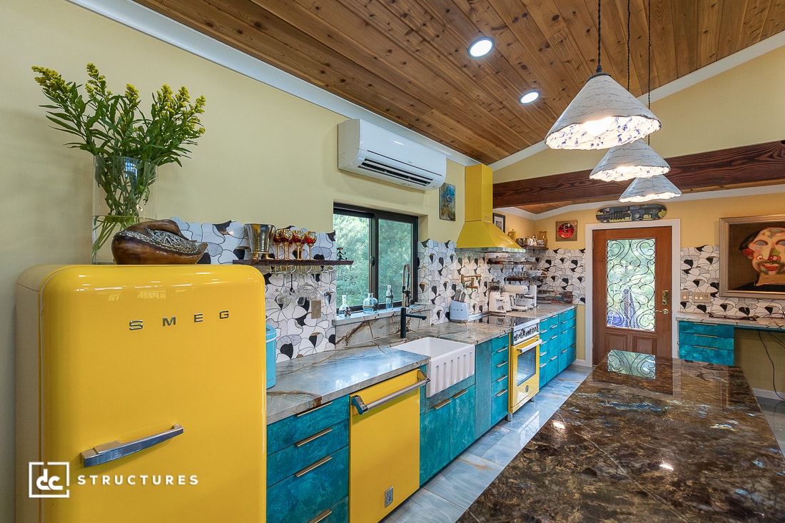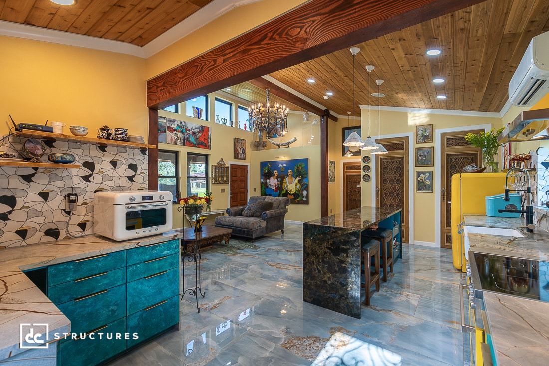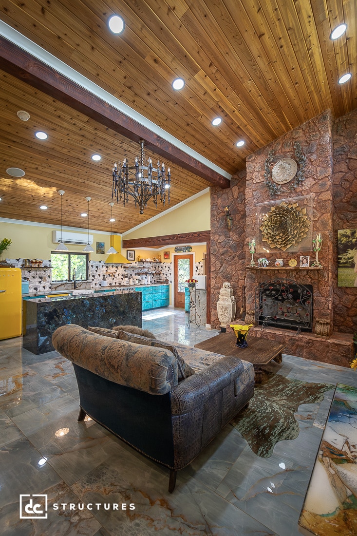 This modern cabin is filled with custom fixtures, finishes, and artistic flourishes, from its show-stopping chandeliers to its vibrant cabinetry and appliances. Like its sister structures, it’s built on a raised foundation and clad in rich, dark walnut-stained cedar siding. Inside, tongue and groove ceilings add warmth and texture, pairing beautifully with the exterior’s rustic elegance. The result is a one-of-a-kind dwelling that fuses rustic charm with modern artistry—perfectly in step with the spirit of the Modern Rogue.