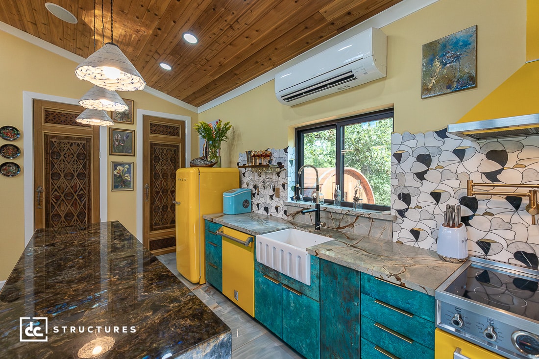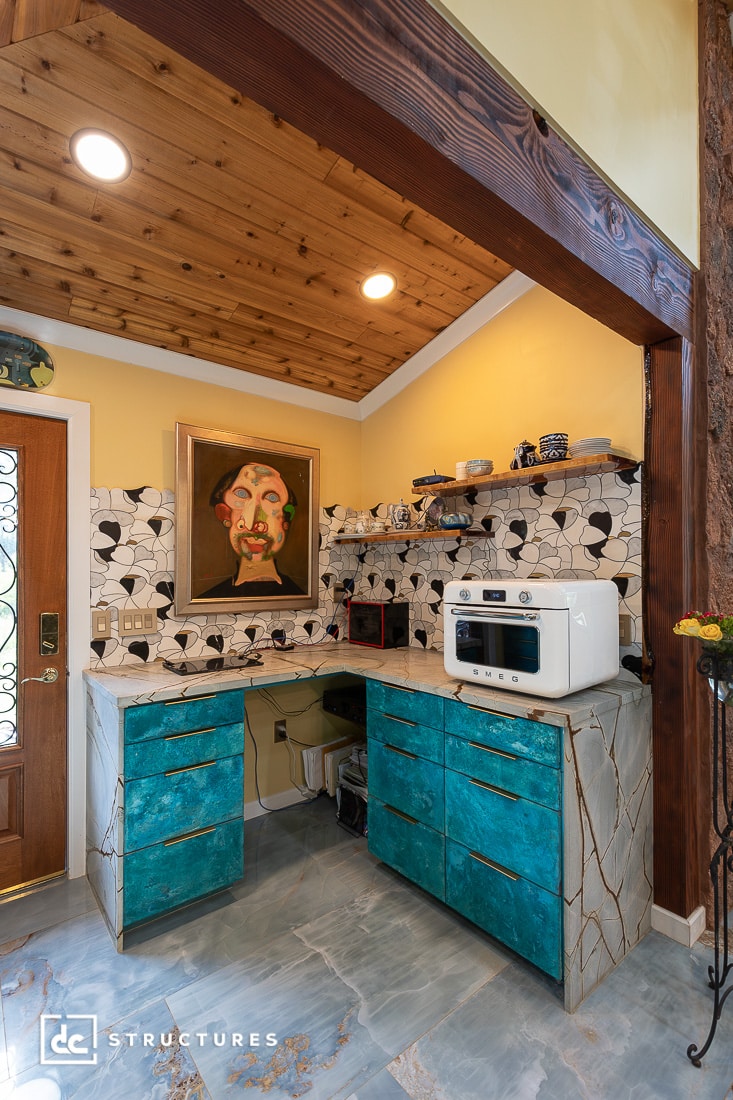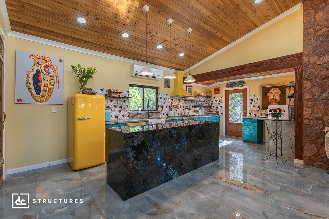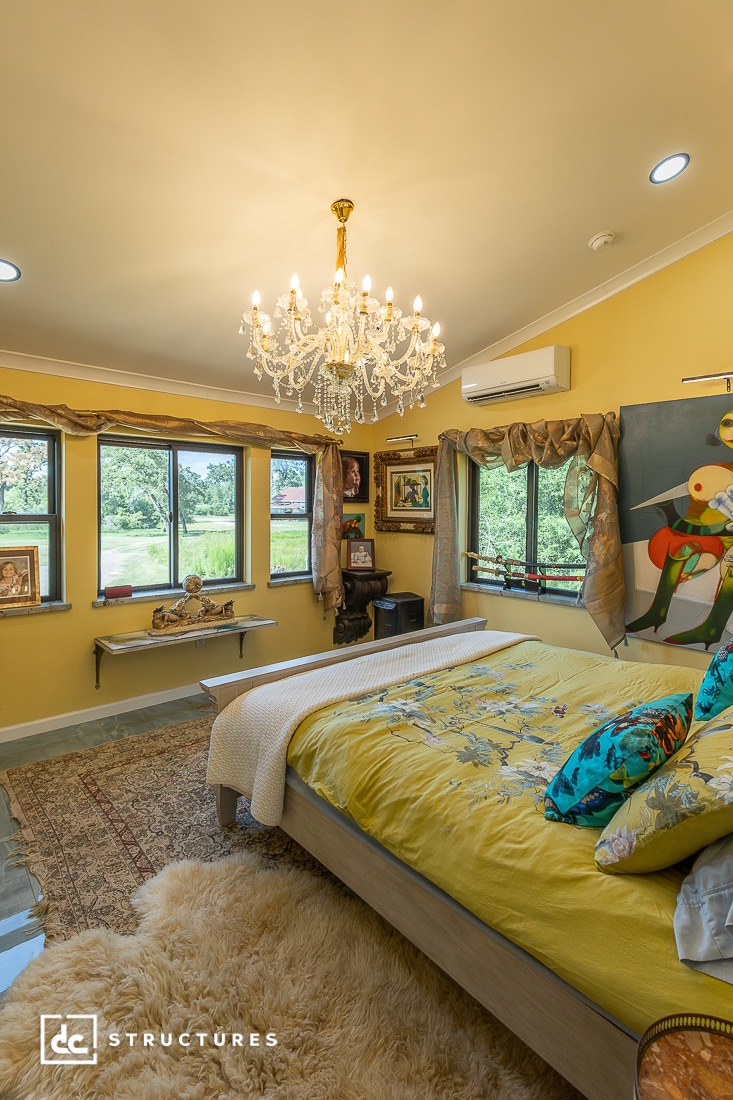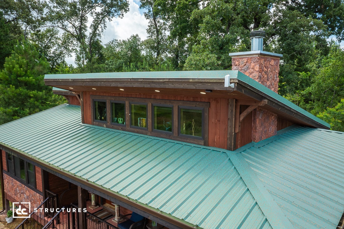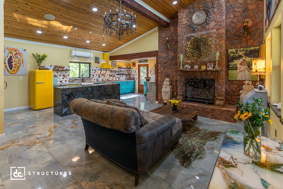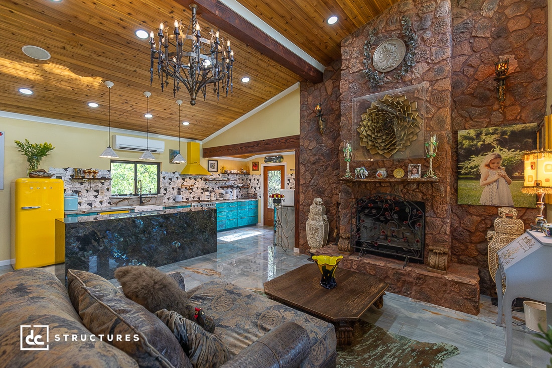 This modern cabin is filled with custom fixtures, finishes, and artistic flourishes, from its show-stopping chandeliers to its vibrant cabinetry and appliances. Like its sister structures, it’s built on a raised foundation and clad in rich, dark walnut-stained cedar siding. Inside, tongue and groove ceilings add warmth and texture, pairing beautifully with the exterior’s rustic elegance. The result is a one-of-a-kind dwelling that fuses rustic charm with modern artistry—perfectly in step with the spirit of the Modern Rogue.