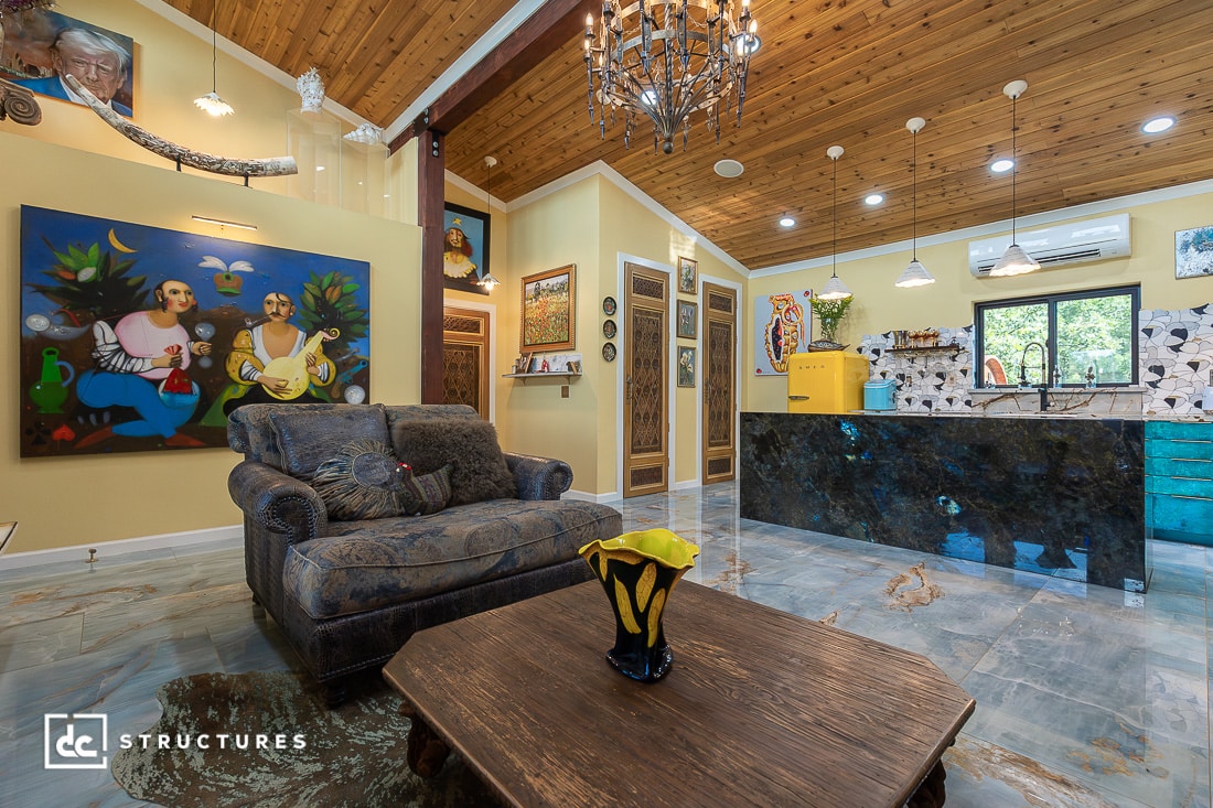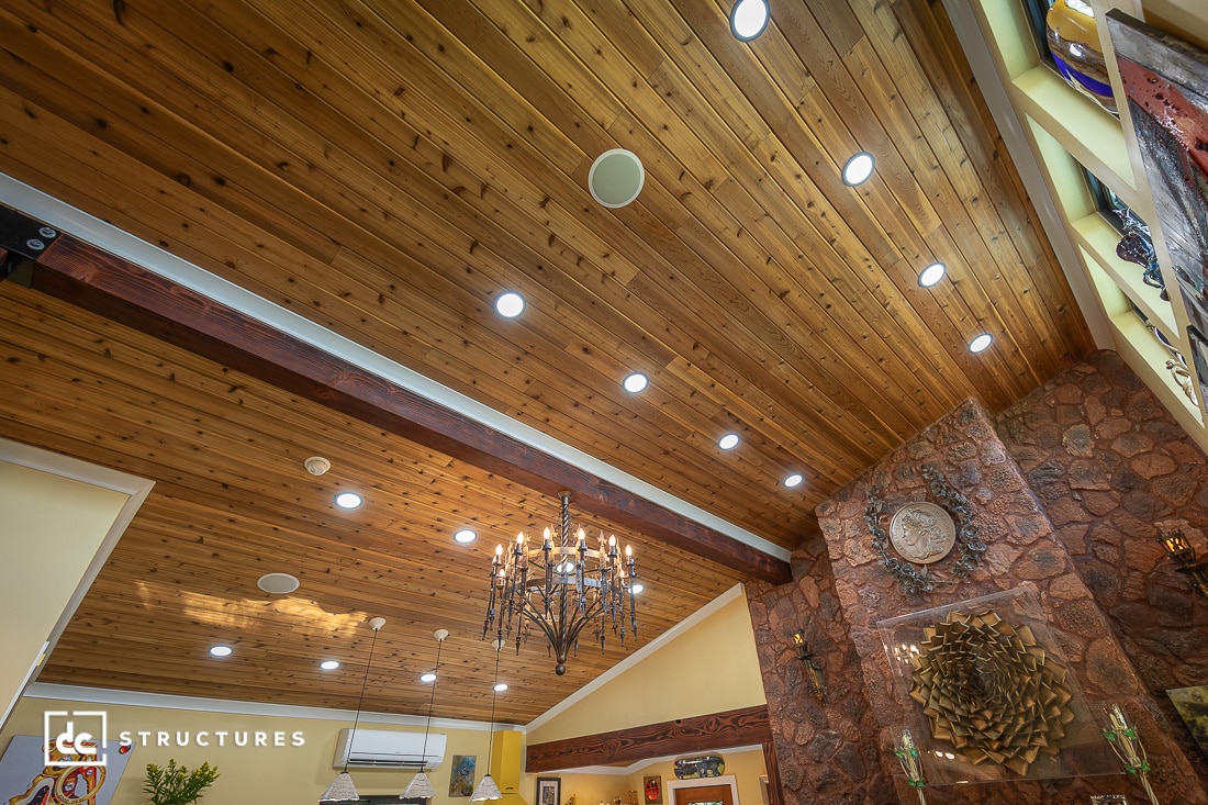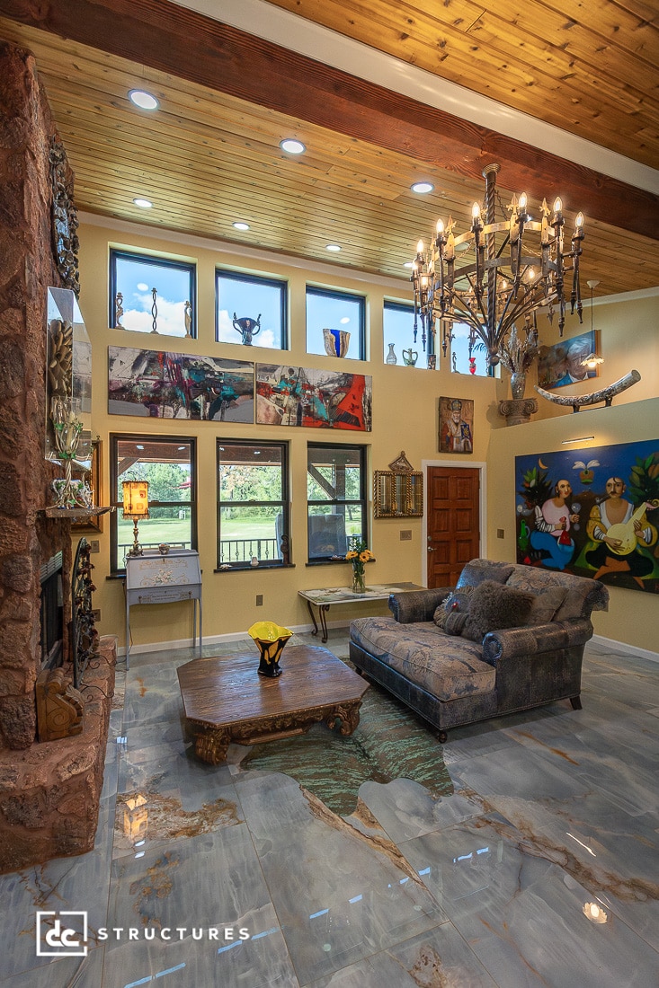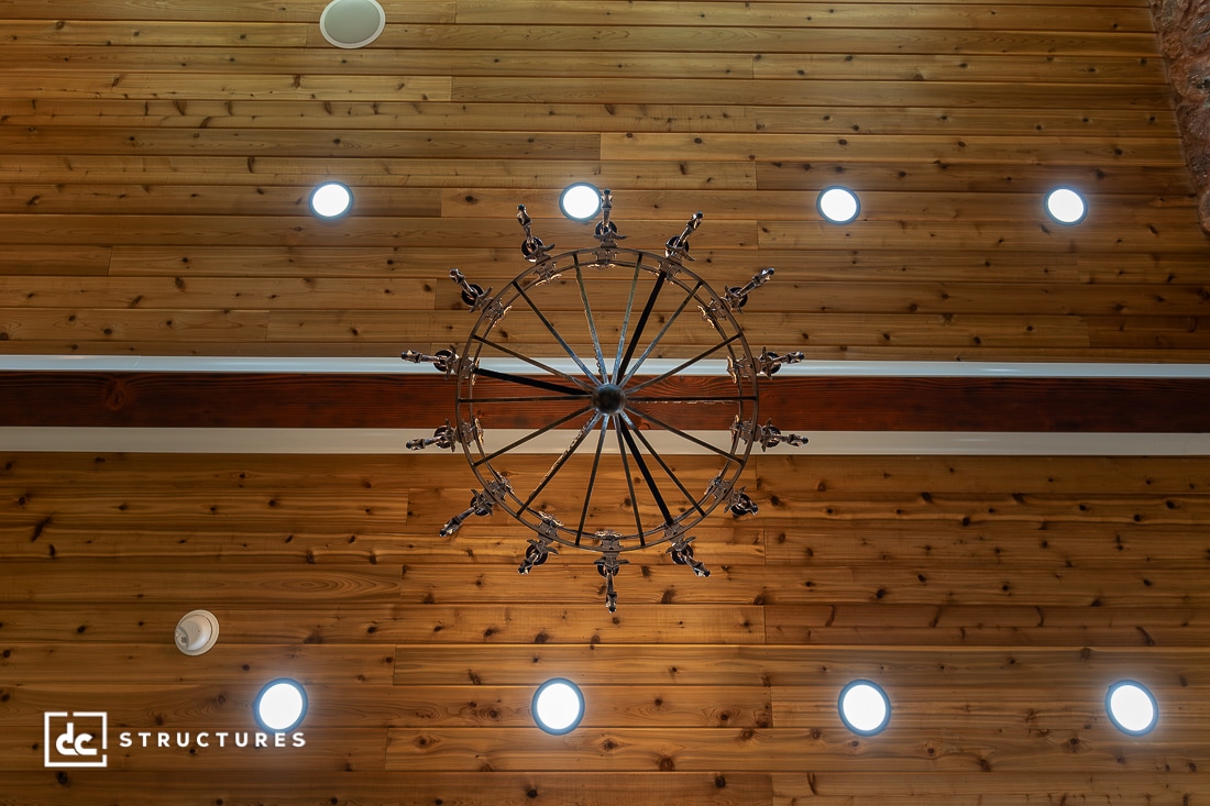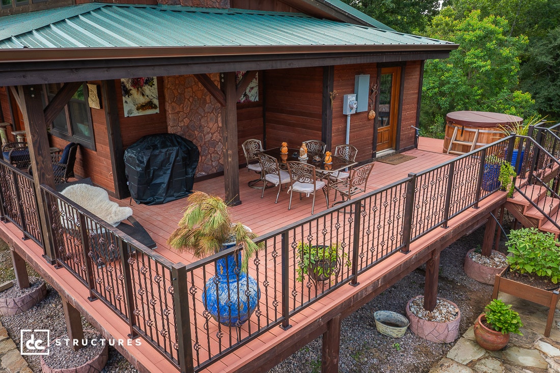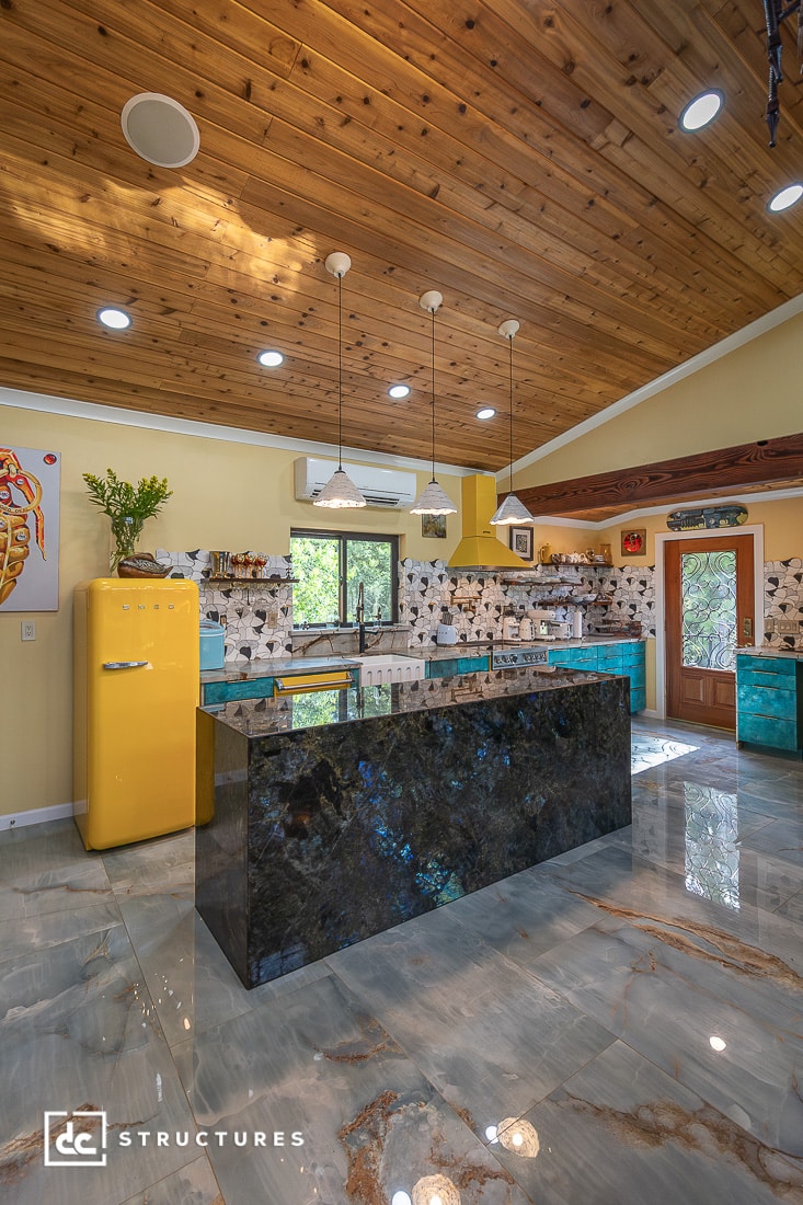 This modern cabin is filled with custom fixtures, finishes, and artistic flourishes, from its show-stopping chandeliers to its vibrant cabinetry and appliances. Like its sister structures, it’s built on a raised foundation and clad in rich, dark walnut-stained cedar siding. Inside, tongue and groove ceilings add warmth and texture, pairing beautifully with the exterior’s rustic elegance. The result is a one-of-a-kind dwelling that fuses rustic charm with modern artistry—perfectly in step with the spirit of the Modern Rogue.