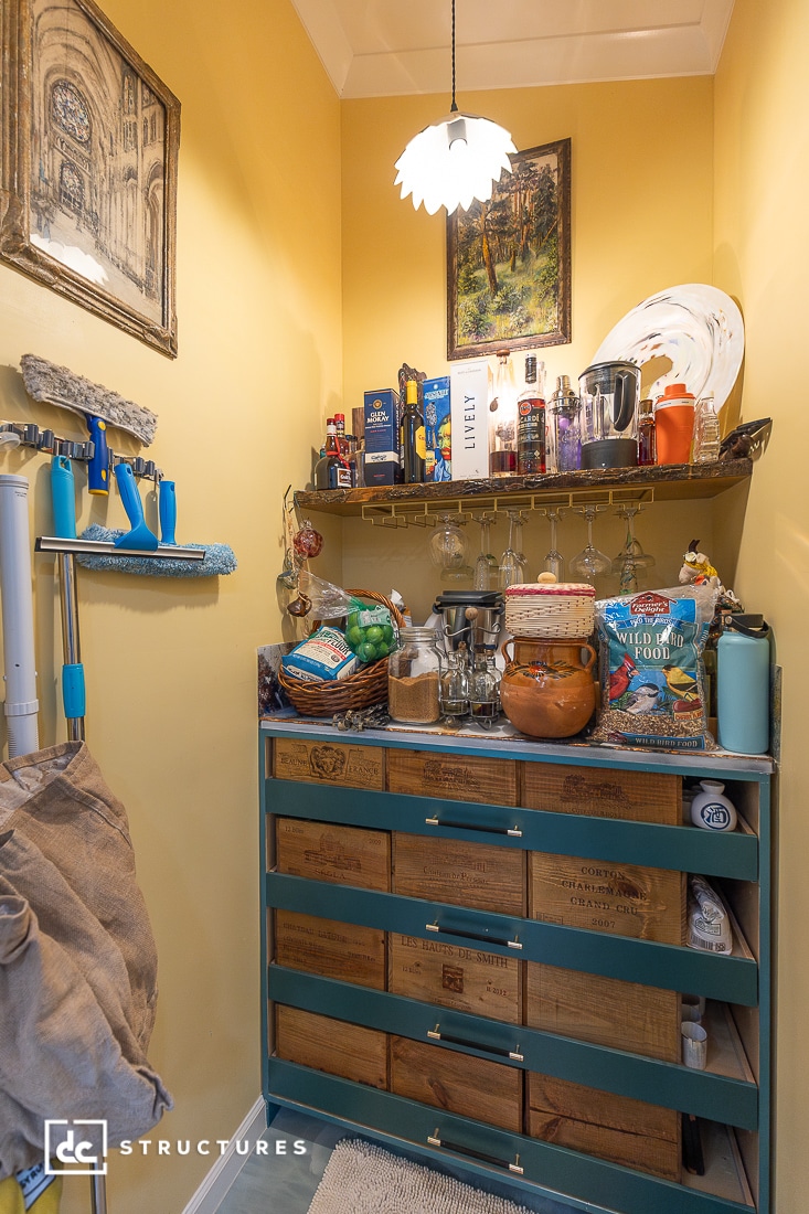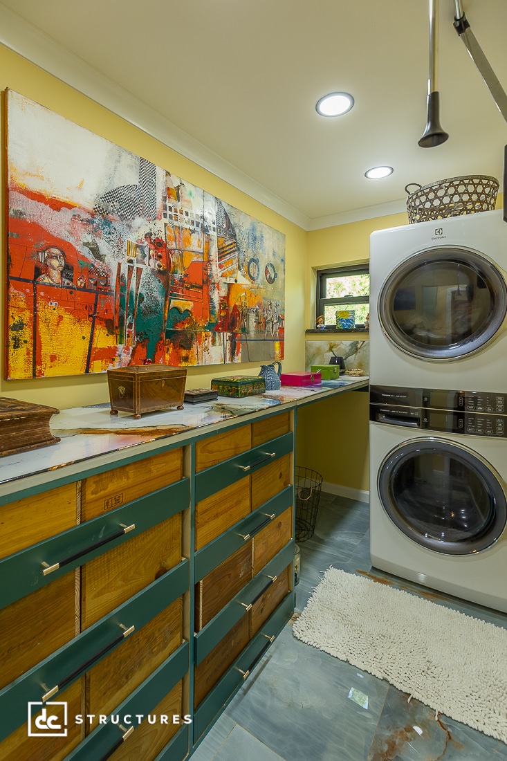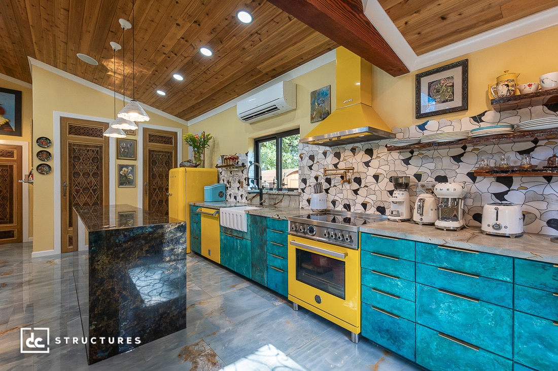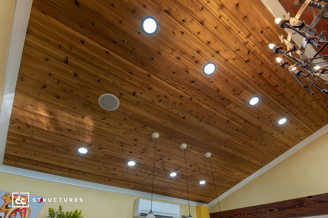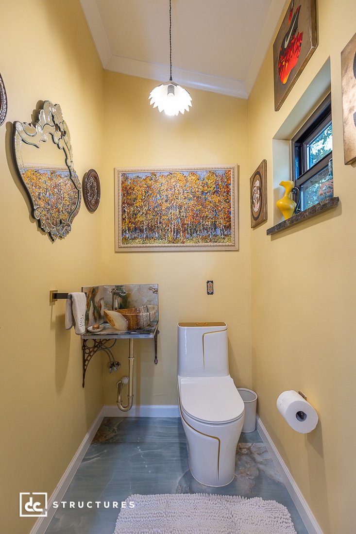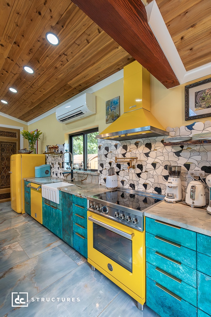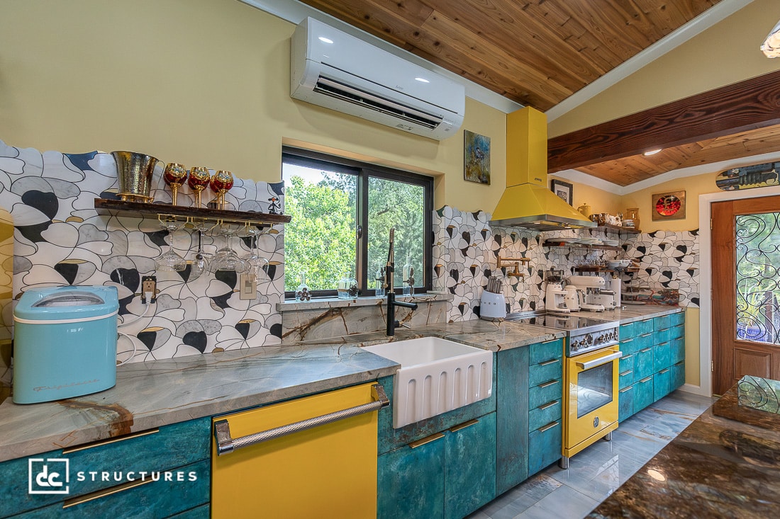 This modern cabin is filled with custom fixtures, finishes, and artistic flourishes, from its show-stopping chandeliers to its vibrant cabinetry and appliances. Like its sister structures, it’s built on a raised foundation and clad in rich, dark walnut-stained cedar siding. Inside, tongue and groove ceilings add warmth and texture, pairing beautifully with the exterior’s rustic elegance. The result is a one-of-a-kind dwelling that fuses rustic charm with modern artistry—perfectly in step with the spirit of the Modern Rogue.
