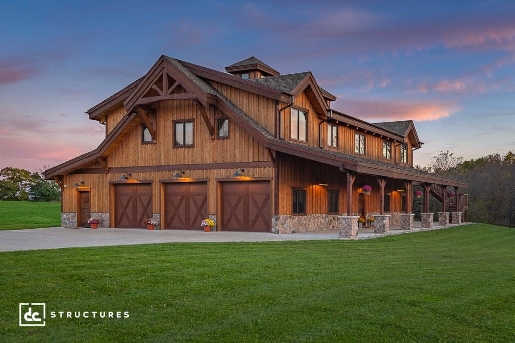 This stately barn-style home is a great example of how our clients can customize their building kits to better suit their needs. These clients started with an Oakridge 60’ Apartment Barn Kit and added a number of upgrades to make it their own, including our heavy timber roof and stair upgrades. On the main level, our clients designed their space with an enclosed shed roof to create extra room for storage. Upstairs, they decided to extend the deck by 294 square feet, along with adding a heavy timber deck cover and exterior staircase. These clients also opted for two 36″ x 36″ windowed cupolas instead of one, thus enhancing the natural light in their home.