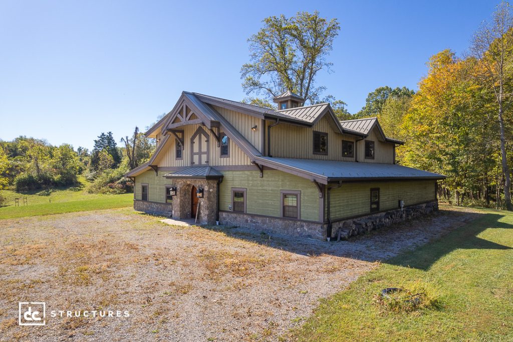 This quaint barn and gift shop in Cleves, Ohio, features a lightly modified design that mostly stays true to our original Oakridge model, save for a few enhancements. With the help of our designers, this client tweaked several aspects of our Oakridge 60′ kit to create their desired barn structure. These alternations include removing the standard 144 sq. ft. deck, enclosing the shed roof, adding another enclosed shed roof, and adding a garage to the main level. For their exterior, they also decided to incorporate a stone entryway with arch-top double doors, a faux hayloft door, and a large king post truss as part of the storefront. Additionally, its two-tone siding and blend of stone and wood textures add dimension to the exterior, making it feel whimsical and homey inside and out.