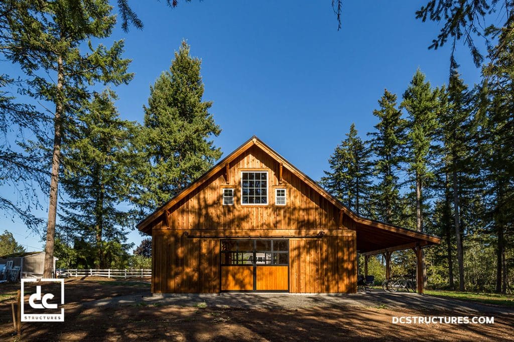 This adorable post and beam structure is a fun and adaptable building design that doubles as a backyard party barn and workshop. Inside, Douglas fir tongue and groove wall coverings, exposed heavy timber members, and high ceilings take center stage, while an upstairs loft offers a functional space for storage or an office. We outfitted this barn with a custom bar area and a heavy timber staircase to complement its all-wood features. Structural modifications to the original model include removing the standard shed dormers to create a gable roof, reconfiguring the upstairs space to serve as an open-ended loft, and adding beautiful gridded windows and French-style hinged patio doors to the design.