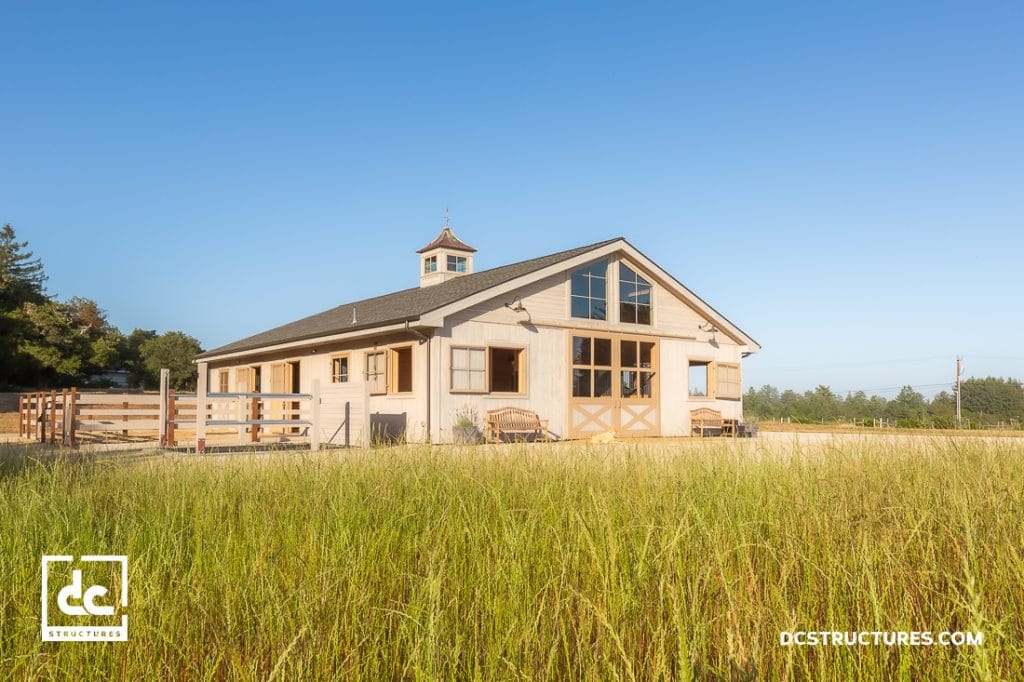 This bright and beautiful horse barn and workshop in Santa Cruz, California, was crafted from a modified Columbia Horse Barn Kit. Large angular windows on the gable sides fill the building with natural light, illuminating our Douglas fir timbers inside the barn. Four horse stalls outfitted with Classic Equine stall fronts, a feed stall, a tack room, two grooming stalls, and a 24′ x 14′ workshop round out this single-story structure. Outside, an 8′ x 12′ entry portico adds unique visual interest.