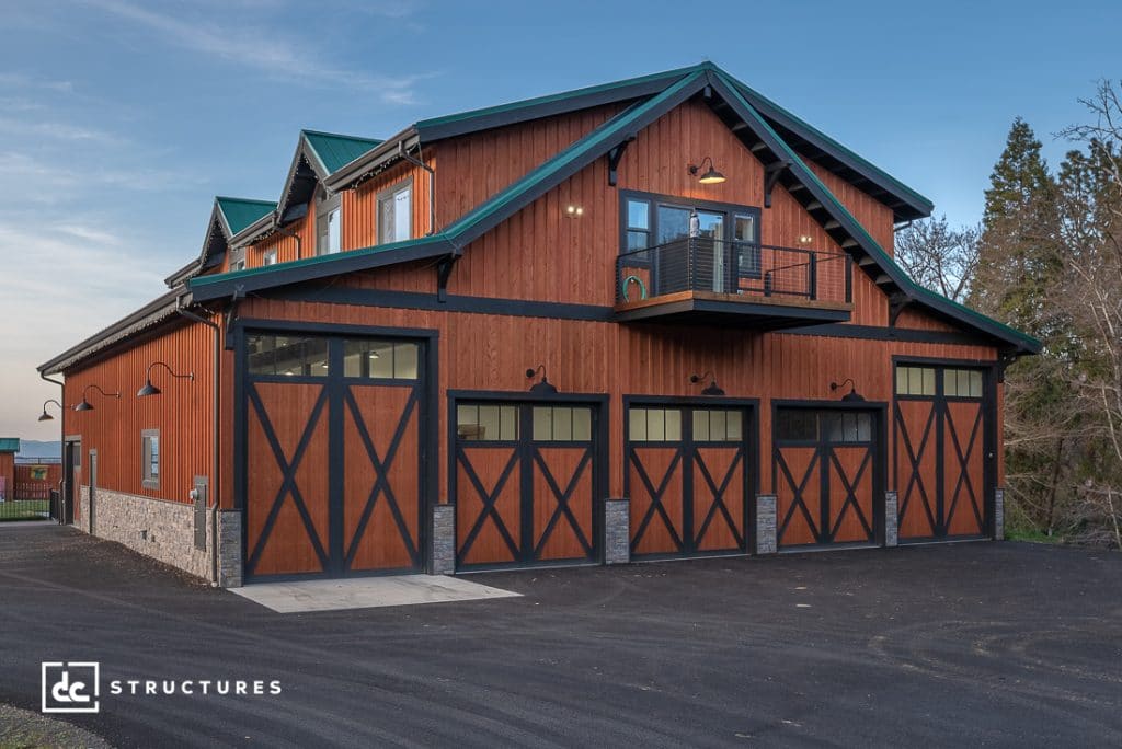 Modified from our Oakridge 60’ Apartment Barn Kit, this stately barn home in Medford, Oregon is the perfect blend of style and function. The first floor is almost entirely dedicated to a large RV garage and shop area, save for a spacious foyer with a small bar and half bathroom on the opposite end. Outside the foyer, a custom 432 sq. ft. portico with a decorative timber truss serves as both a covered entryway and outdoor entertainment area. There’s also a large double-sided fireplace that our clients can utilize in both their entry and portico.